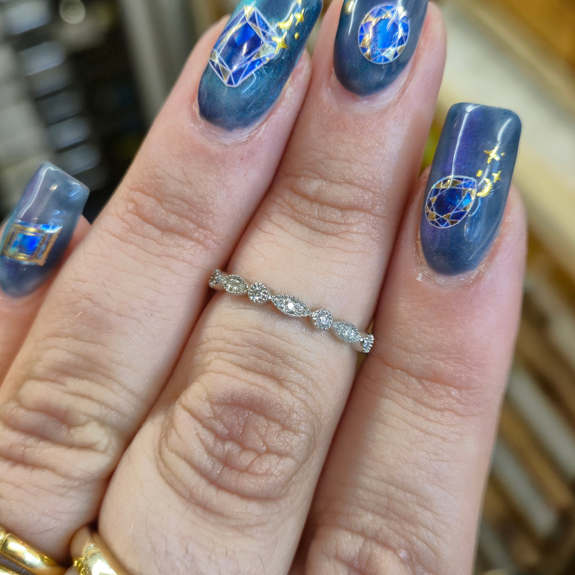 The band of this ring is the elegant arrangement of multiple small round brilliant-cut diamonds set across the top half of the band, creating a half eternity style. The setting is distinctive, featuring panels alternating between round settings and horizontally oriented marquise-shapes. This fancy arrangement gives the ring a vintage or Art Deco feel and provides a continuous line of contrasting sparkle and texture. The alternating panels create a visually intriguing design that is more intricate than a standard eternity band.