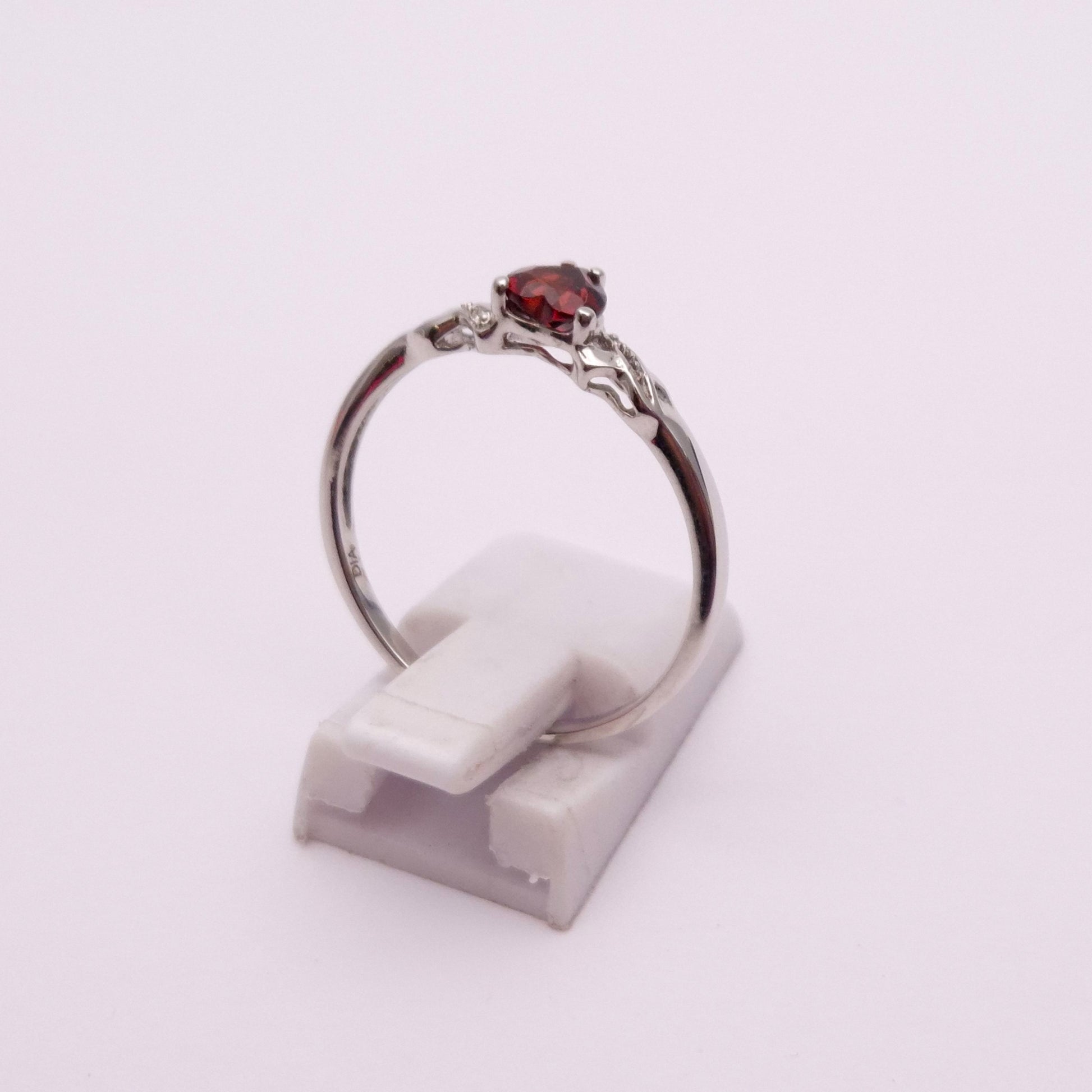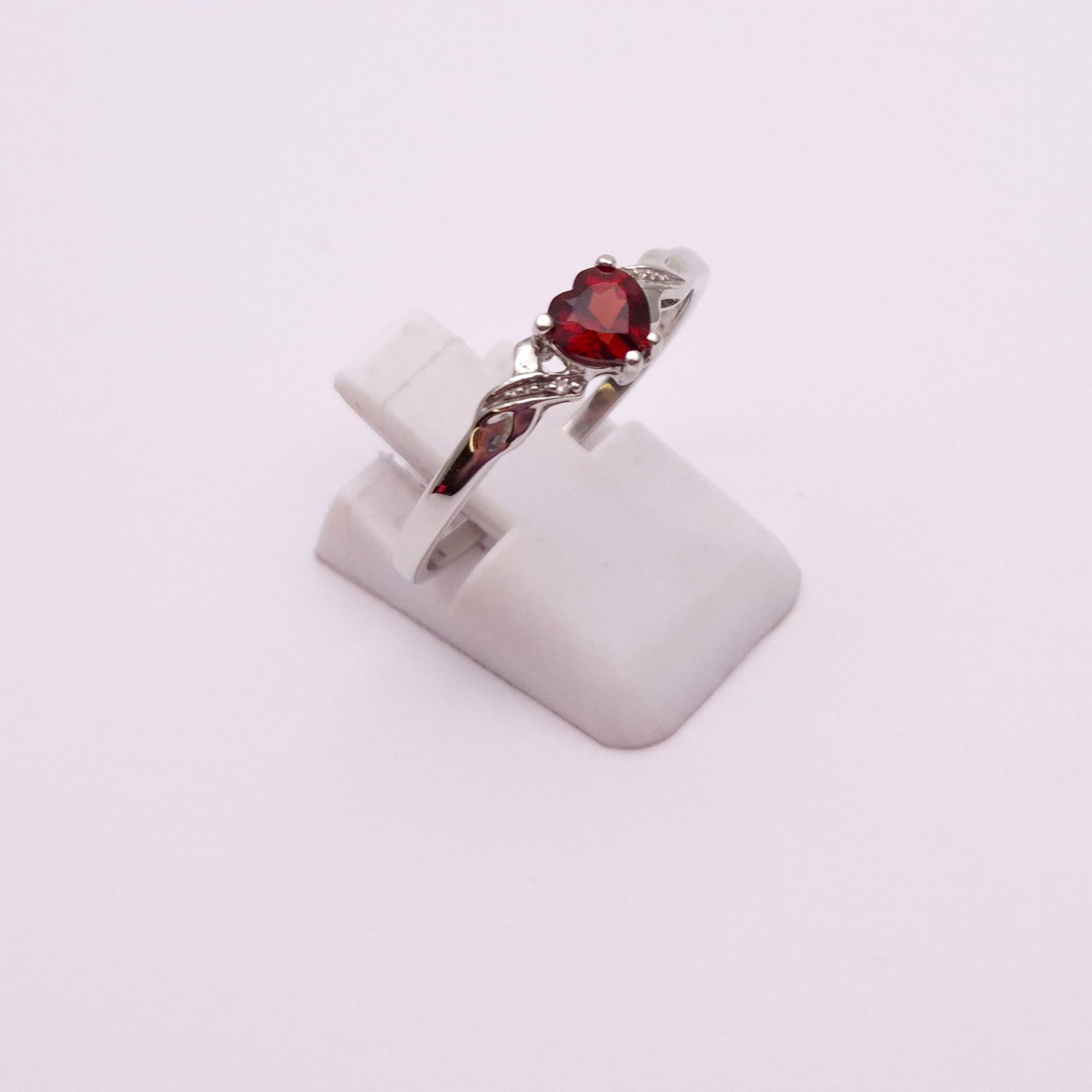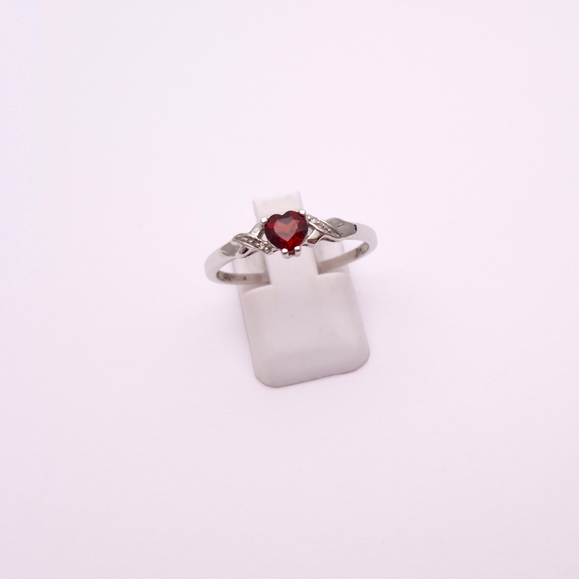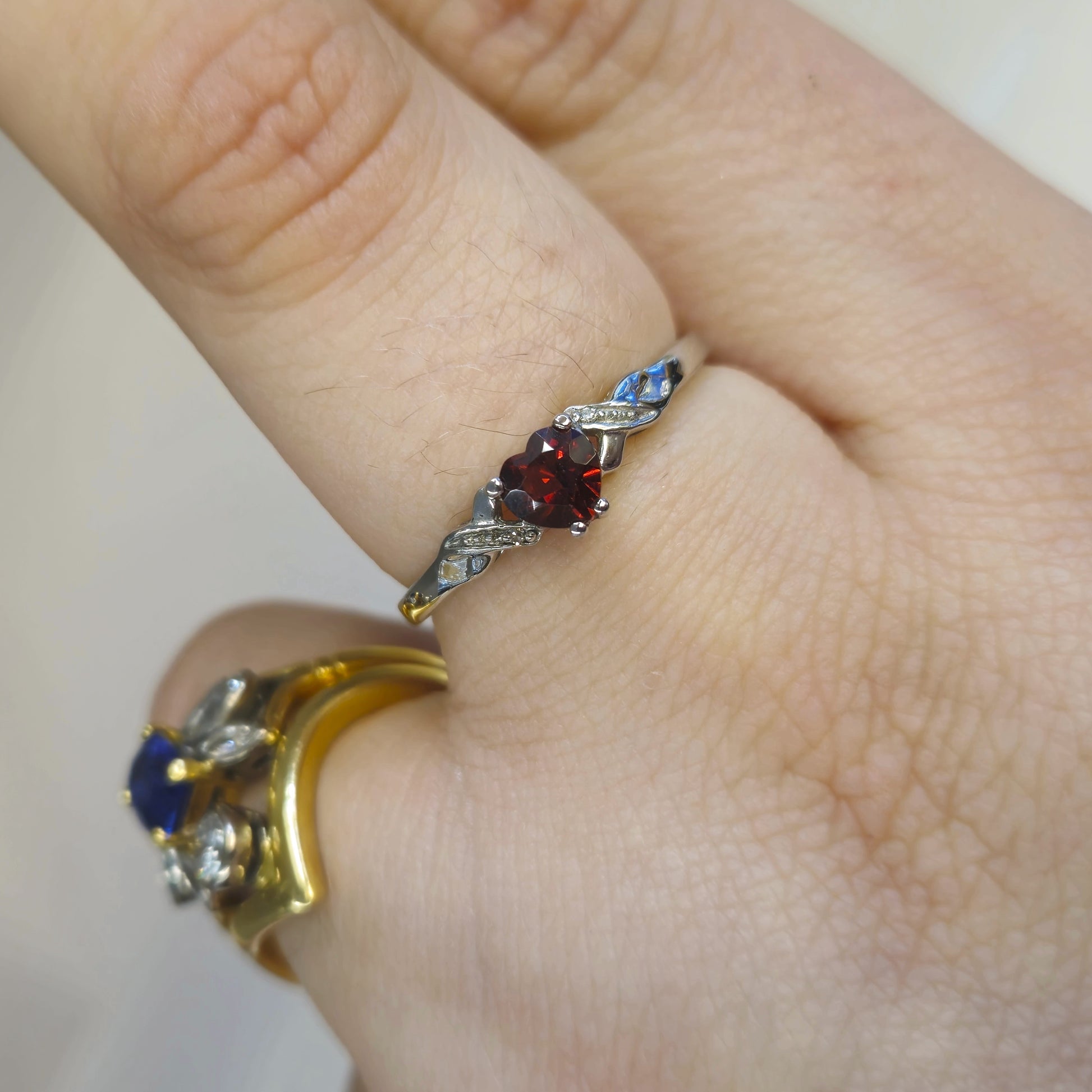 This simple pretty ring is made form 9ct white gold and is a simple design with a heart cut deep red garnet stone set to the centre with cut our crossover shoulders which are set with a small round cut diamond to each side.