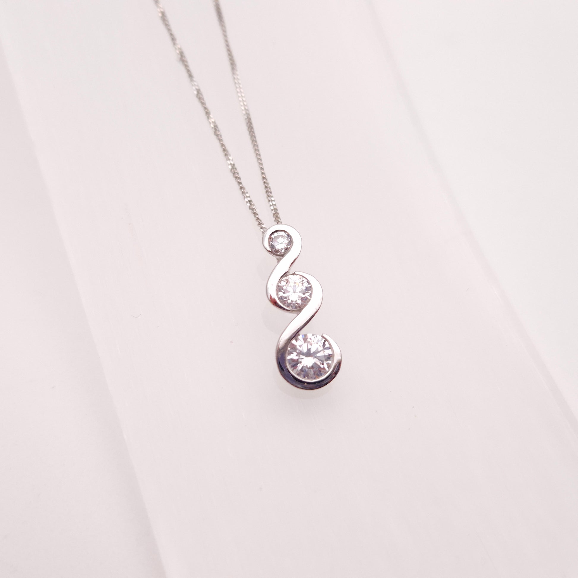 The pendant features a striking Three Stone design arranged in a vertical S-curve or flowing wave motif. Three dazzling round brilliant-cut Cubic Zirconia (CZ) stones are securely set along this curve. The stones are graduated in size, with the largest CZ stone at the bottom and the smallest at the top, creating a lovely tapering effect that draws the eye downward.