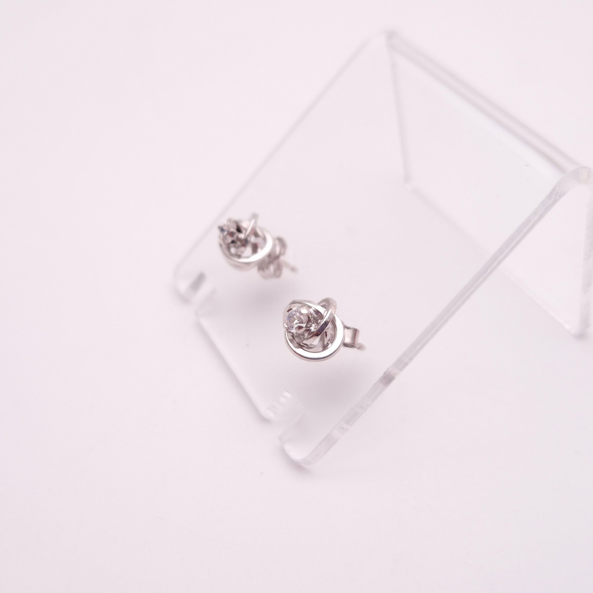 Each earring features a single, bright round brilliant-cut Cubic Zirconia (CZ) stone, delivering maximum fire and shine, perfectly mimicking the look of a diamond. The CZ stone is securely nestled within a graceful swirly knot or love knot framework. The white gold gently loops and curves around the stone, creating a continuous, lightweight, and three-dimensional appearance that symbolizes unity and elegance.