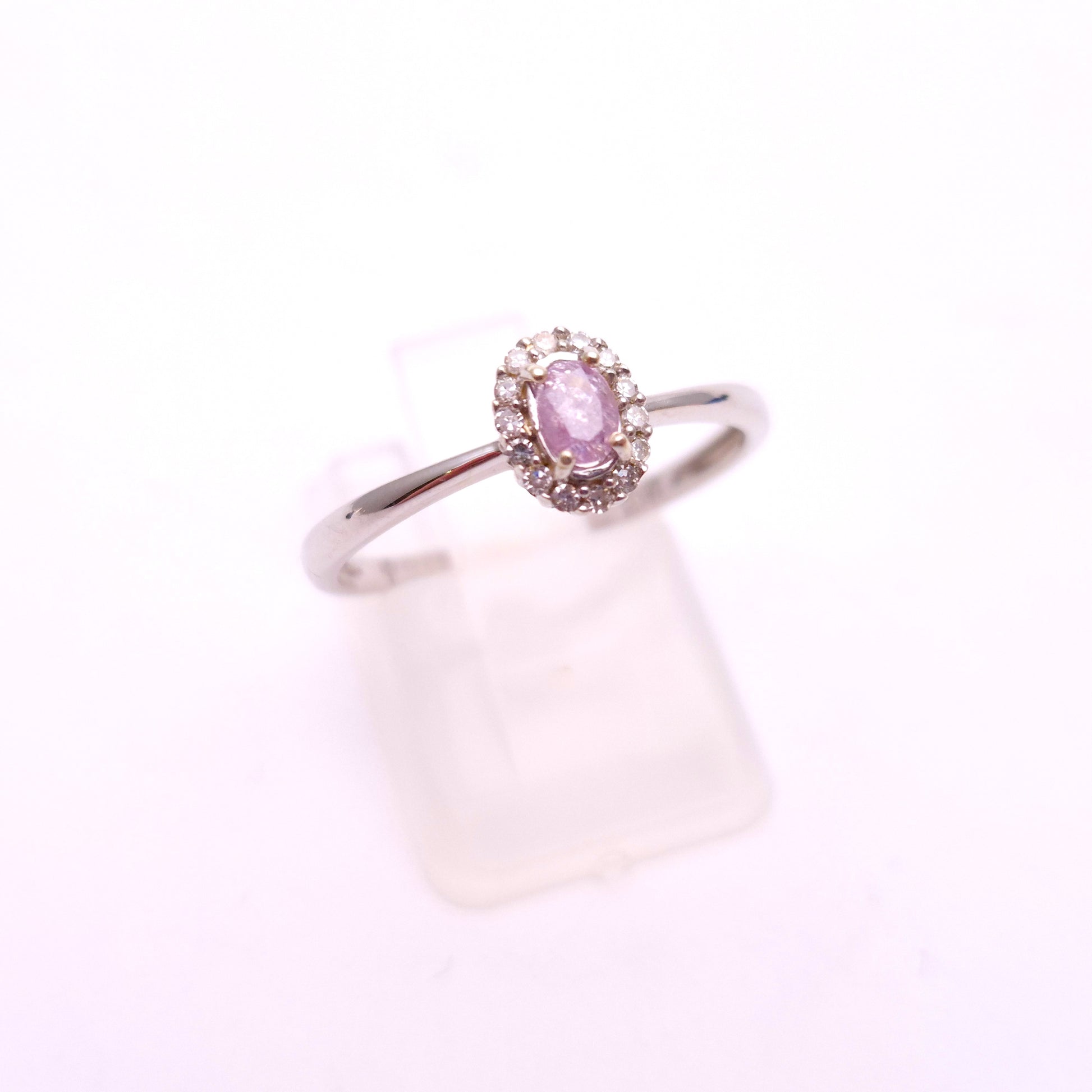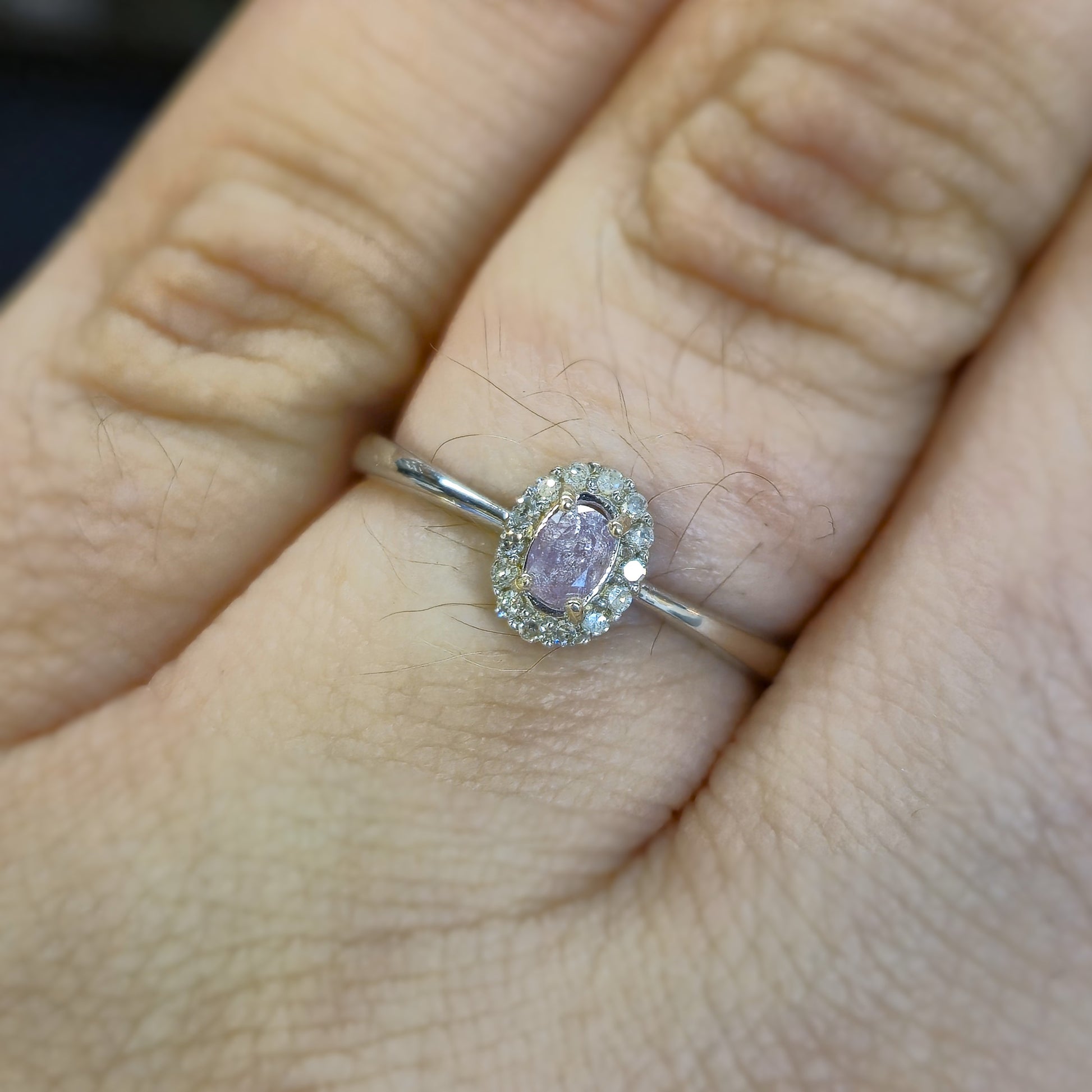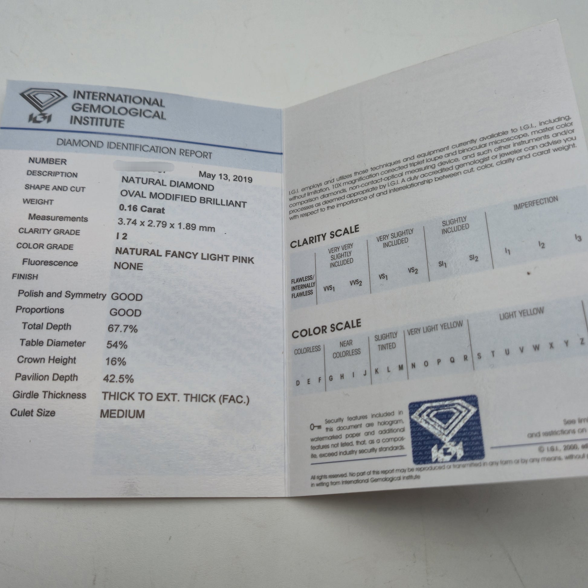 This exquisite ring is a testament to delicate beauty, featuring a rare and captivating pink diamond at its heart, certified by IGI. The central oval pink diamond is surrounded by a dazzling halo of brilliant white diamonds, amplifying its subtle colour and enhancing its overall sparkle.