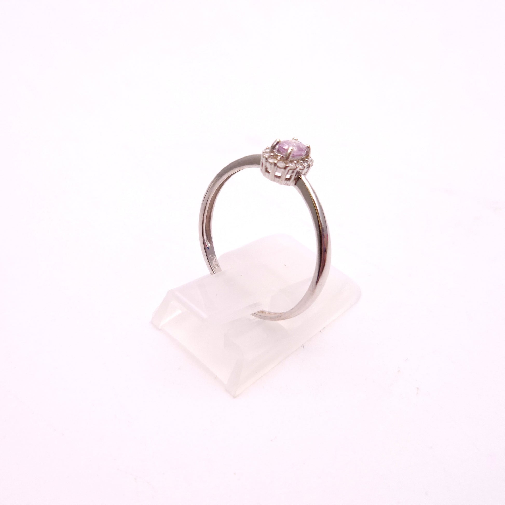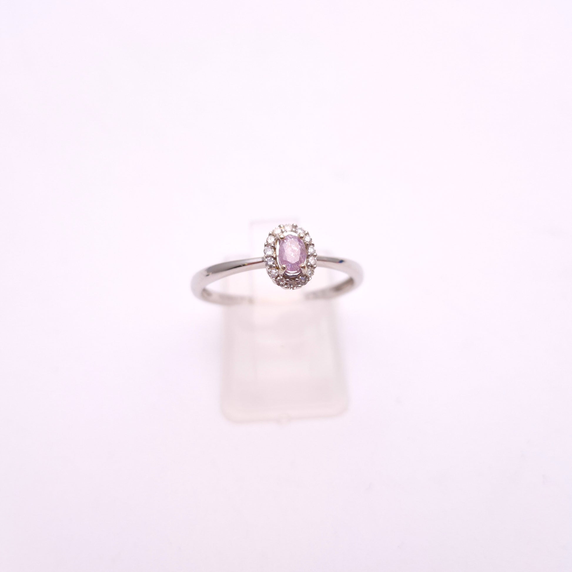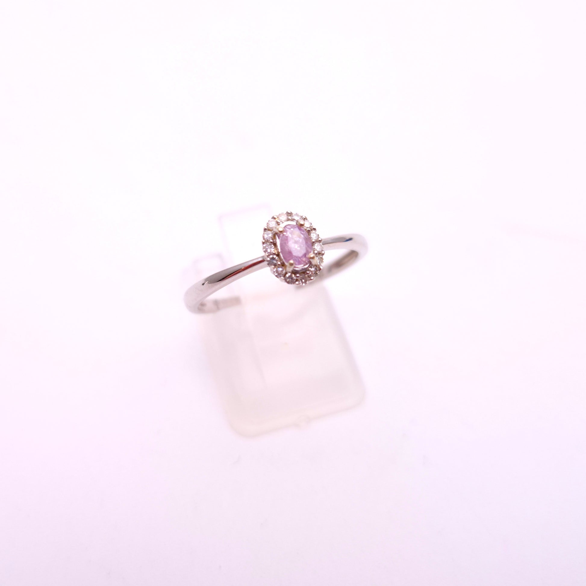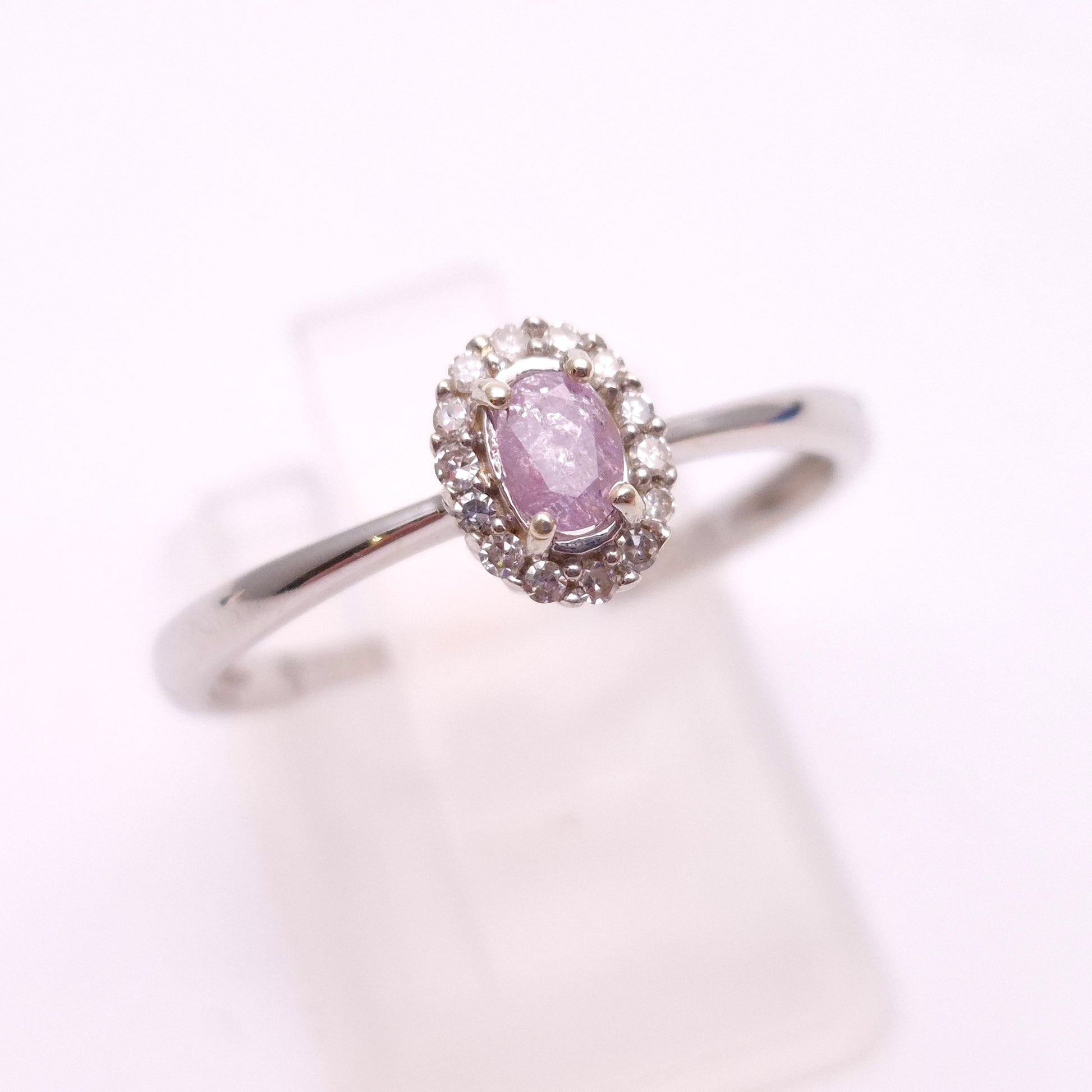 This exquisite ring is a testament to delicate beauty, featuring a rare and captivating pink diamond at its heart, certified by IGI. The central oval pink diamond is surrounded by a dazzling halo of brilliant white diamonds, amplifying its subtle colour and enhancing its overall sparkle.