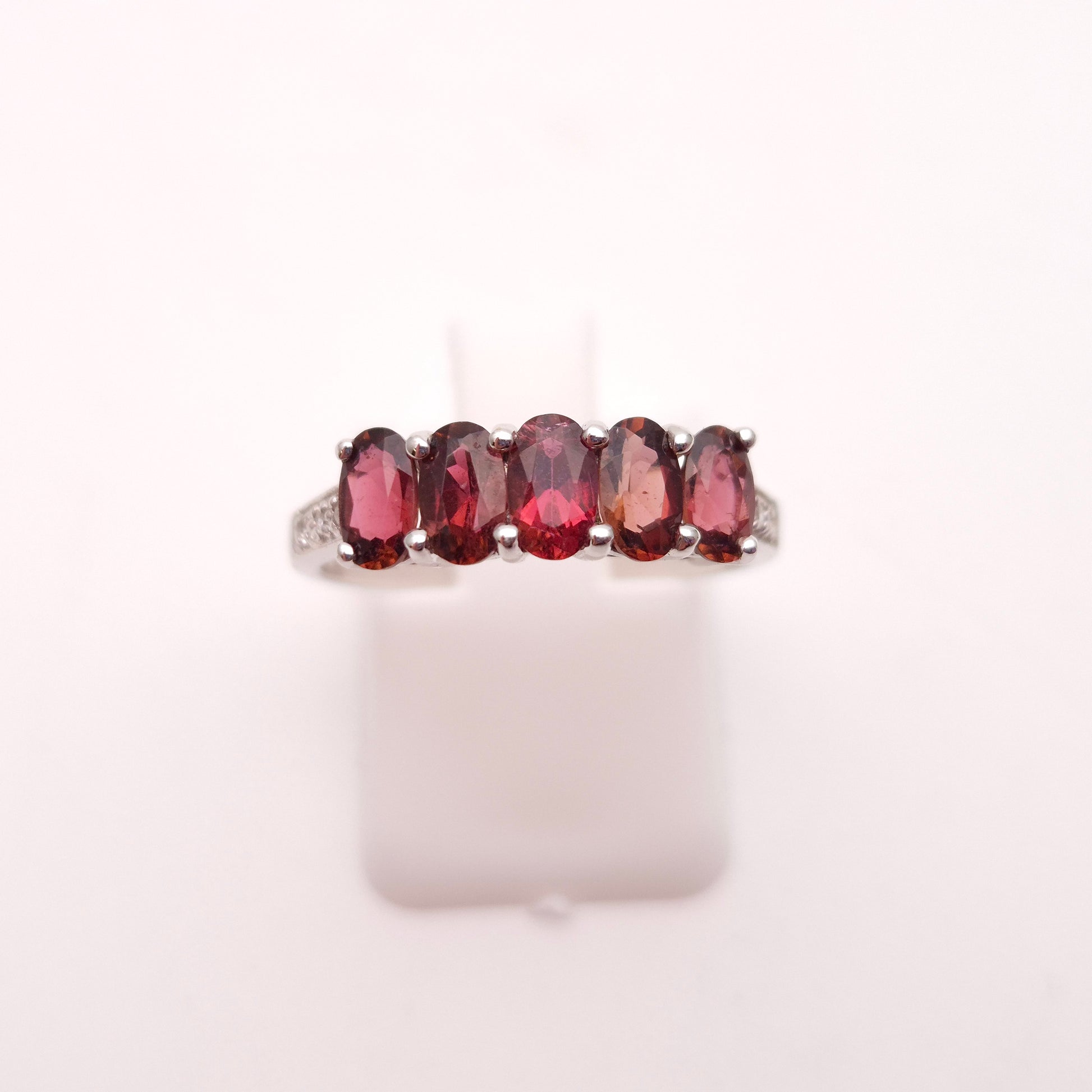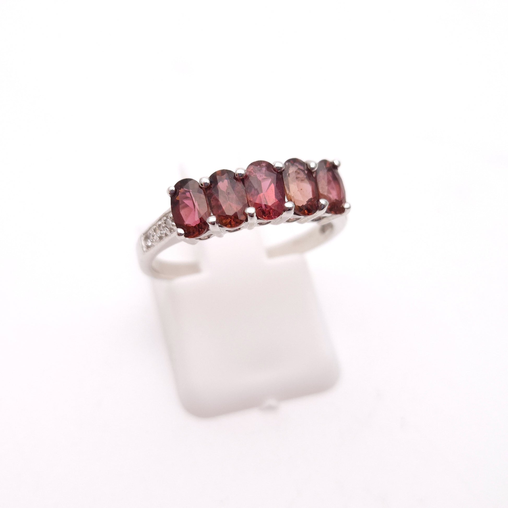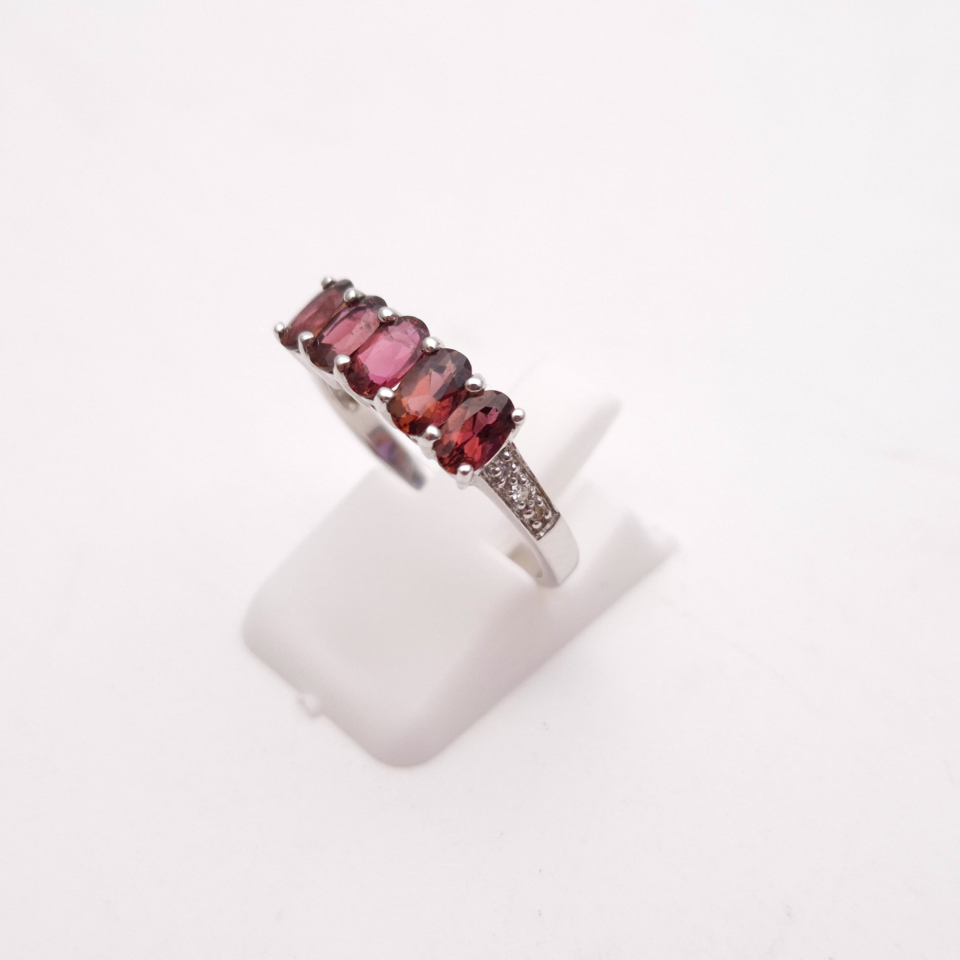 This stunning ring features a row of five oval-cut pink tourmalines, set in cool 9ct white gold, offering a beautiful and vibrant display of colour.