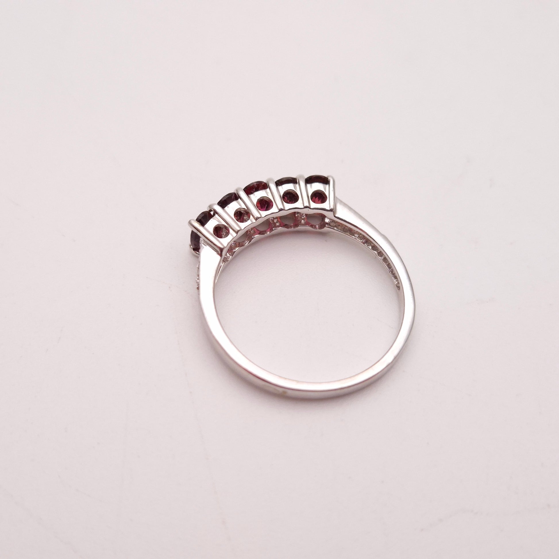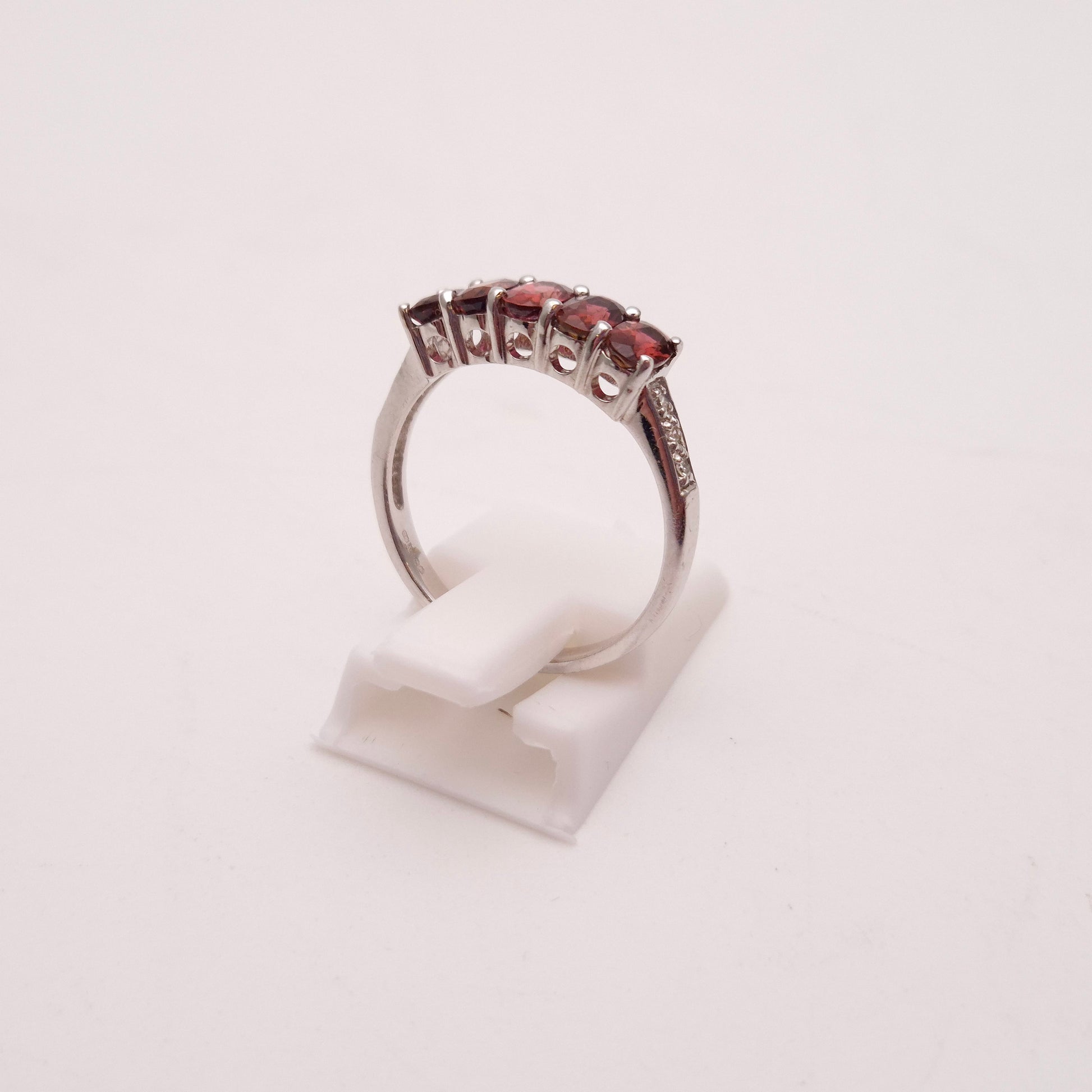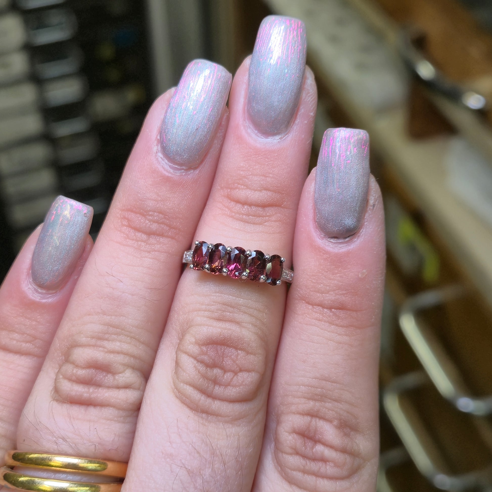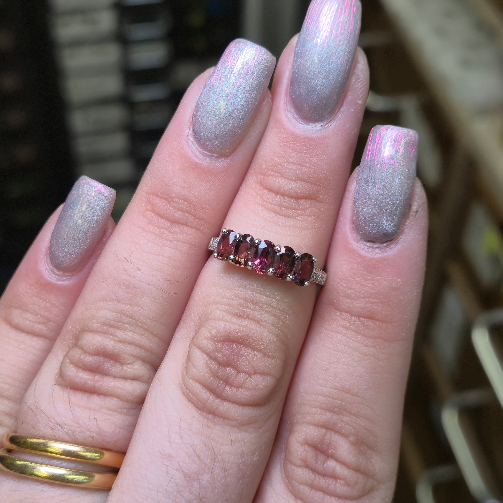 This stunning ring features a row of five oval-cut pink tourmalines, set in cool 9ct white gold, offering a beautiful and vibrant display of colour.