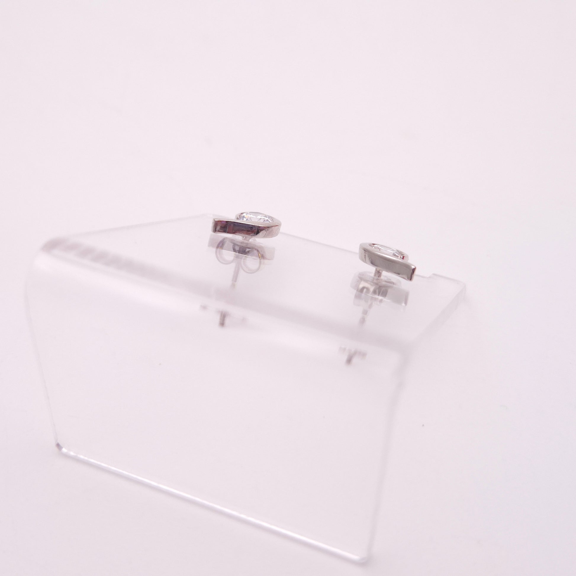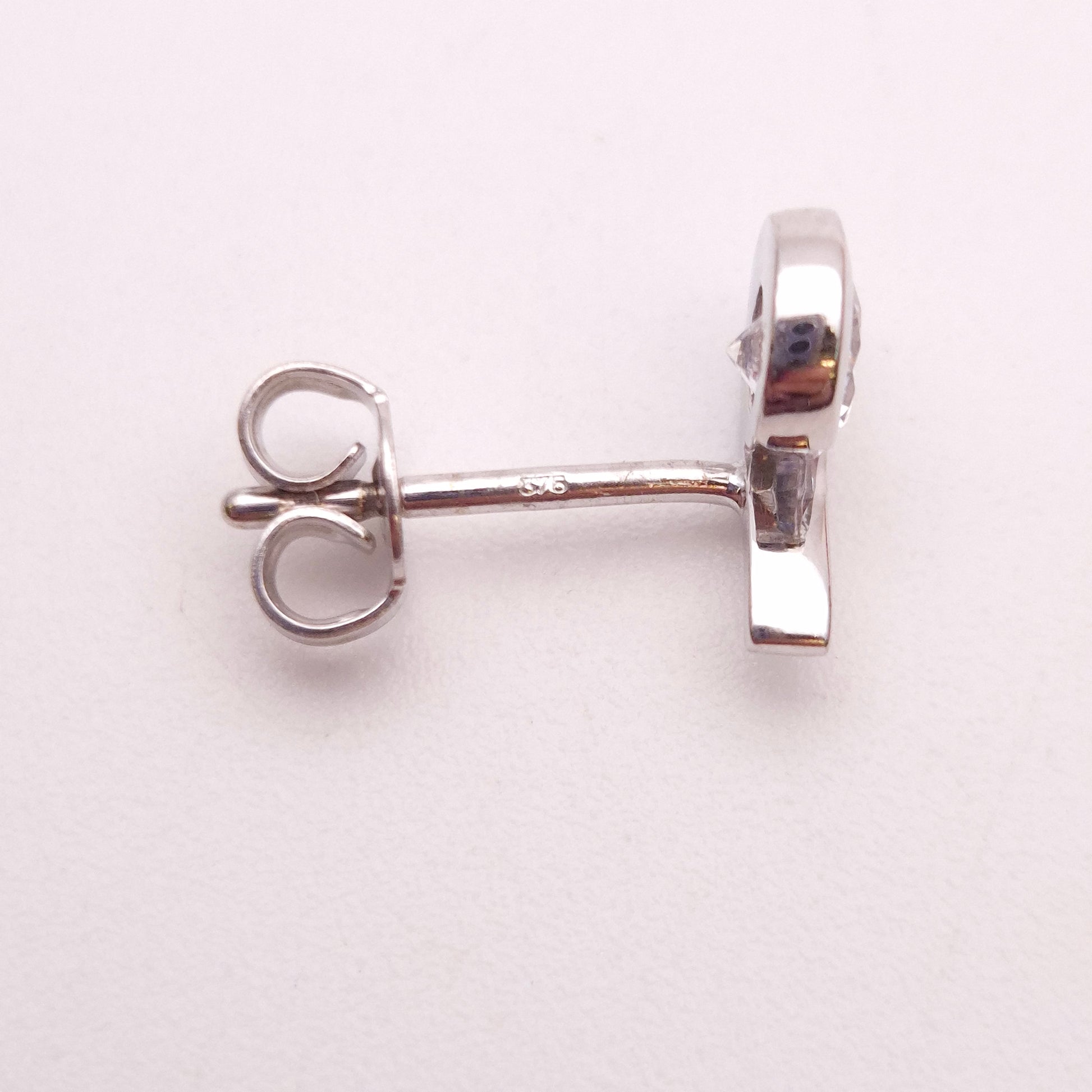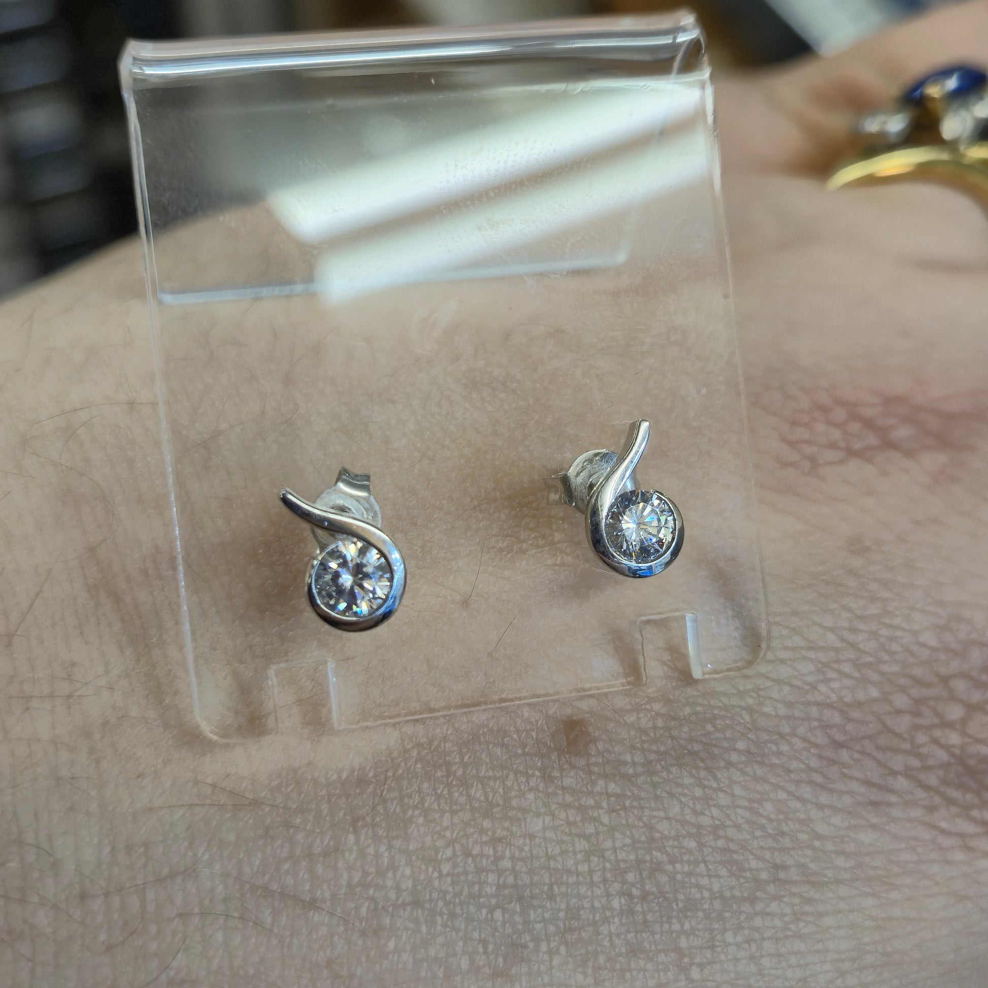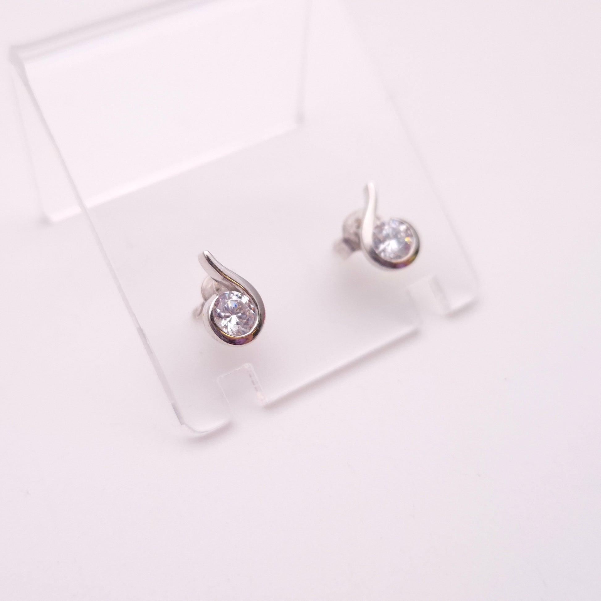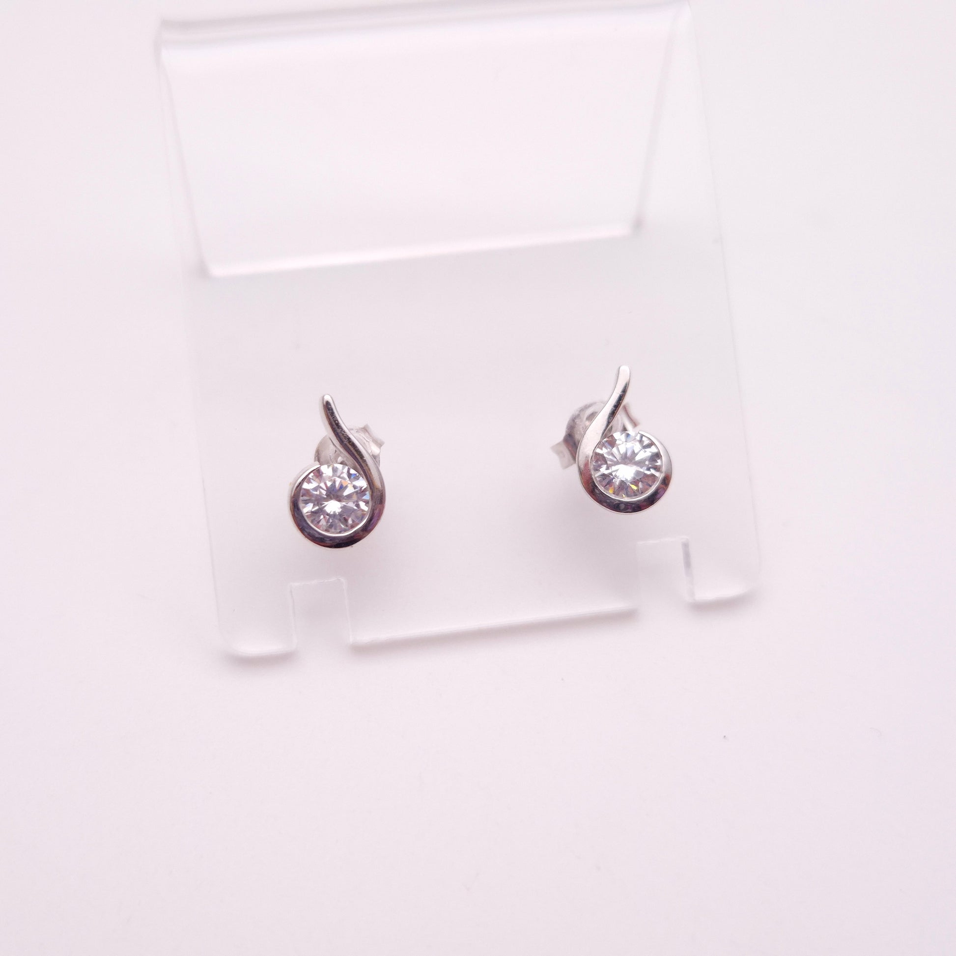 Each earring features a dazzling round brilliant-cut Cubic Zirconia (CZ) stone, delivering clear fire and brilliance akin to a diamond. The stone is secured in a protective semi-bezel setting, which is then beautifully integrated into a sweeping teardrop or gentle wave motif of highly polished white gold. This fluid design gives the classic solitaire stud a modern, graceful twist, creating a sophisticated profile on the ear. Secured with a sturdy post and butterfly back, these studs are lightweight and comfortable for continuous wear. They are a versatile staple, perfect for adding a touch of understated glamour to any outfit, and make an excellent, high-quality gift.