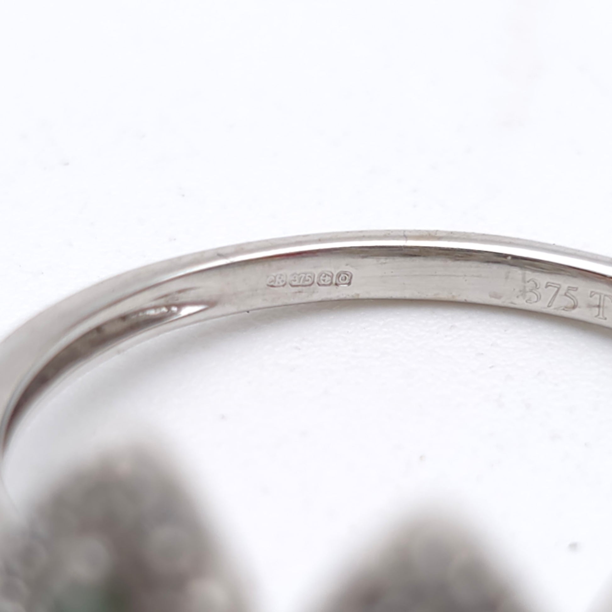 The setting and band are constructed from durable 9-carat white gold. The triple-cluster design gives the ring an impressive span and presence on the finger, making it a luxurious piece of cocktail jewellery or just a truly unique ring.