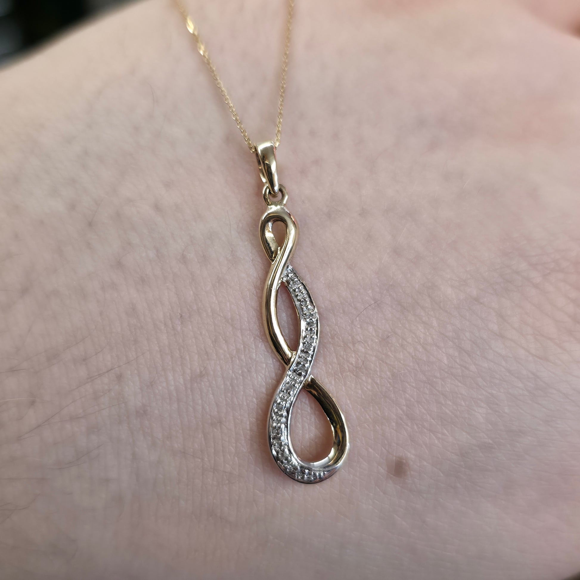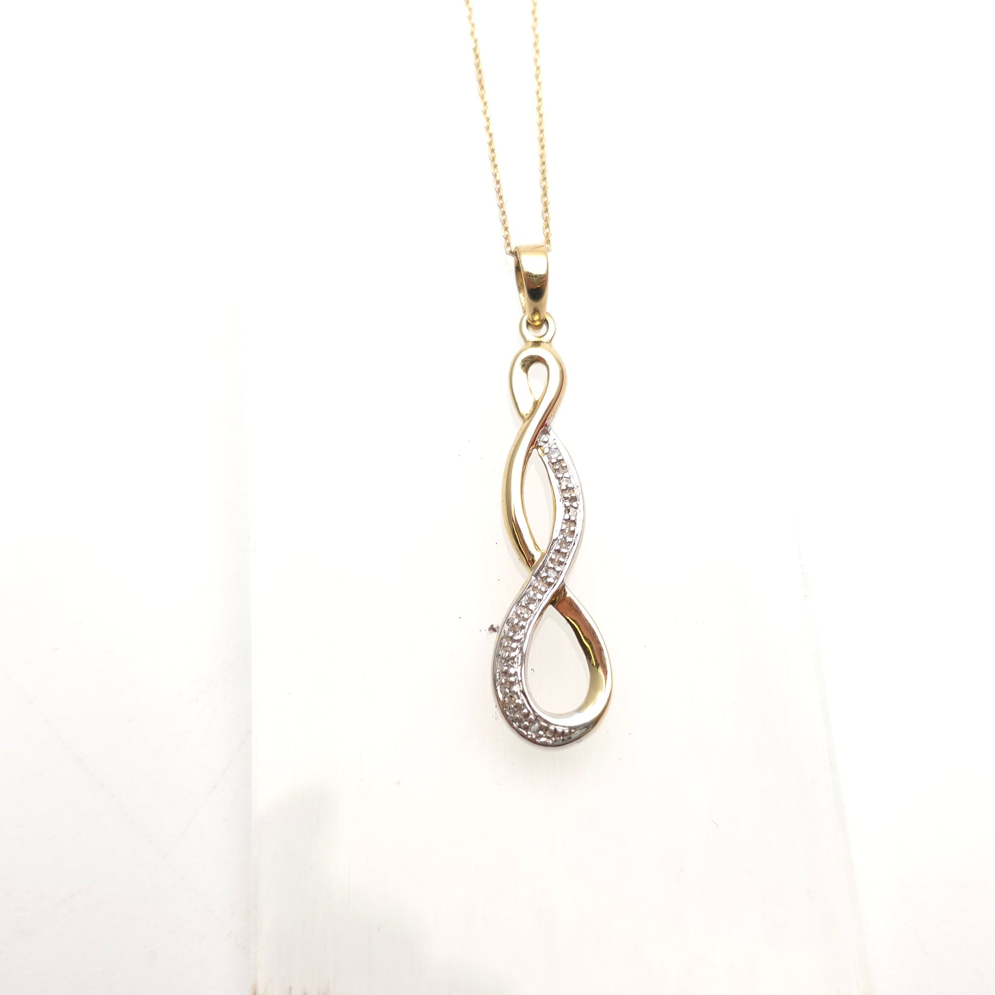 Crafted with a modern two-tone aesthetic, the pendant combines the classic warmth of 9ct yellow gold with a shimmering 9ct white gold accent. The white gold strand is delicately diamond-set, featuring a row of pavé-style accents that provide a continuous line of sparkle, beautifully highlighting the pendant's elegant "S" curve.