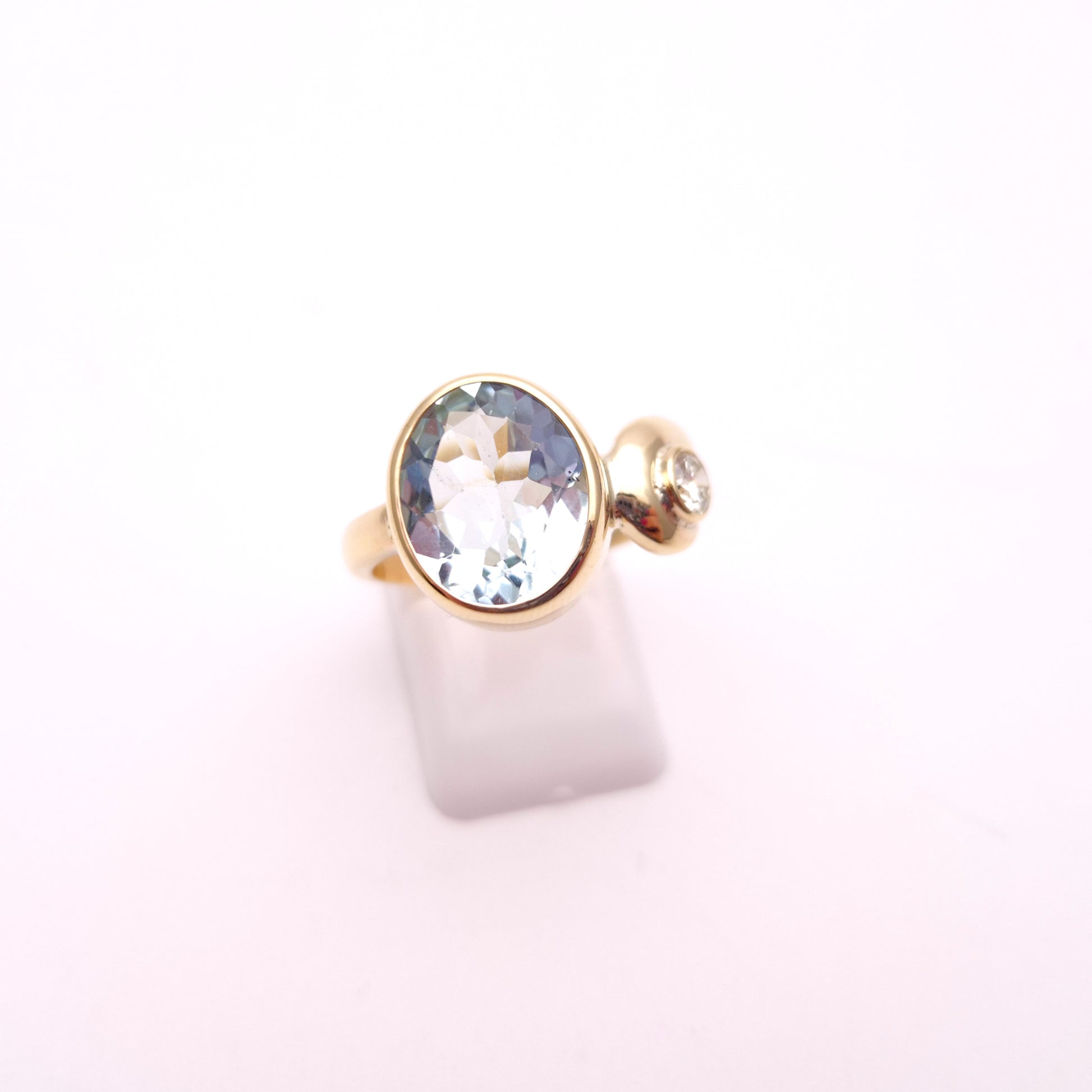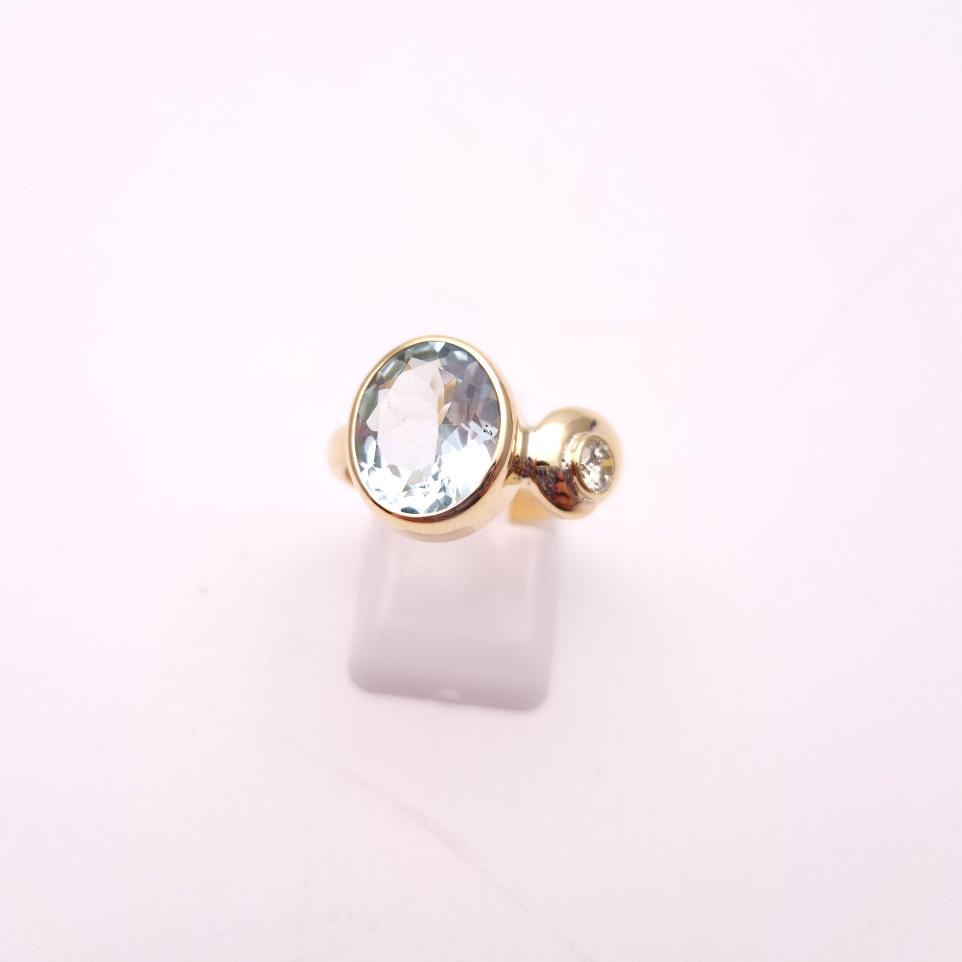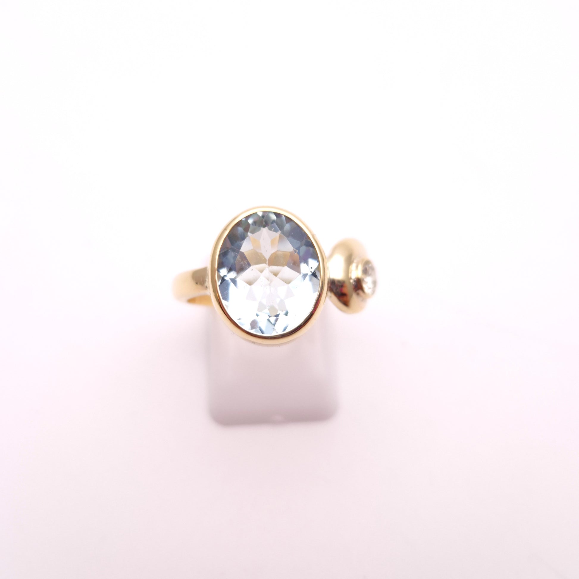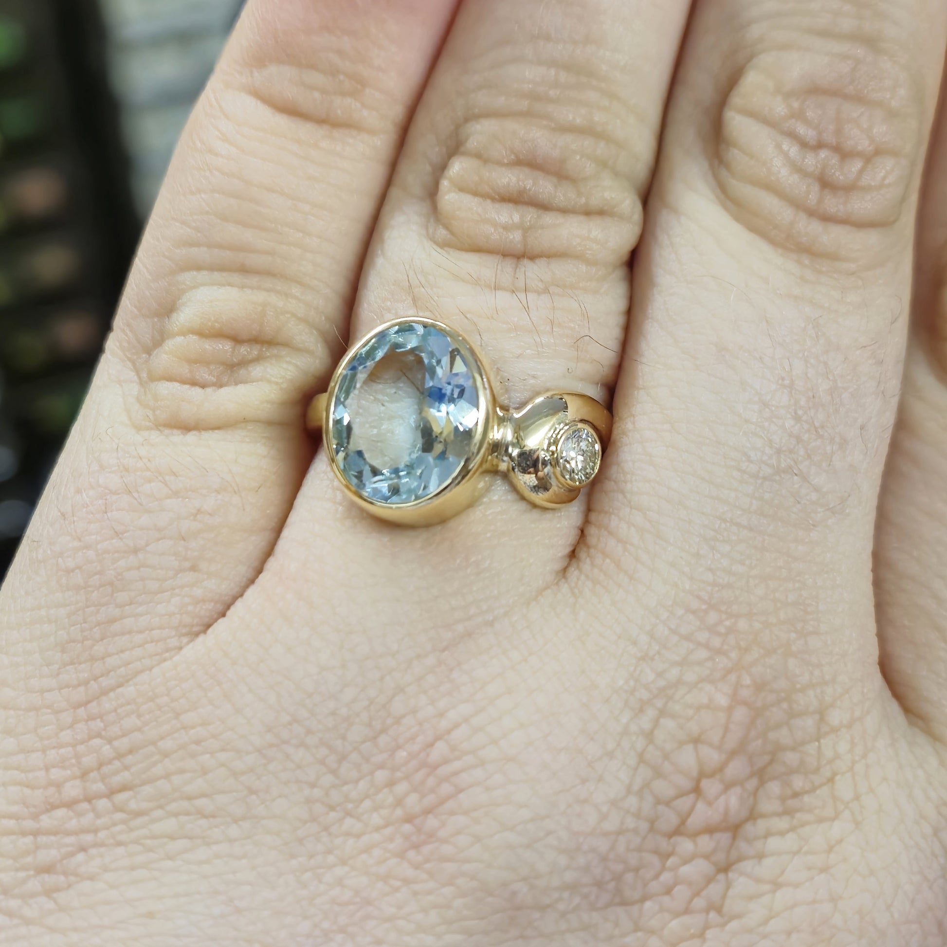 This exquisite ring showcases a captivating oval-cut aquamarine of approximately 4.0cts as its centrepiece, its serene pale blue hue reminiscent of tranquil waters. The gemstone is securely set in a warm 9ct yellow gold bezel, allowing its natural beauty to shine through.