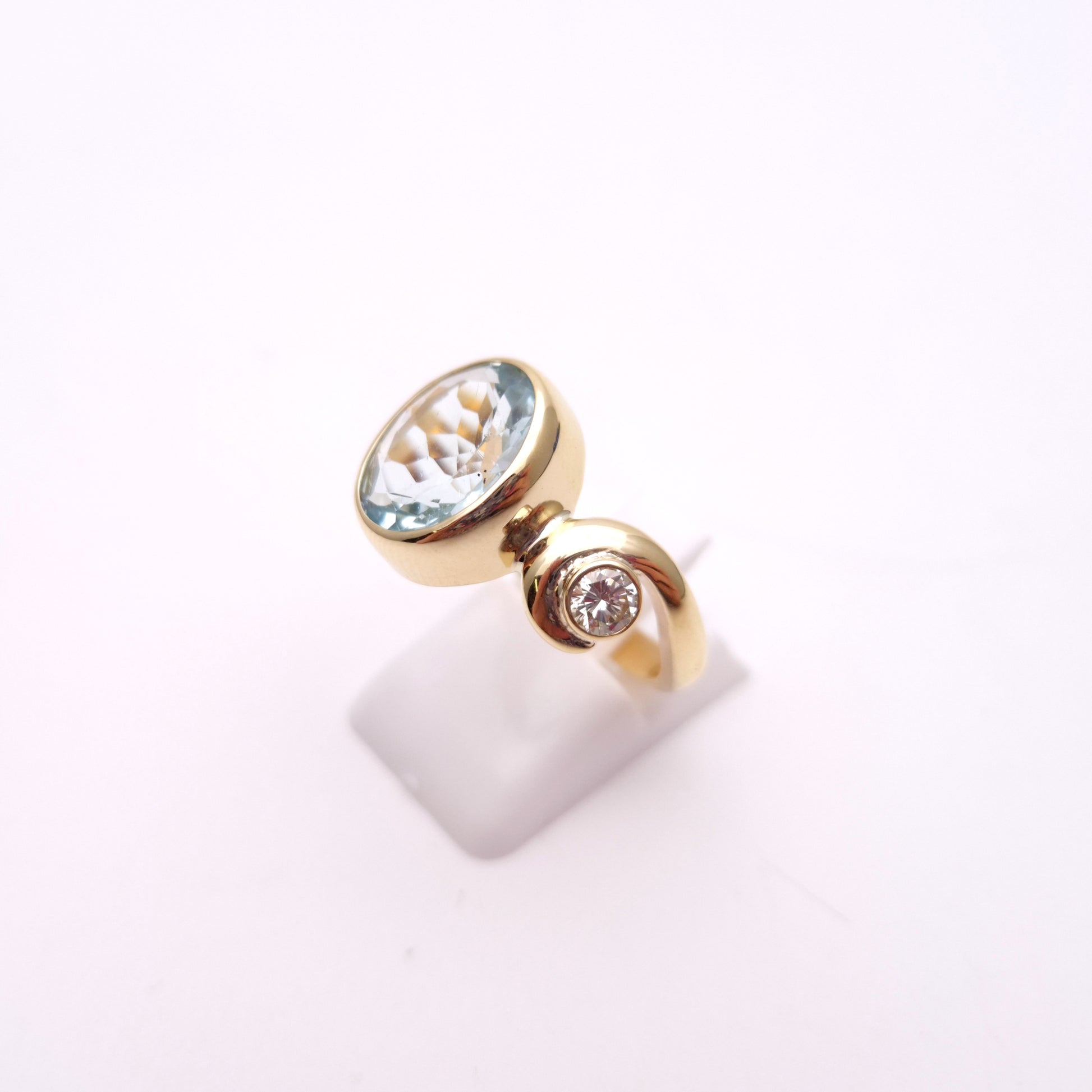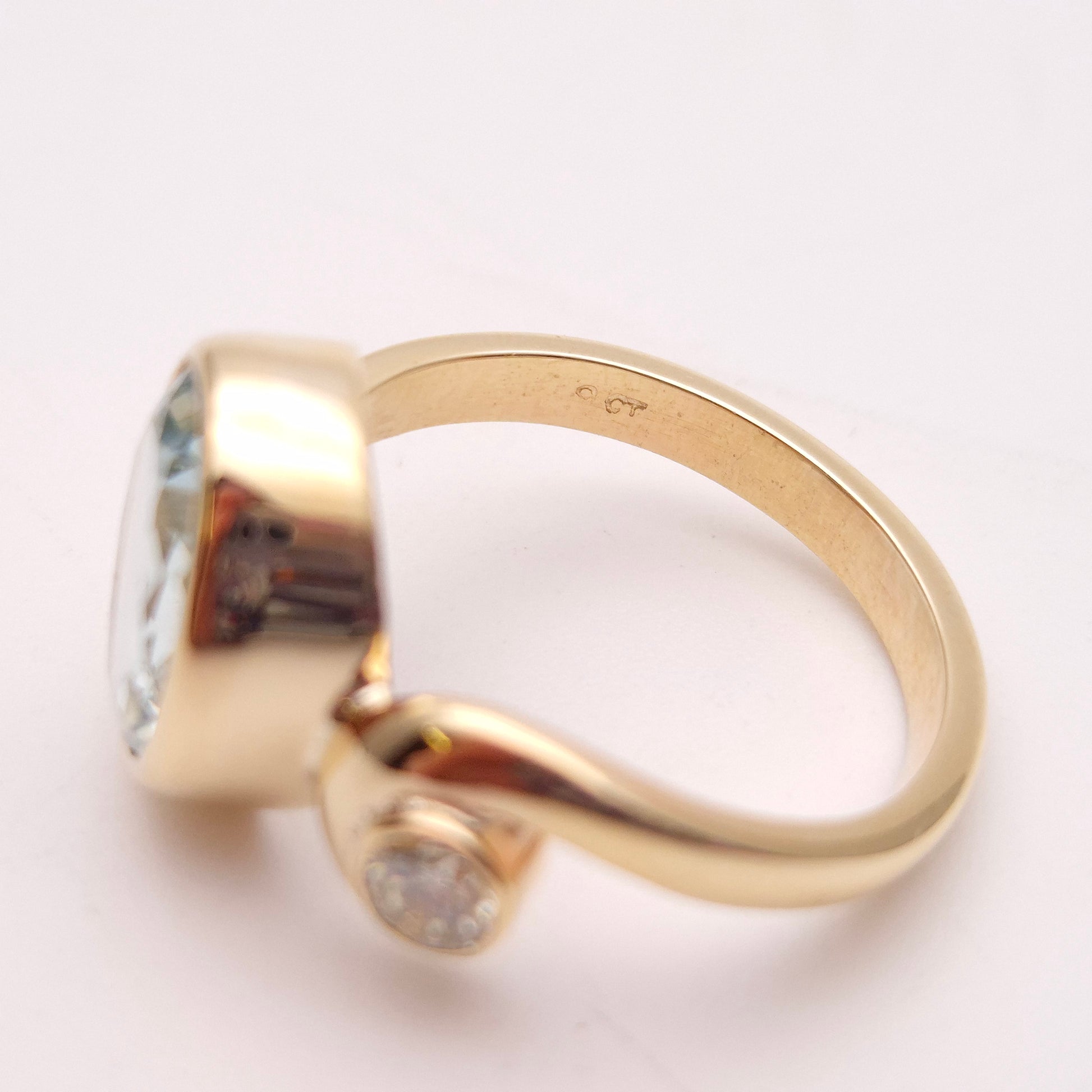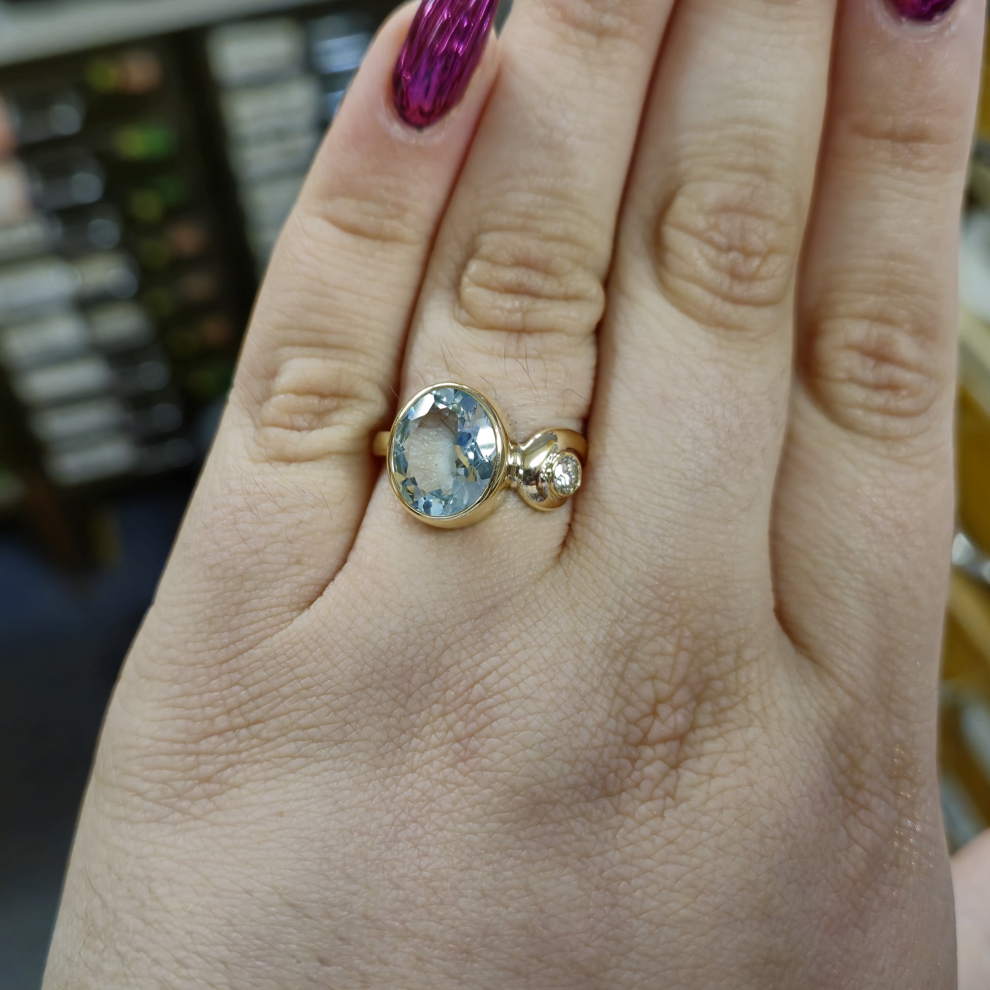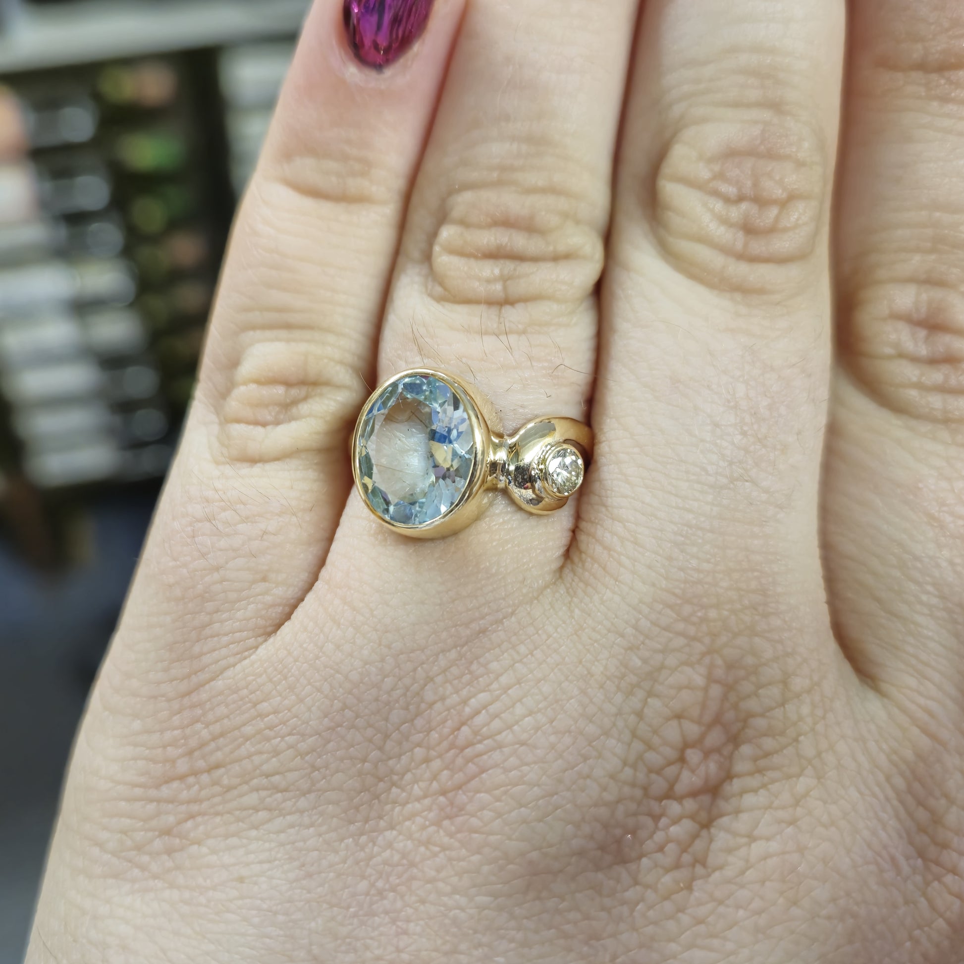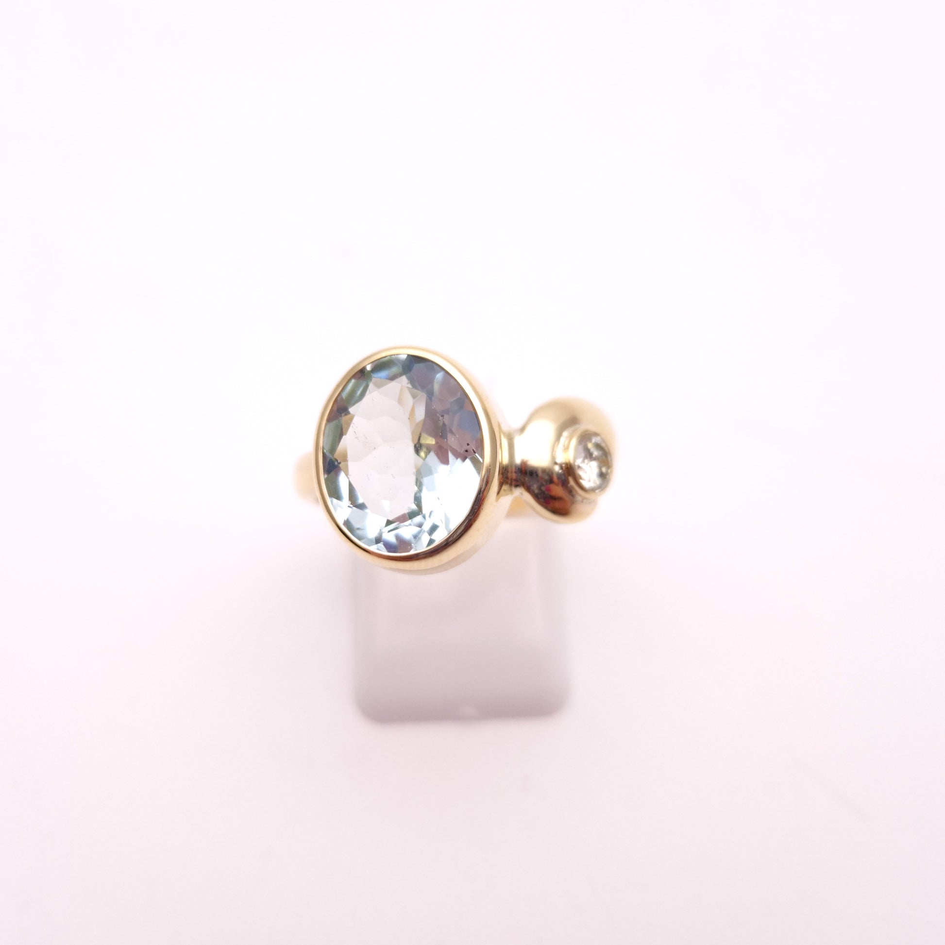 This exquisite ring showcases a captivating oval-cut aquamarine of approximately 4.0cts as its centrepiece, its serene pale blue hue reminiscent of tranquil waters. The gemstone is securely set in a warm 9ct yellow gold bezel, allowing its natural beauty to shine through.