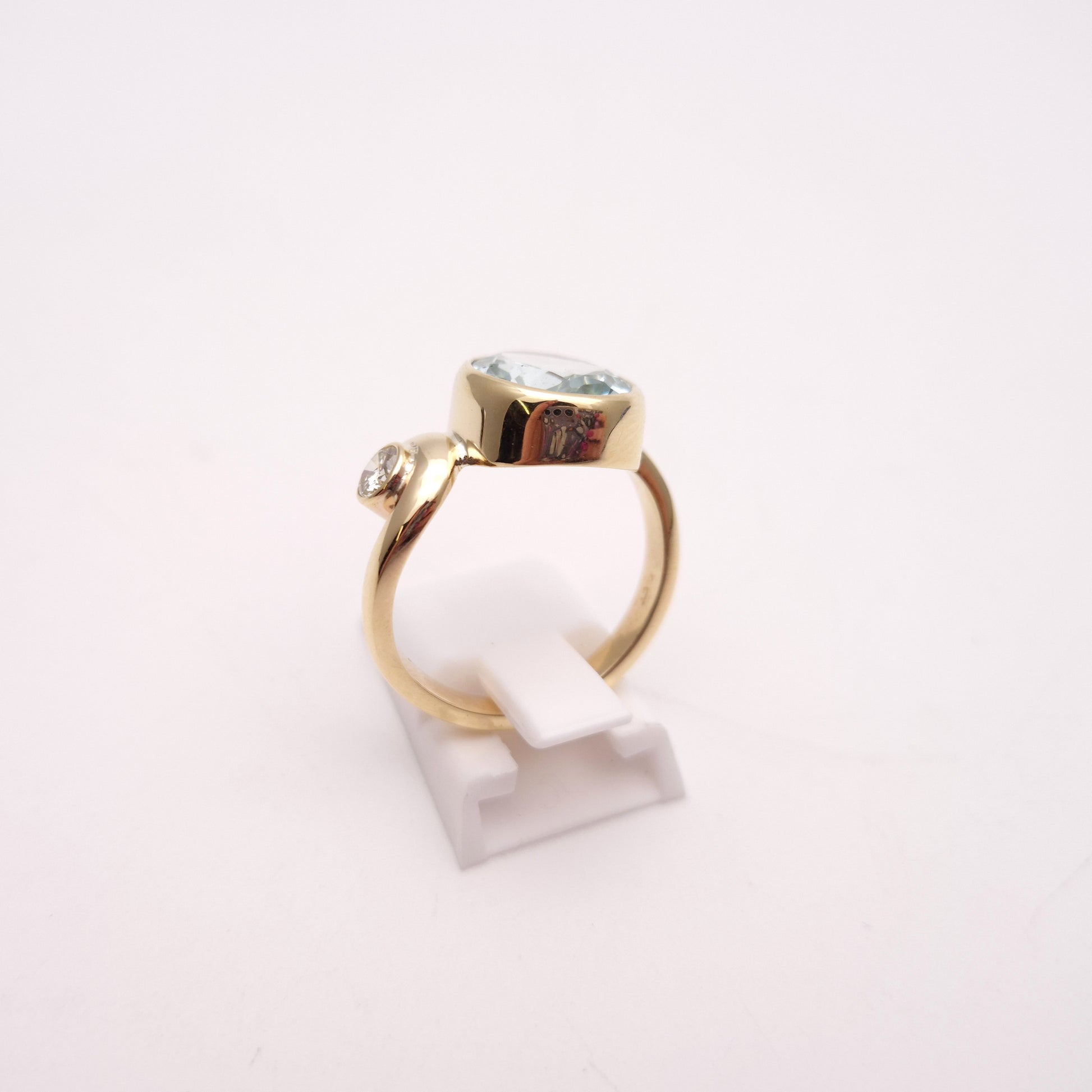 Adding a touch of brilliance and contrast is a delicate round-cut diamond nestled beside the aquamarine of approximately 0.25ct. The sparkling diamond, also bezel-set in 9ct yellow gold, beautifully complements the larger gemstone, creating a harmonious and elegant design.