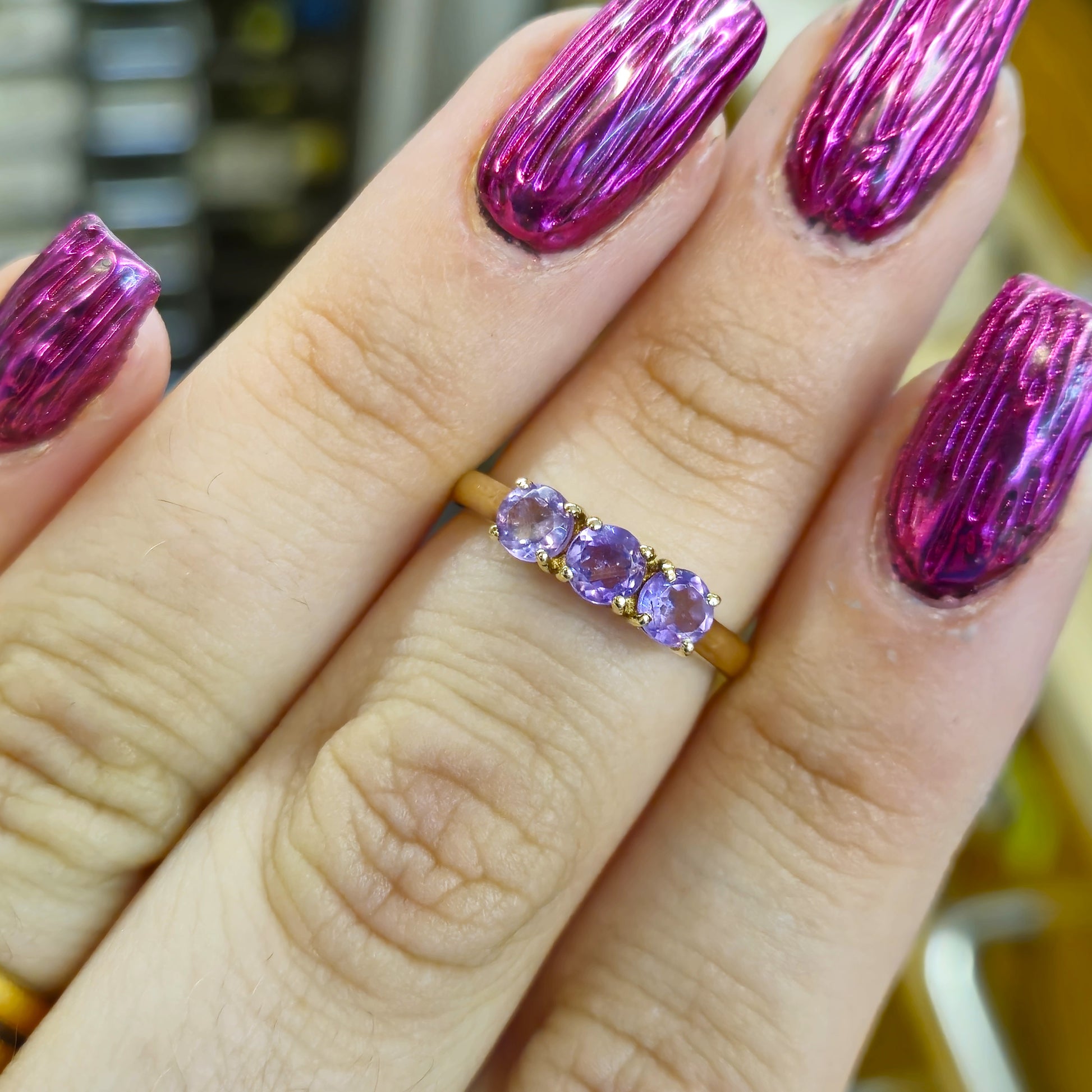 Adorn your finger with the rich purple hues of this 9ct Yellow Gold Amethyst Trilogy Ring. Three sparkling round-cut amethysts are securely set in warm yellow gold, creating a harmonious and eye-catching design.