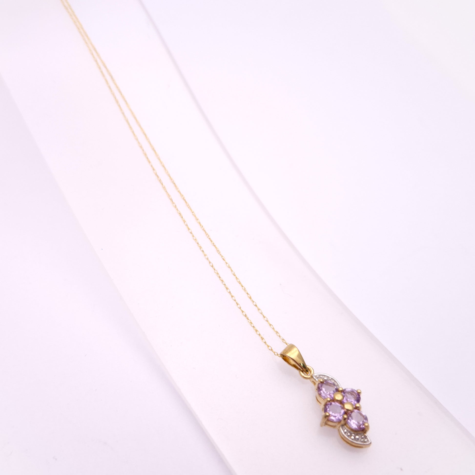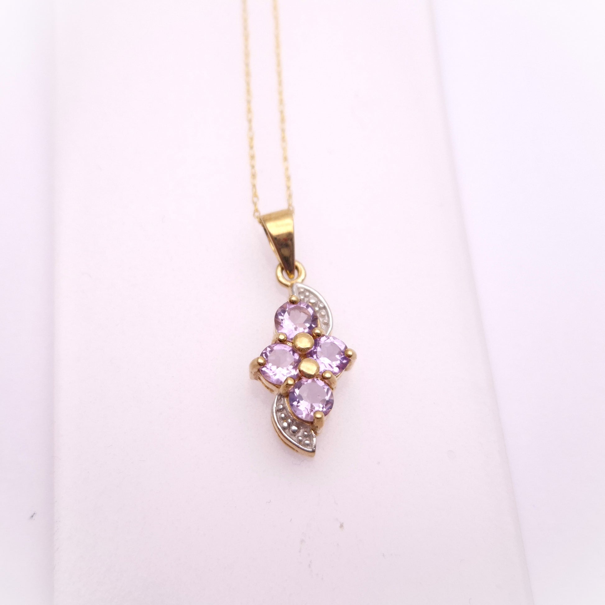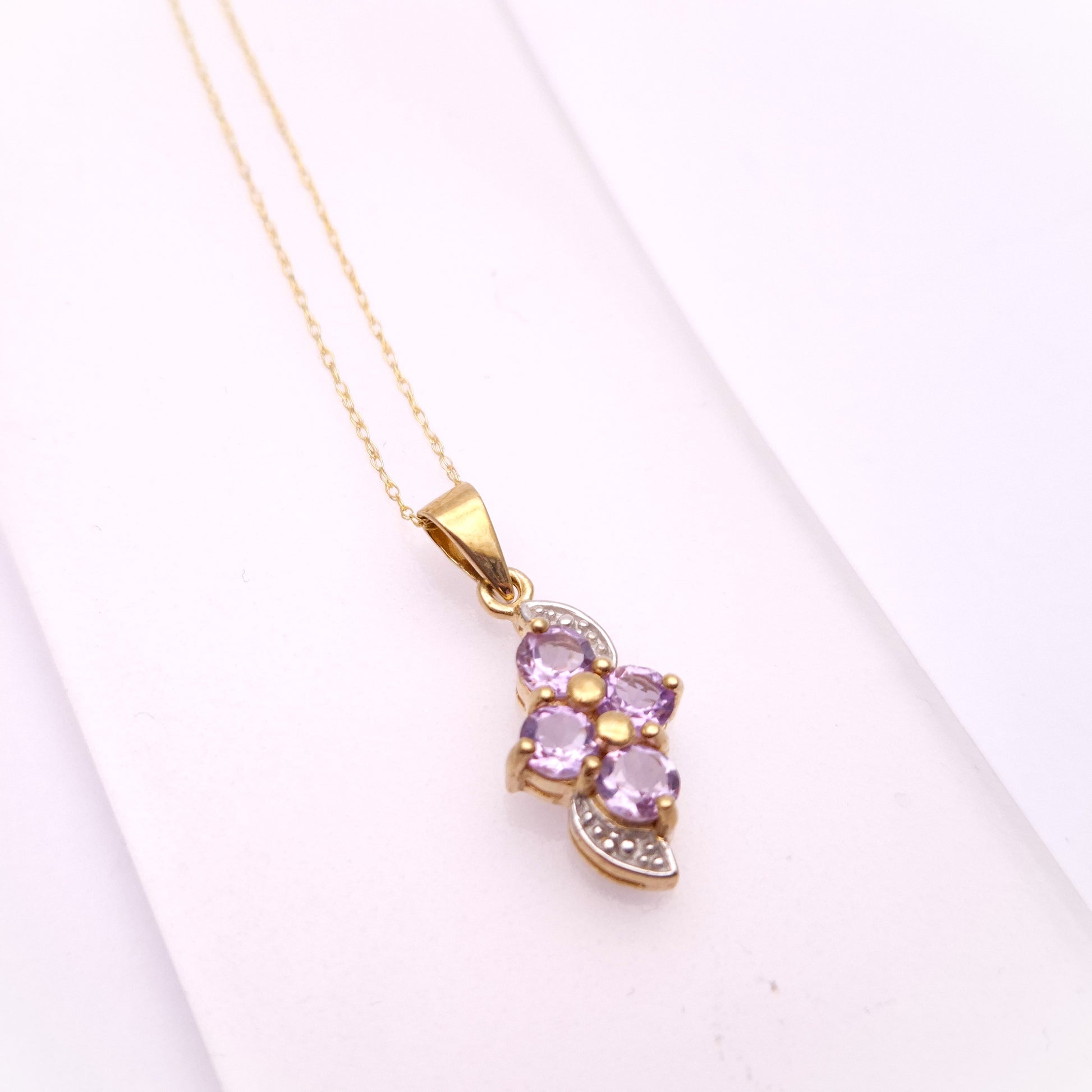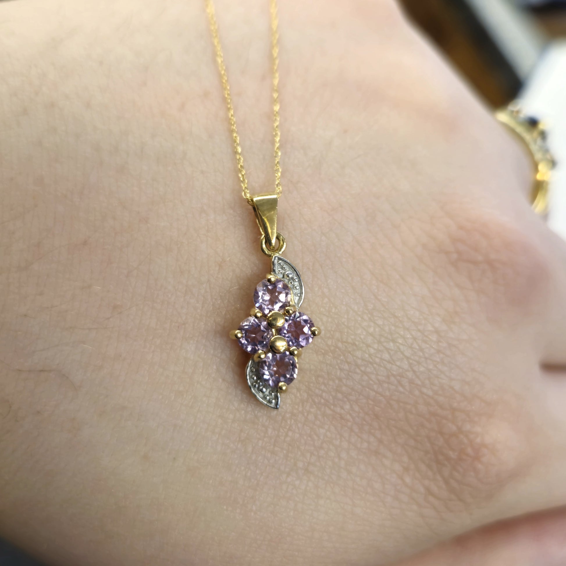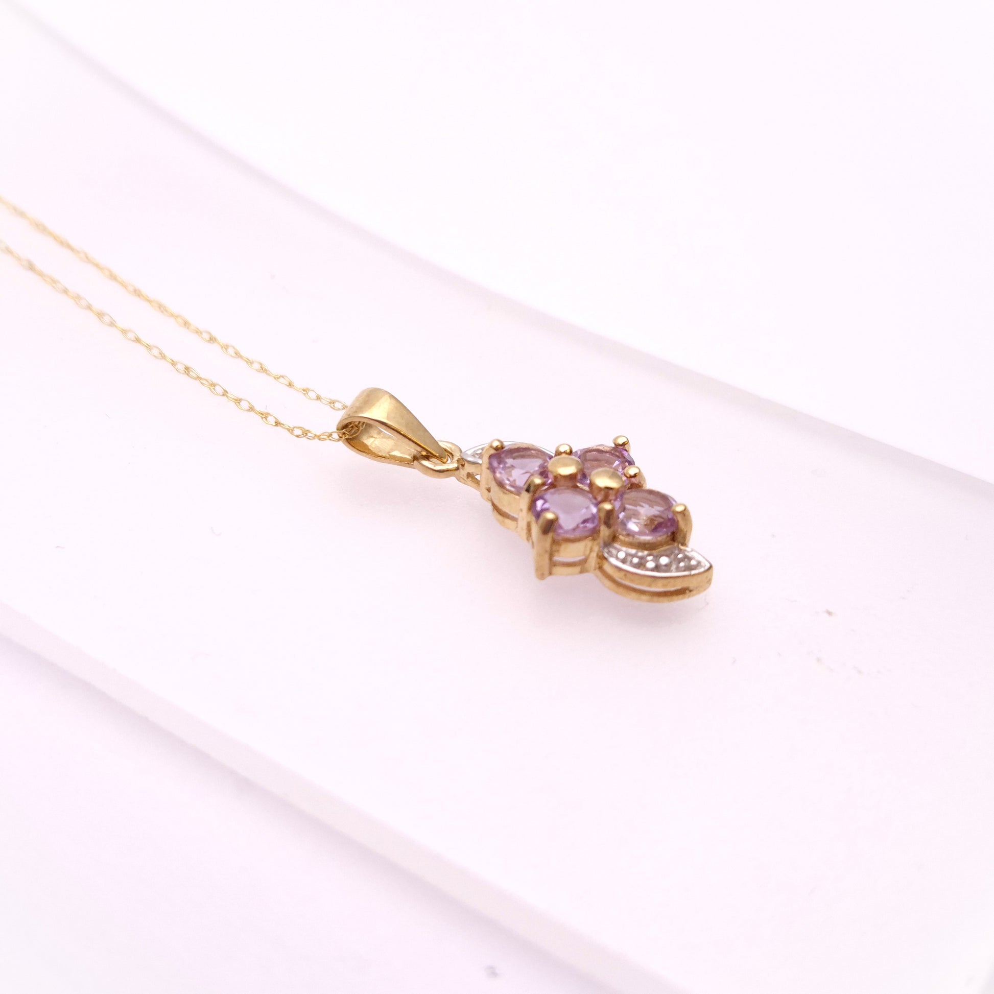 Embrace subtle elegance with this charming pendant necklace crafted in warm 9ct yellow gold. The amethysts exhibit a lovely light to medium purple hue, catching the light with a gentle shimmer. The gold setting enhances the warmth of the piece, while the tiny diamond accents add a touch of luxury. The pendant gracefully suspends from a fine and classic 9ct yellow gold chain, making it perfect for everyday wear or adding a delicate touch to a special occasion outfit.