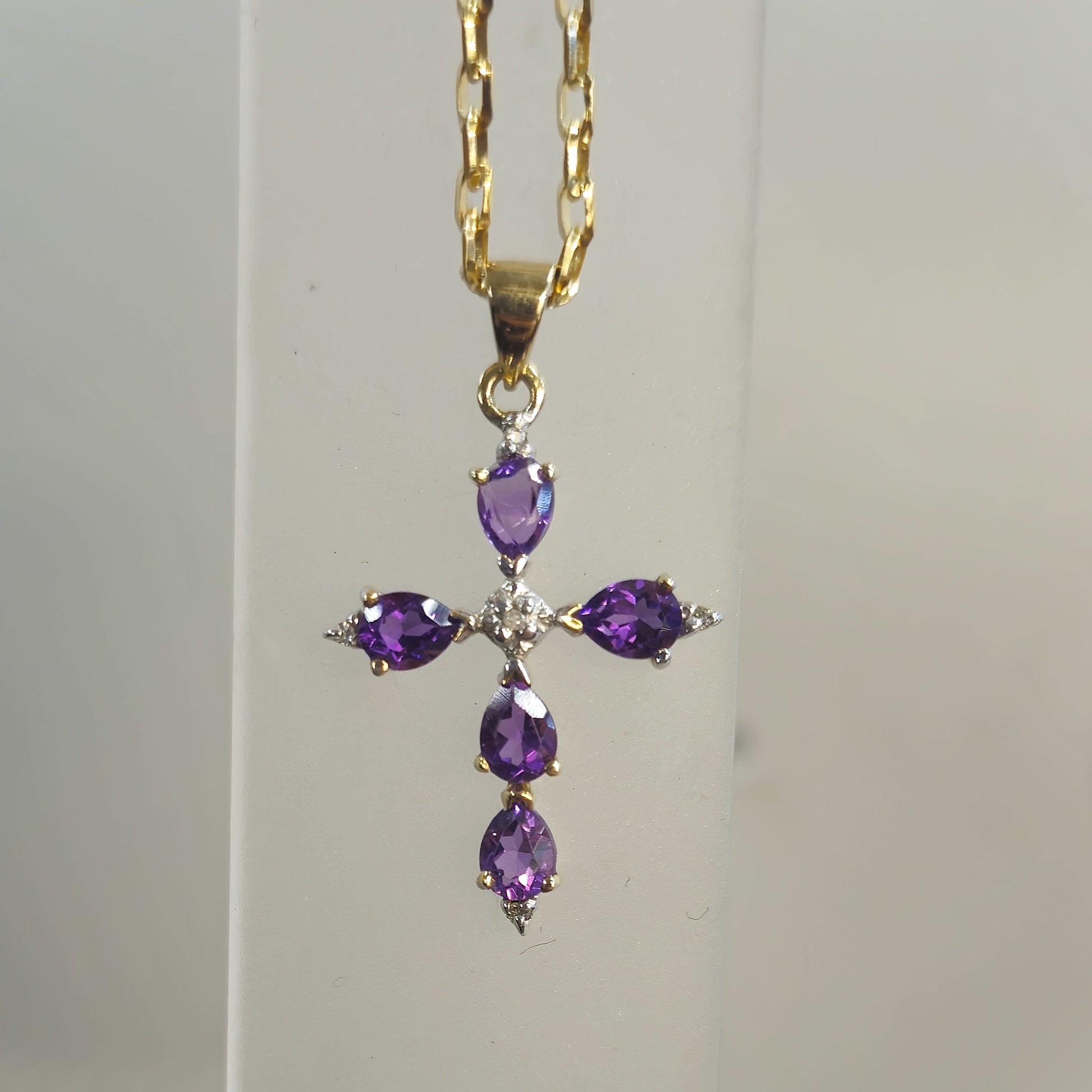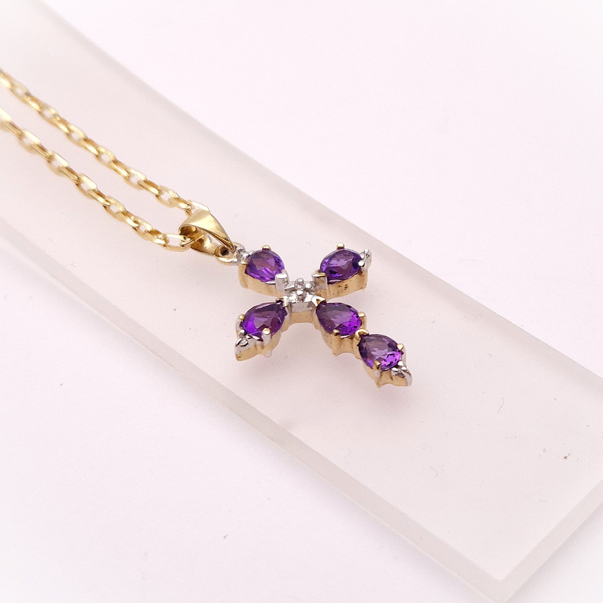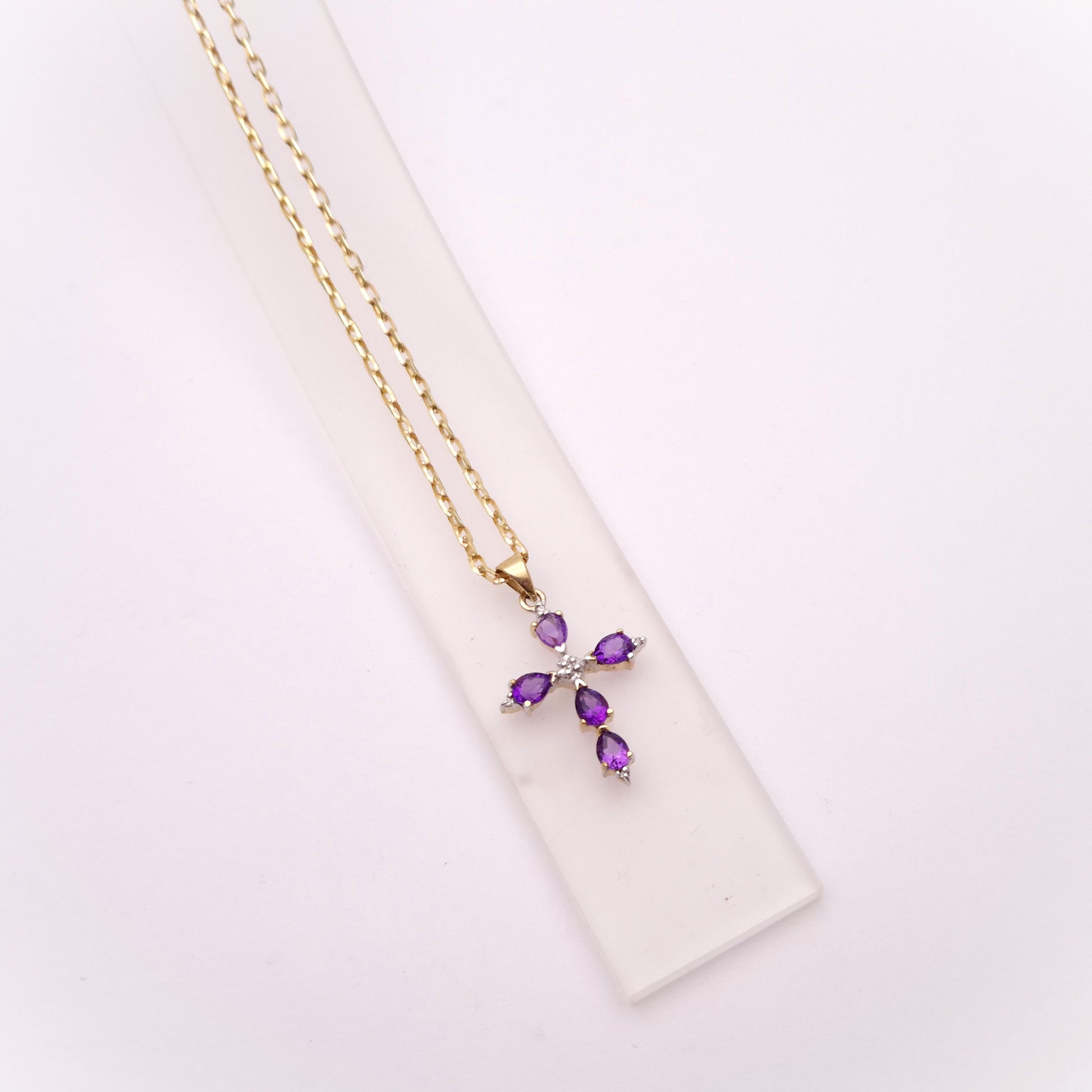 This gorgeous necklace is made from 9ct yellow gold and comprises the pendant and chain. The pendant is a traditional cross style pendant with pear shaped amethyst stones with a small diamond set at the very centre. The chain is a belcher style chain and is 16 inches long.