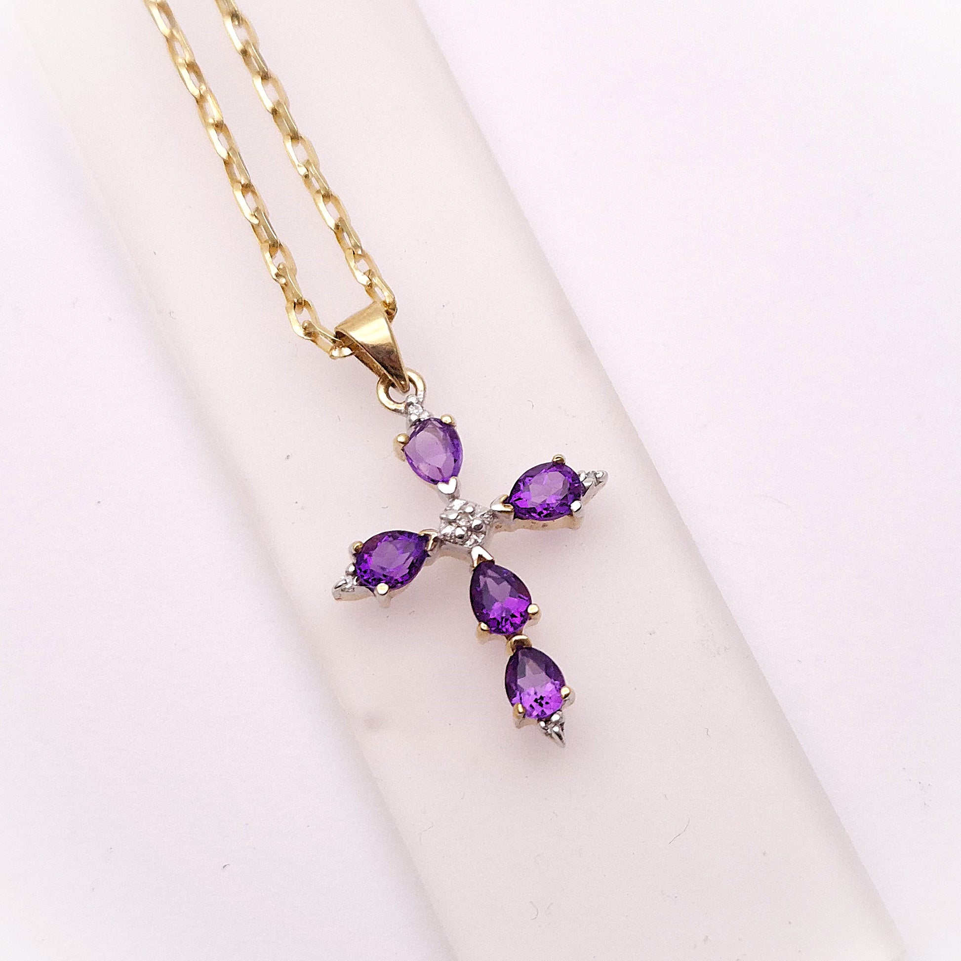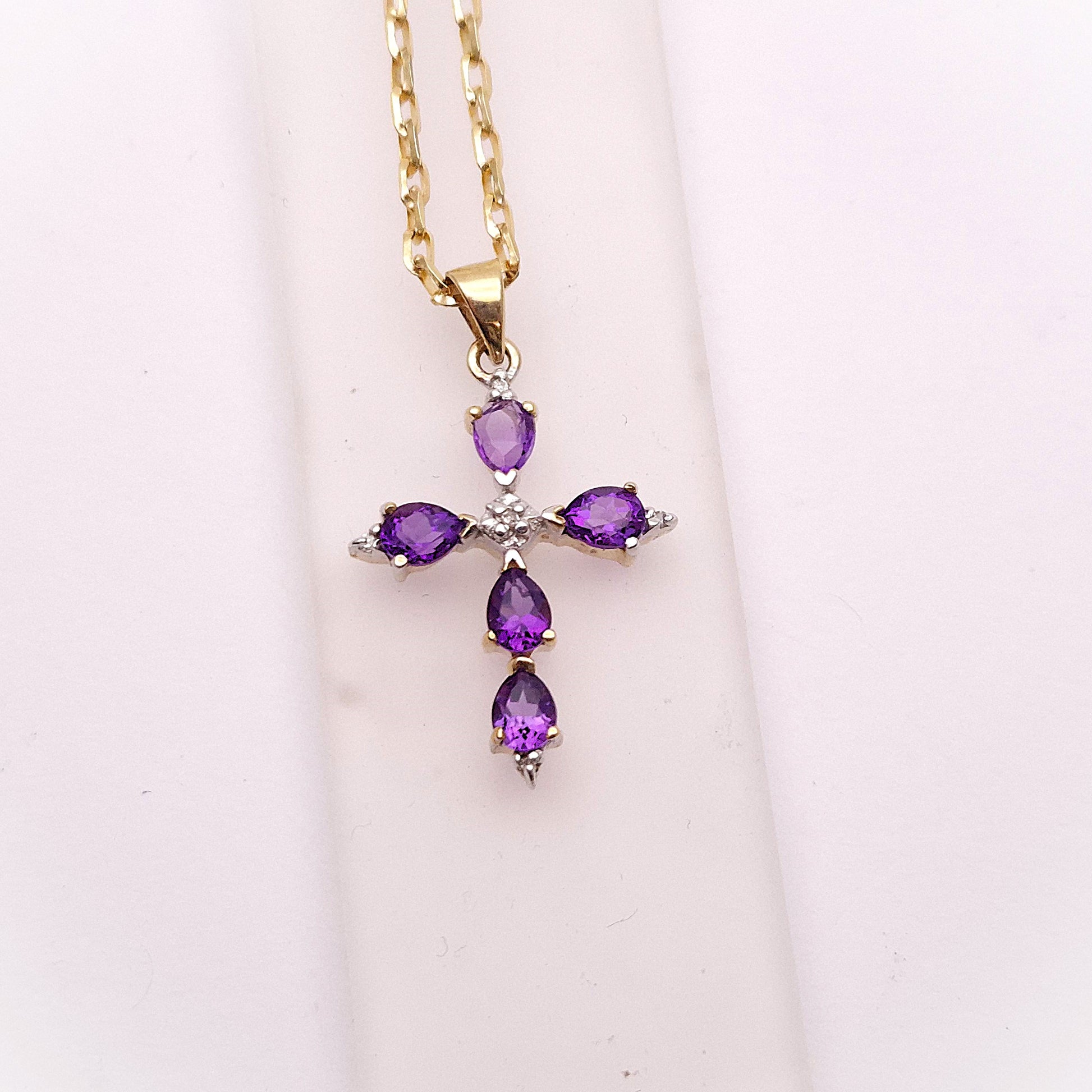 9ct Yellow Gold Amethyst and Diamond Cross Necklace