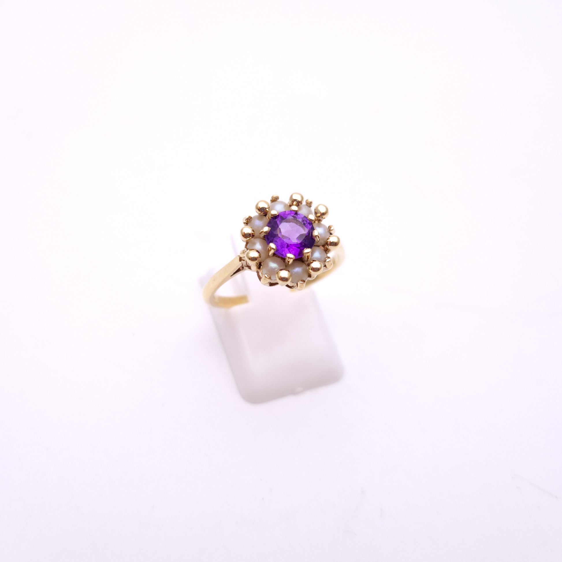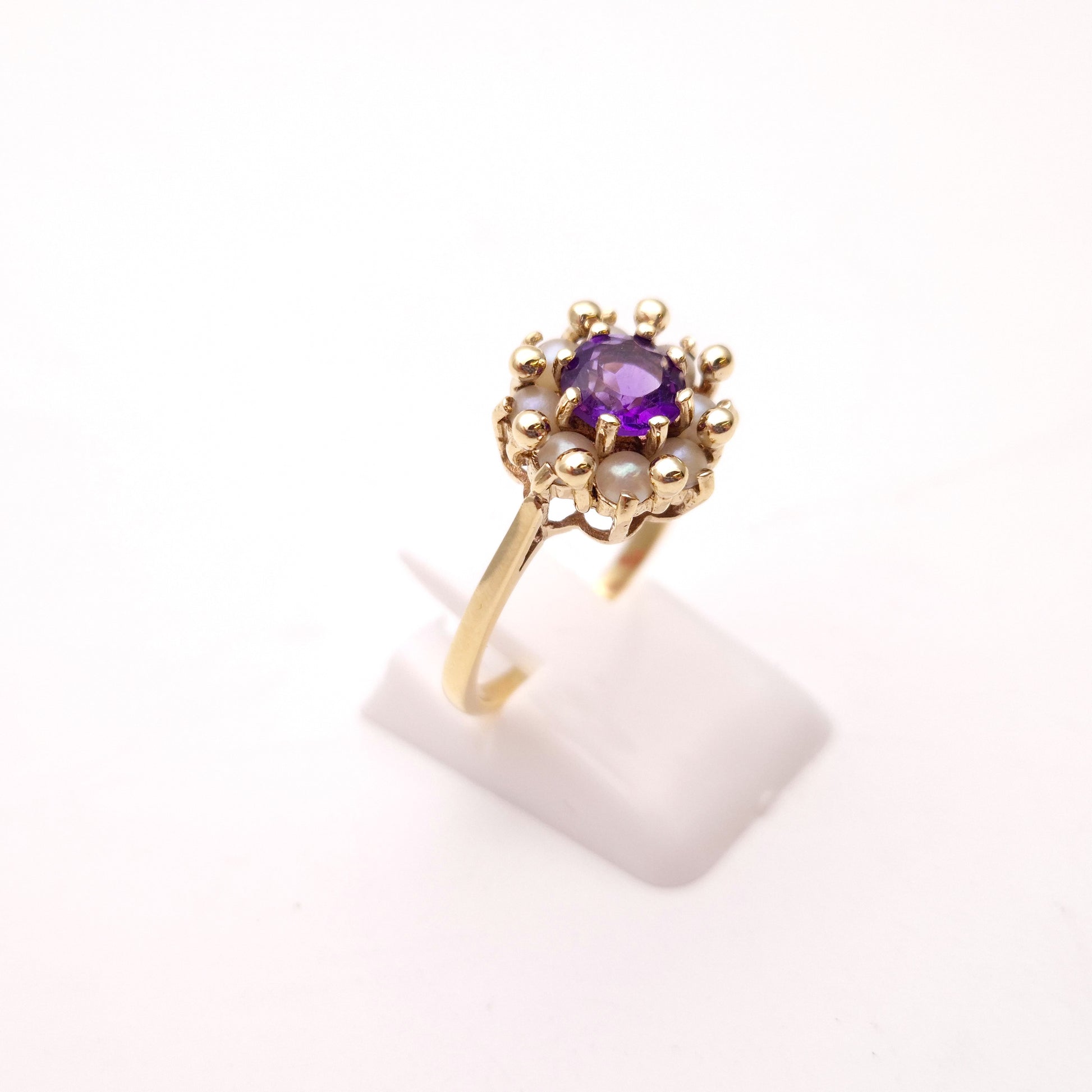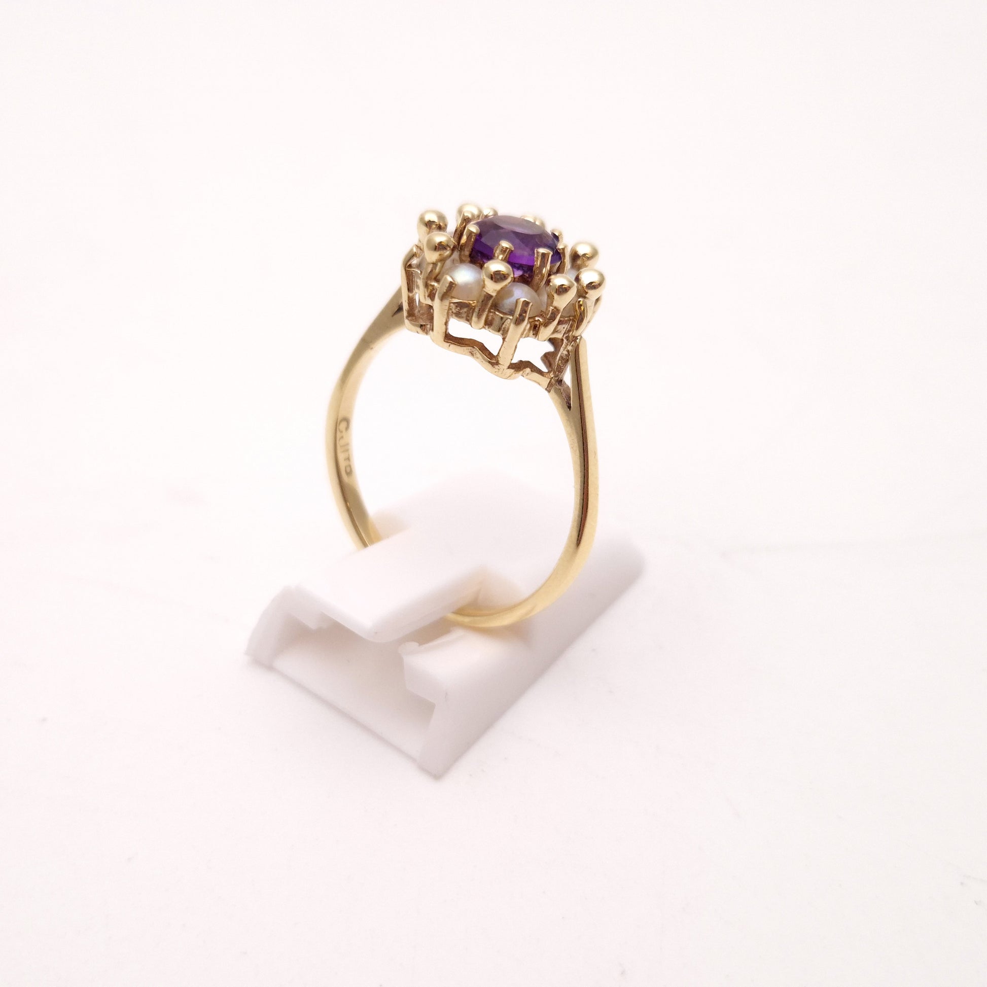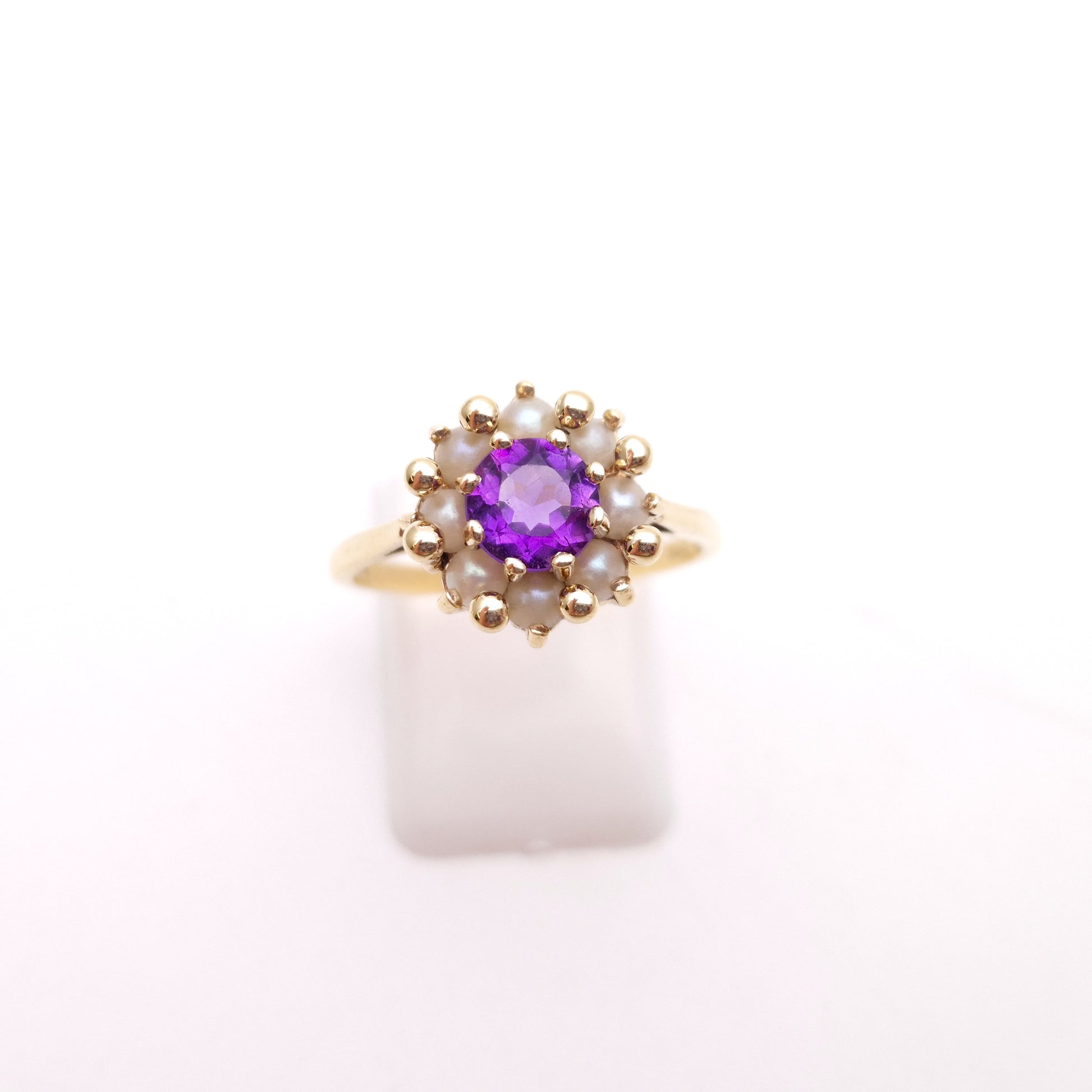 Surrounding the central amethyst is a graceful halo of lustrous seed pearls, creating a delicate and classic floral-like cluster. The creamy white of the pearls provides a lovely contrast to the rich purple of the amethyst and the warm glow of the yellow gold, evoking a timeless, romantic aesthetic.