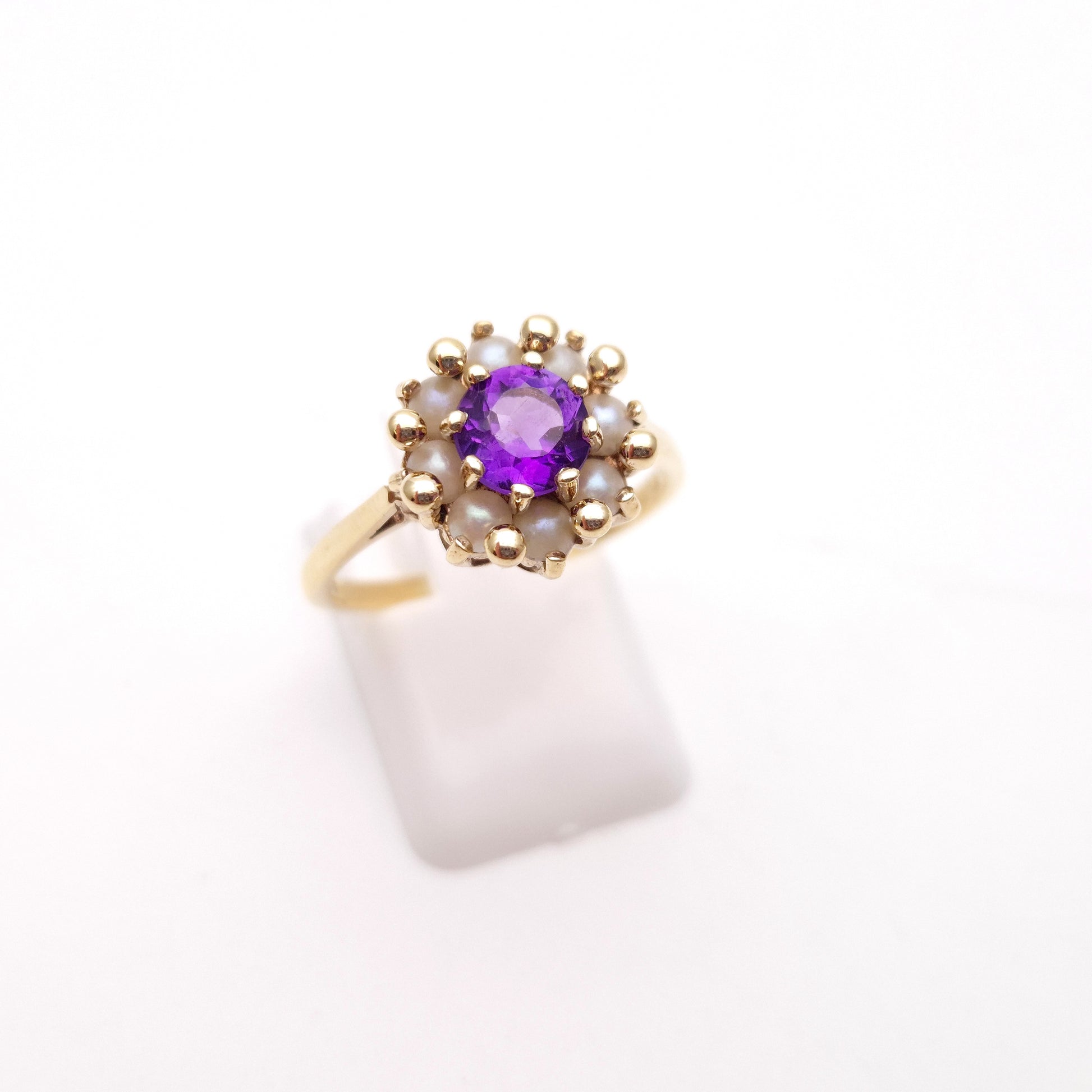 This 9ct yellow gold amethyst and pearl antique-style cluster ring is a truly enchanting piece. It's perfect for those who appreciate vintage-inspired designs, the charm of pearls, and the vibrant beauty of amethyst, making it a wonderful gift or a cherished addition to any jewellery collection.