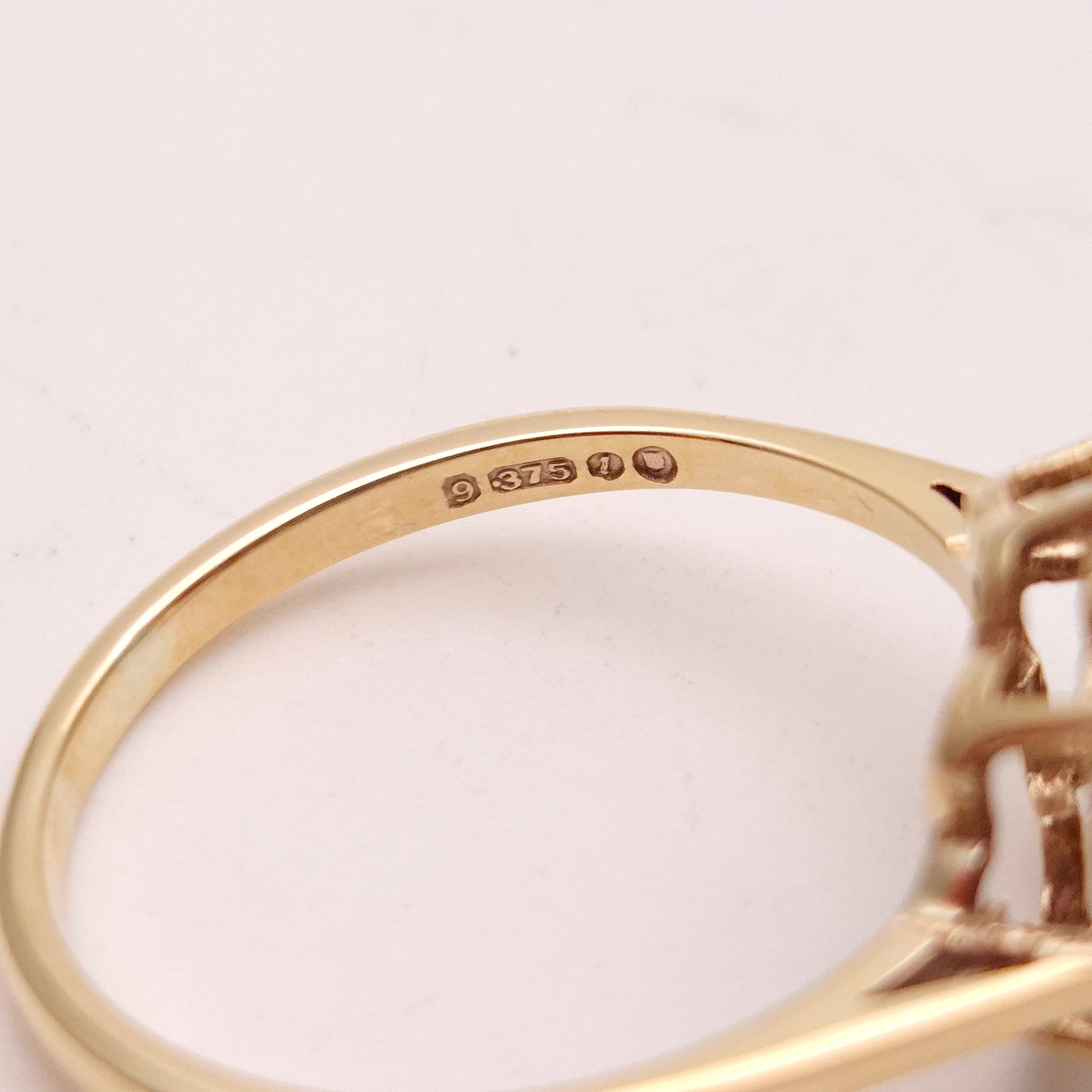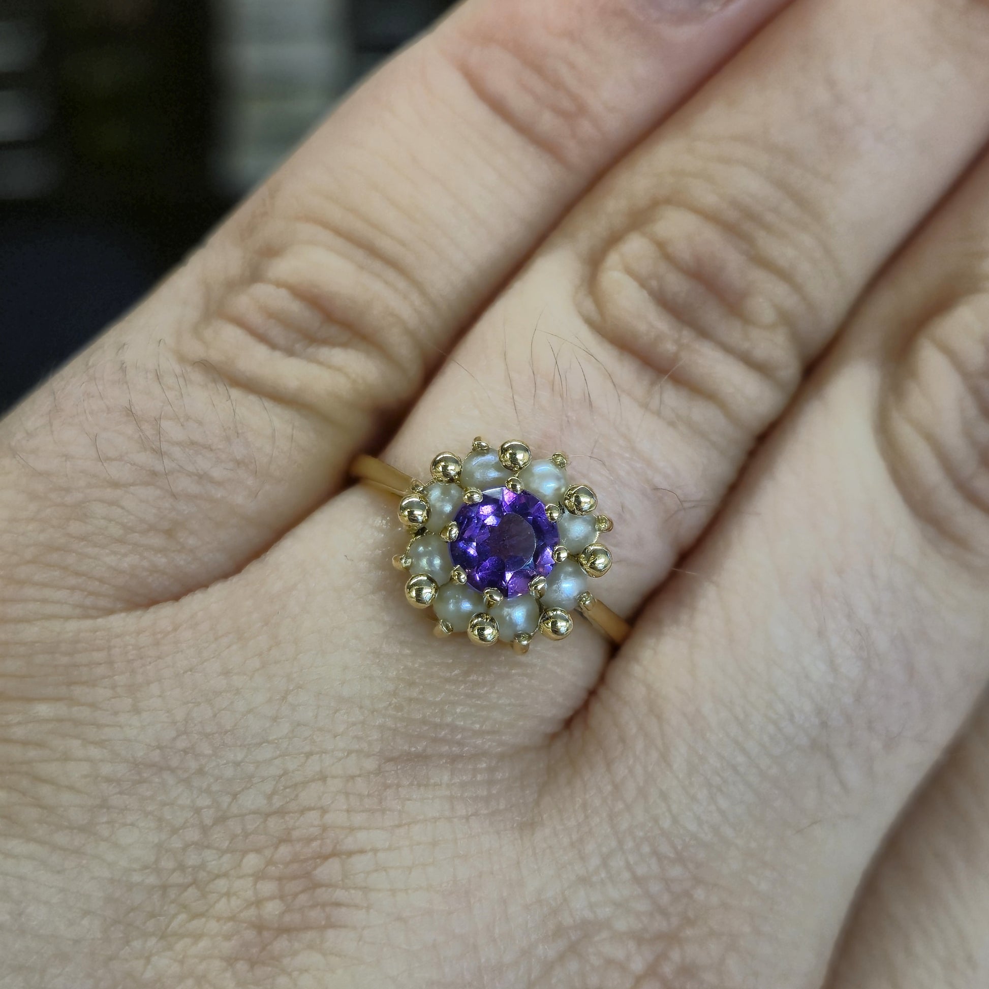 This charming ring made in the 1960s, crafted in warm 9ct yellow gold, features a captivating antique-style cluster design centred around a vibrant amethyst. The round or oval-cut amethyst, showcasing its beautiful purple hue, forms the focal point of the ring.