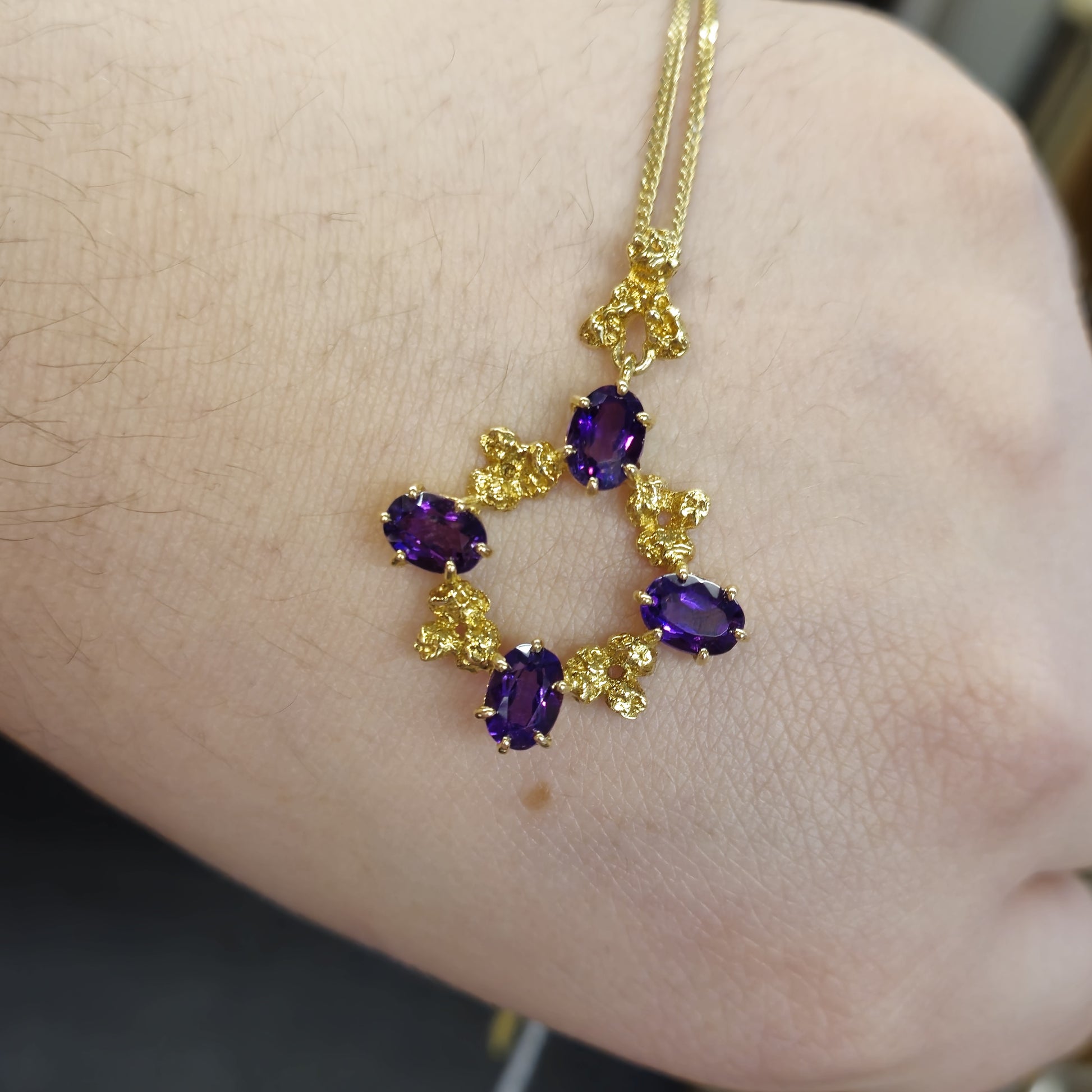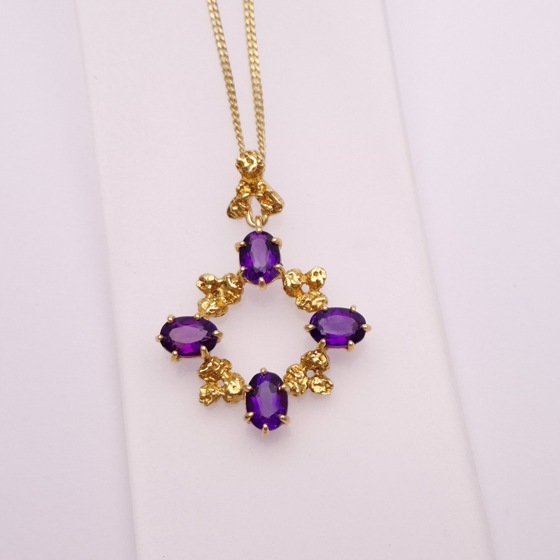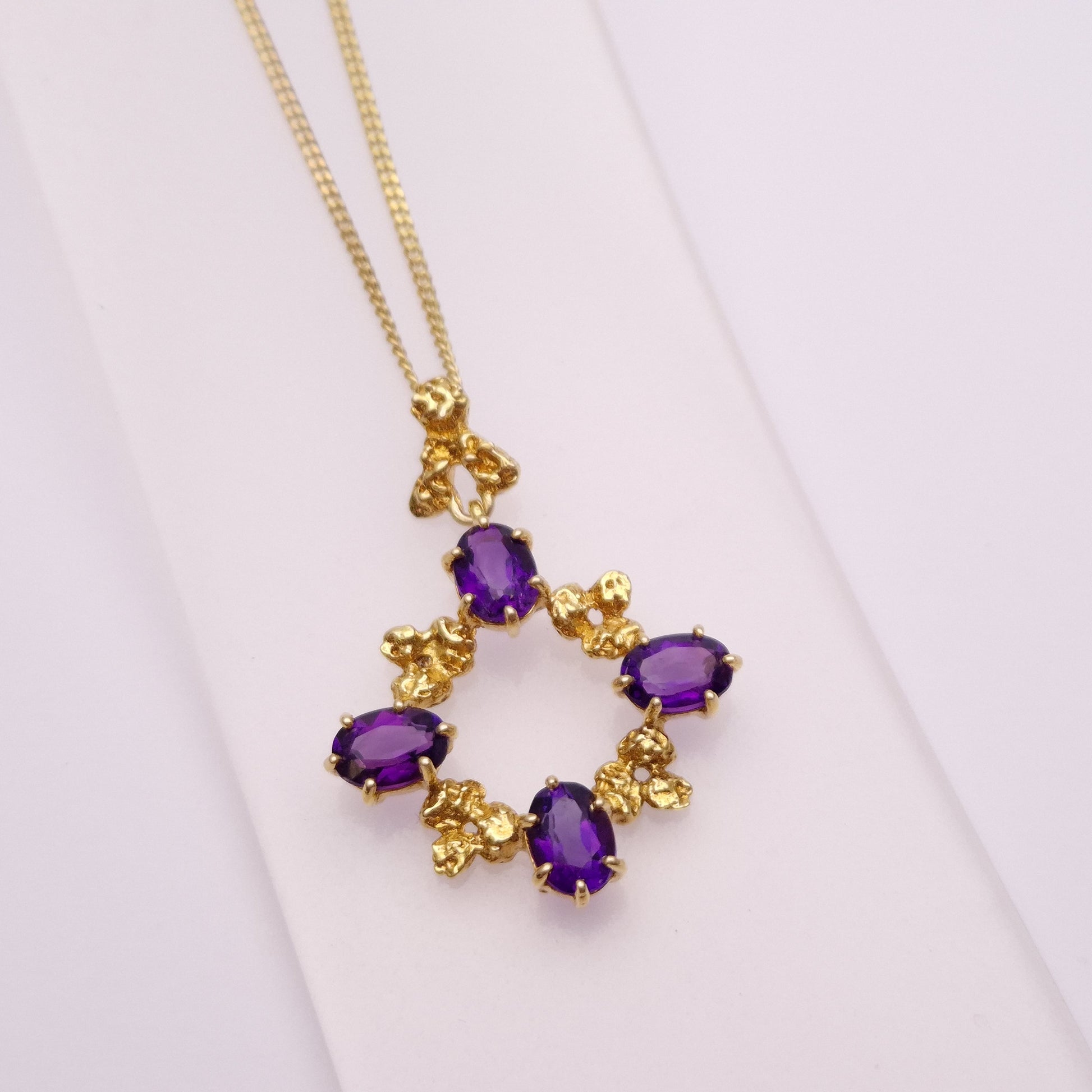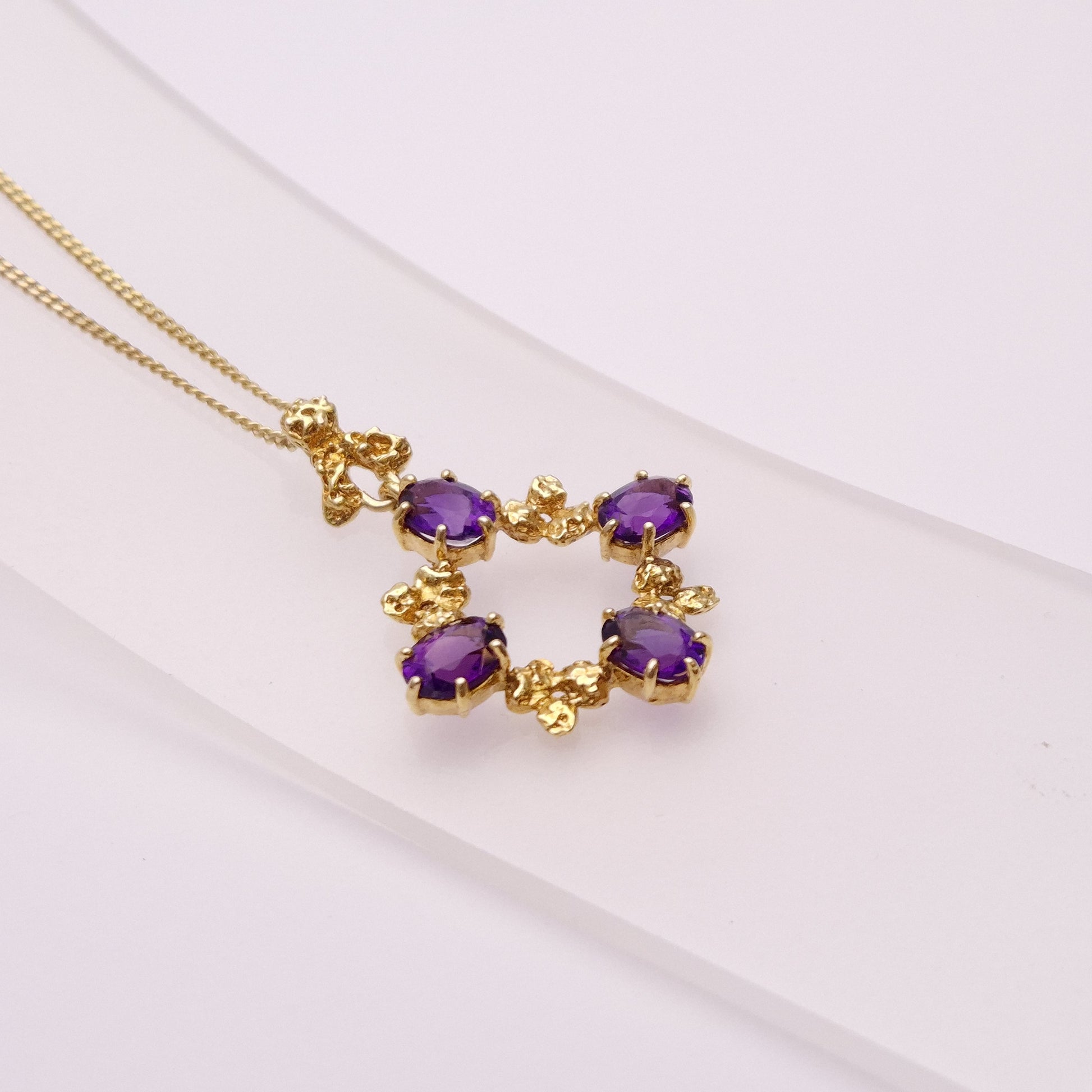 The centrepiece is a uniquely designed circular pendant crafted from 9ct yellow gold with a distinctive, organic nugget-like texture. Four vibrant, oval-cut amethyst stones are set around the perimeter, creating a beautiful contrast between the rough-hewn gold and the smooth, rich purple of the gemstones. The pendant hangs from a fine, delicate gold chain, allowing the intricate details and captivating colours to be the focal point. This necklace is a perfect statement piece for those who appreciate old-world craftsmanship and the unique charm of vintage-inspired jewellery.