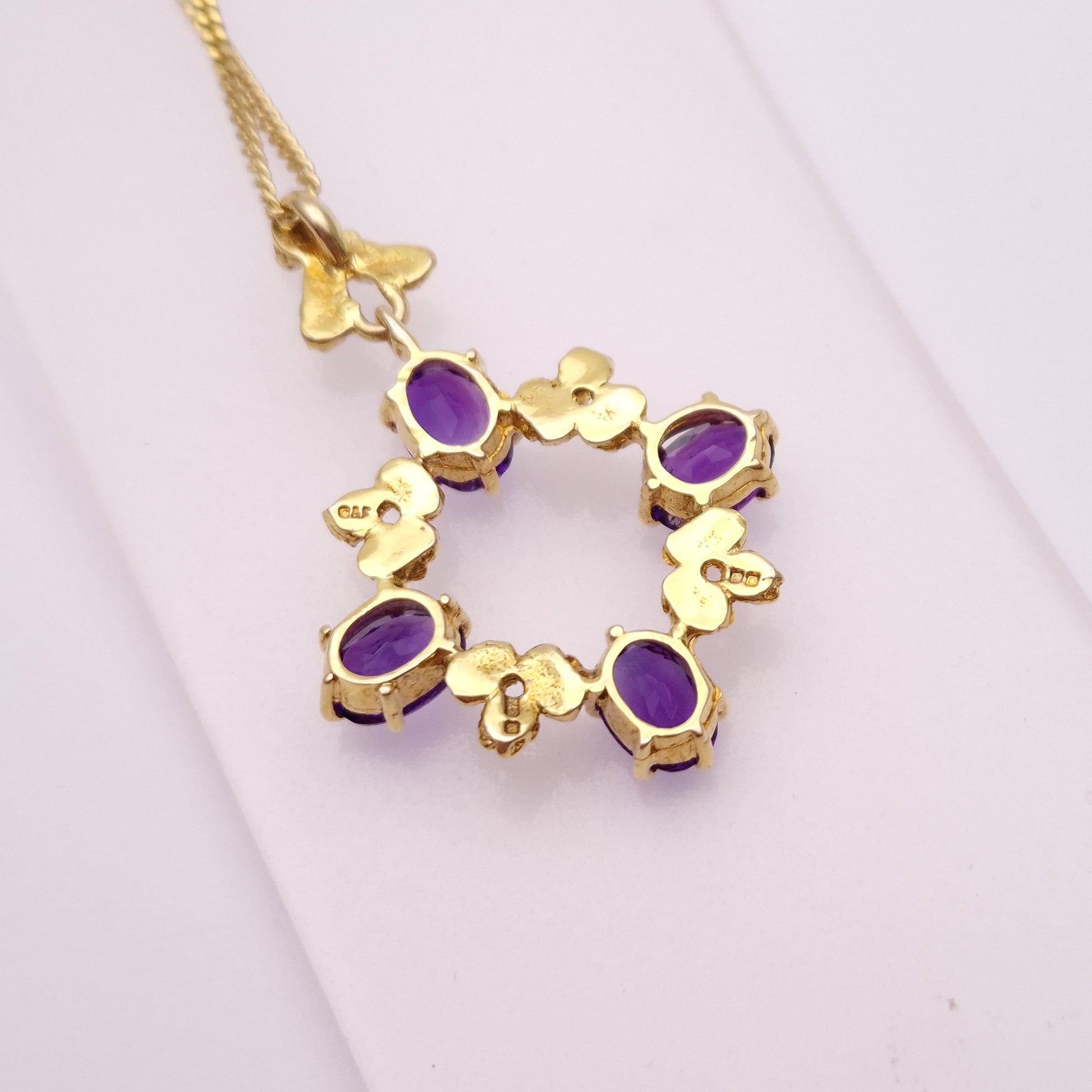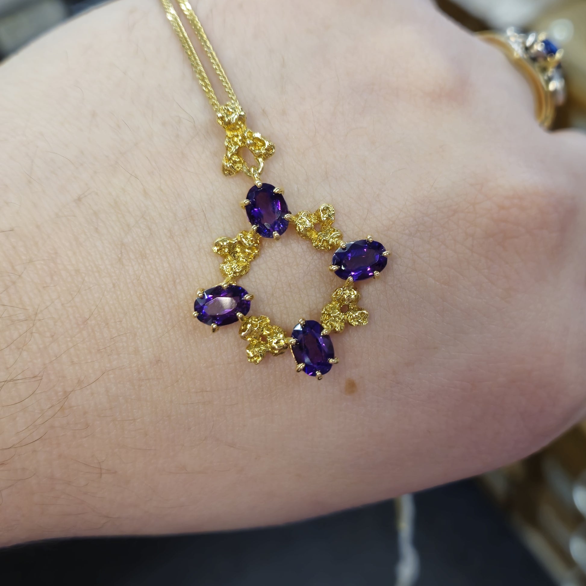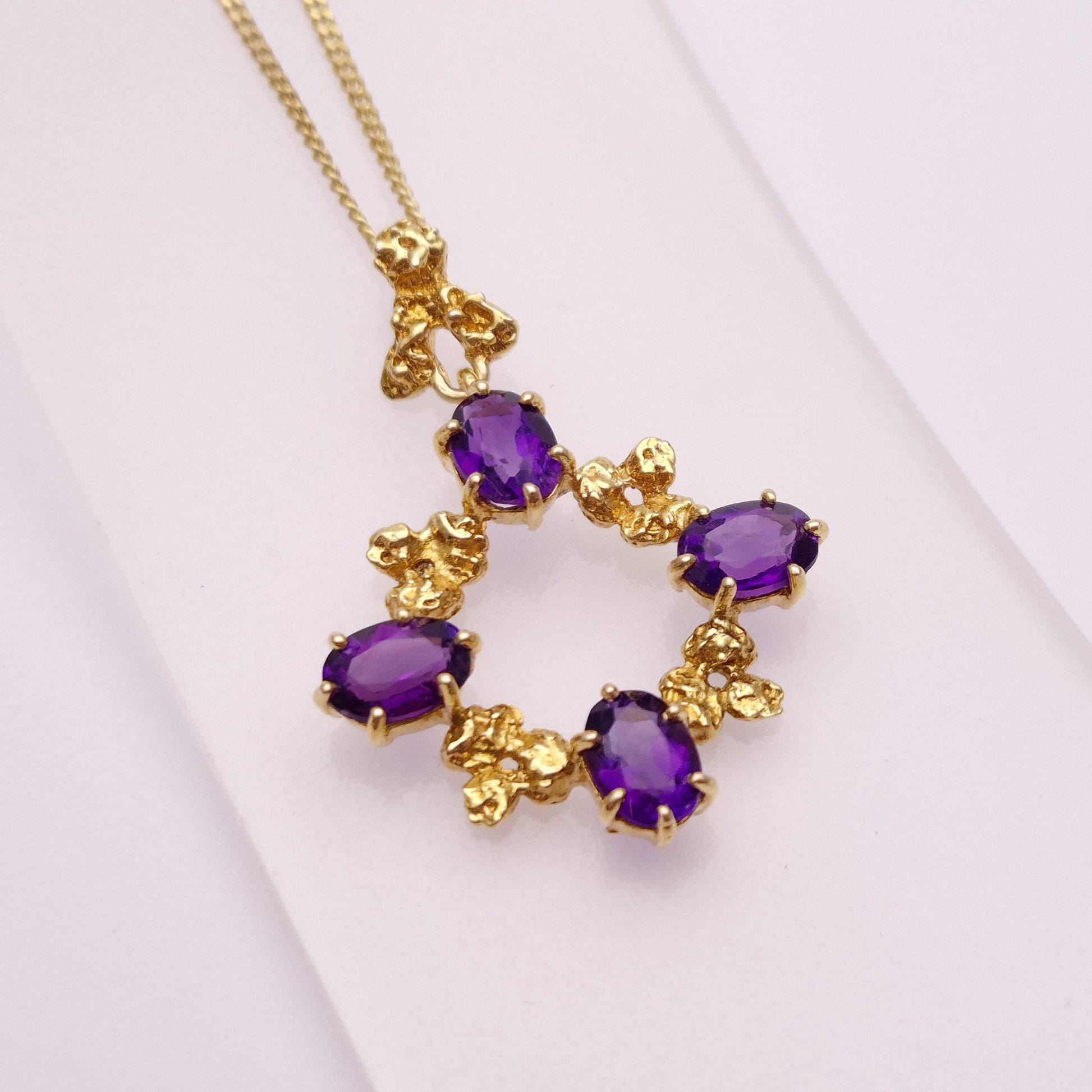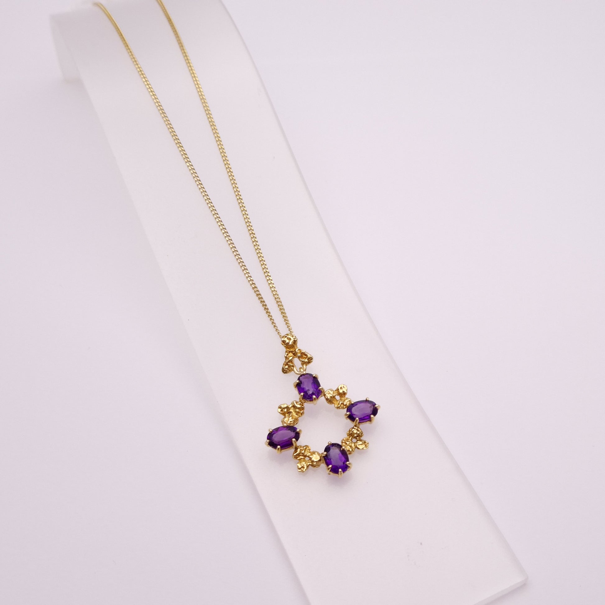 The centrepiece is a uniquely designed circular pendant crafted from 9ct yellow gold with a distinctive, organic nugget-like texture. Four vibrant, oval-cut amethyst stones are set around the perimeter, creating a beautiful contrast between the rough-hewn gold and the smooth, rich purple of the gemstones. The pendant hangs from a fine, delicate gold chain, allowing the intricate details and captivating colours to be the focal point. This necklace is a perfect statement piece for those who appreciate old-world craftsmanship and the unique charm of vintage-inspired jewellery.