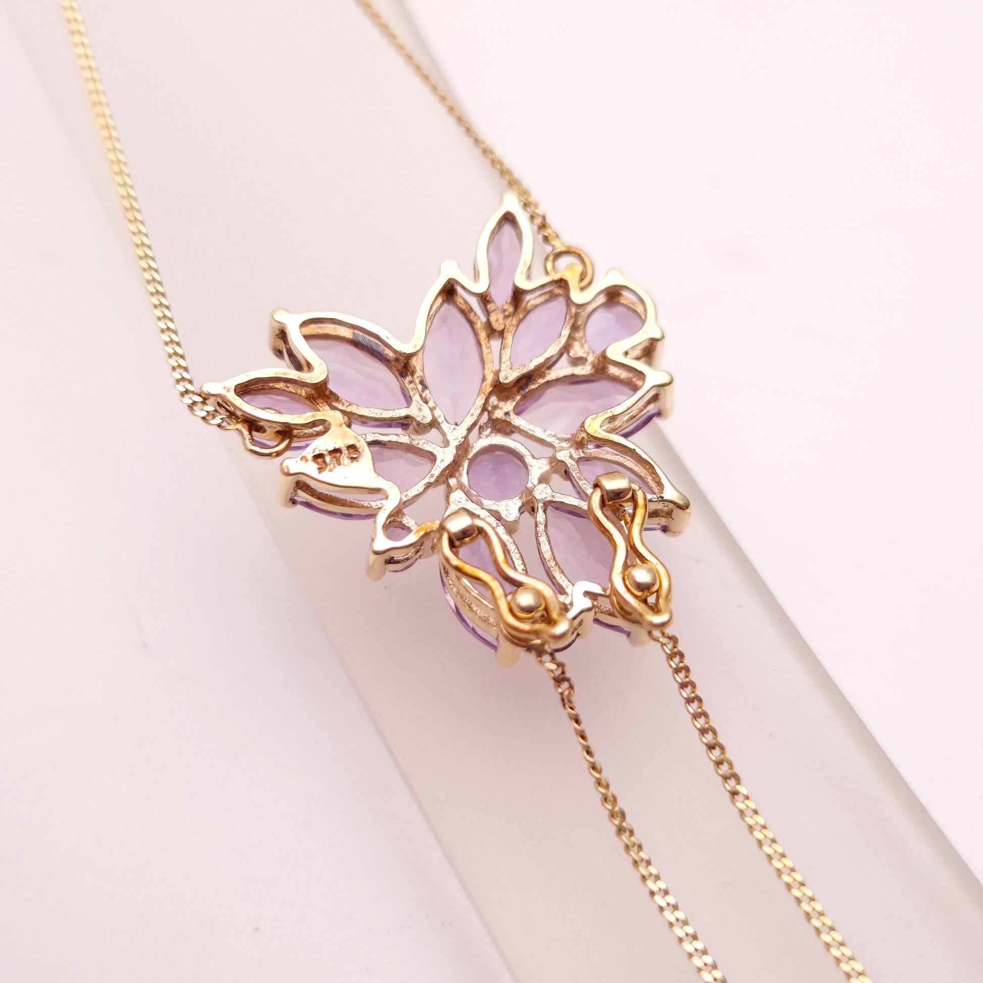 The focal point of the necklace is a vibrant amethyst cluster. Each individual amethyst, varied between marquise and round cuts, displays a gorgeous lilac hue, set in warm 9ct yellow gold. Adding to its versatility are two exquisite removable briolette-cut amethyst drops. These tear-shaped, faceted amethyst drops are designed to be easily attached or detached from back of the main pendant by clips. Wear them for a more dramatic, elongated look, or remove them for a simpler, more understated pendant style. The polished facets of the briolettes catch the light beautifully, adding an extra dimension of sparkle and movement.