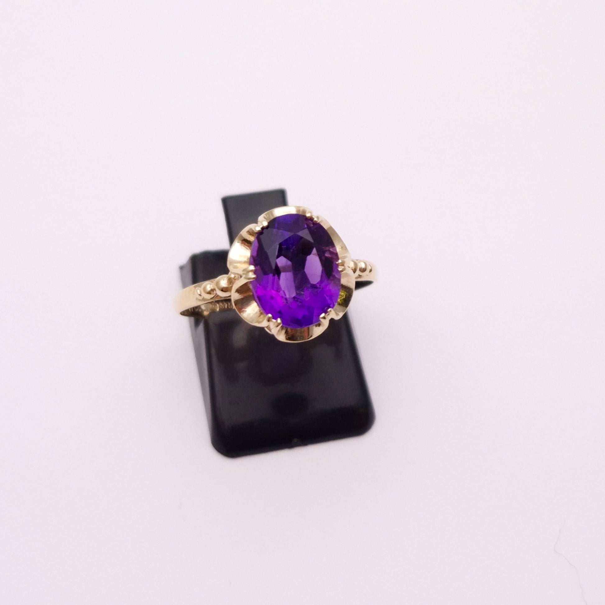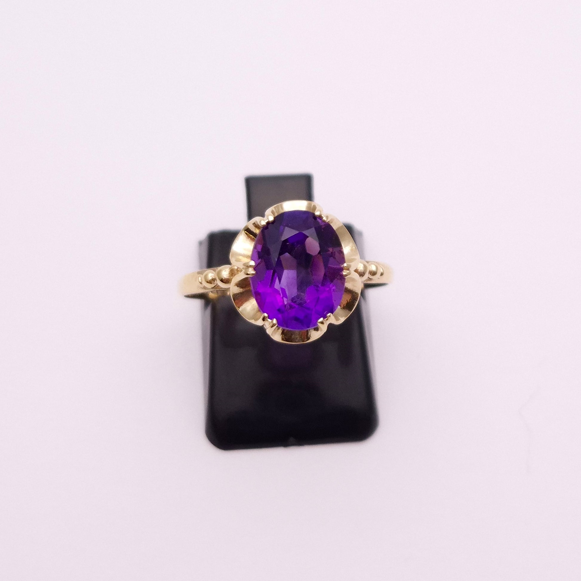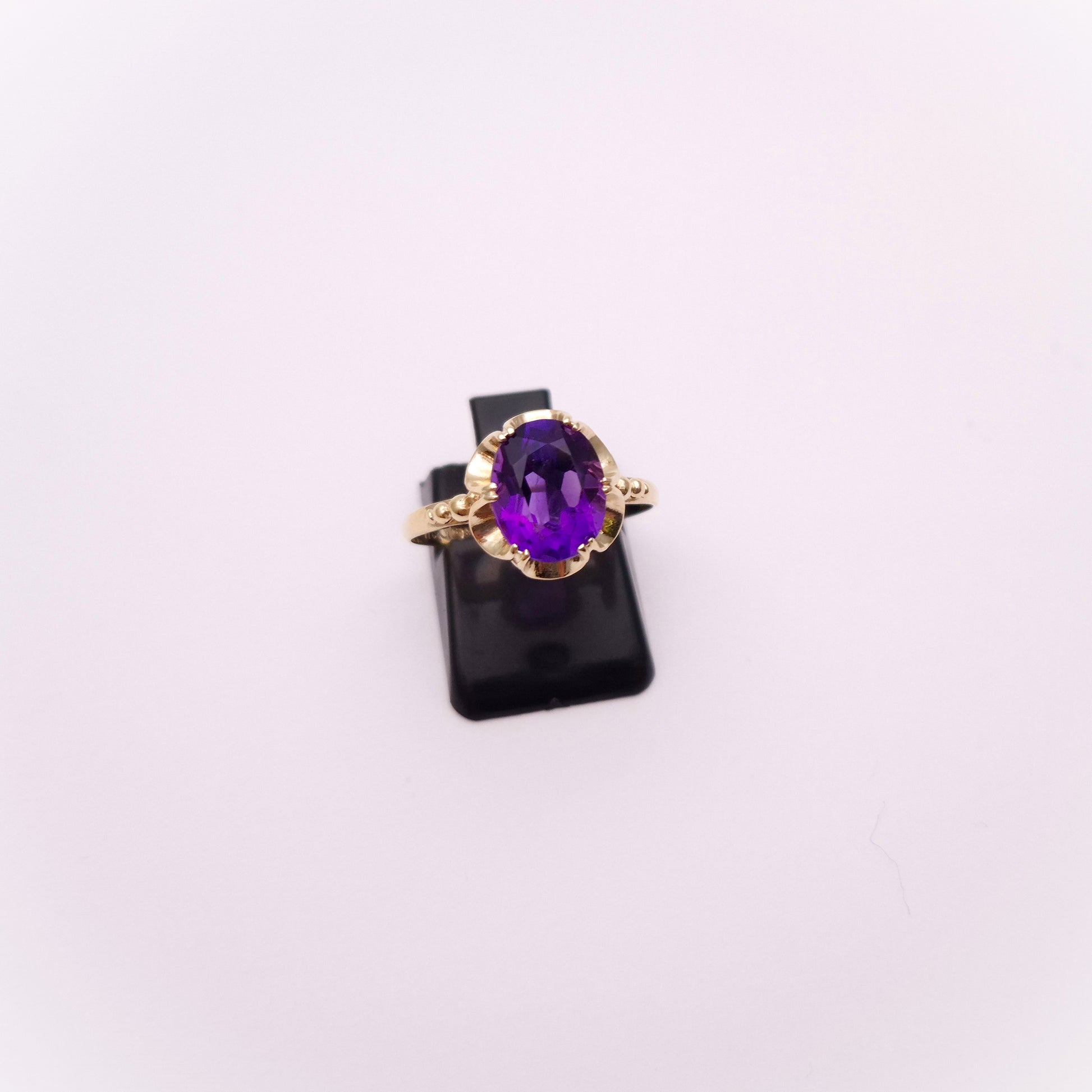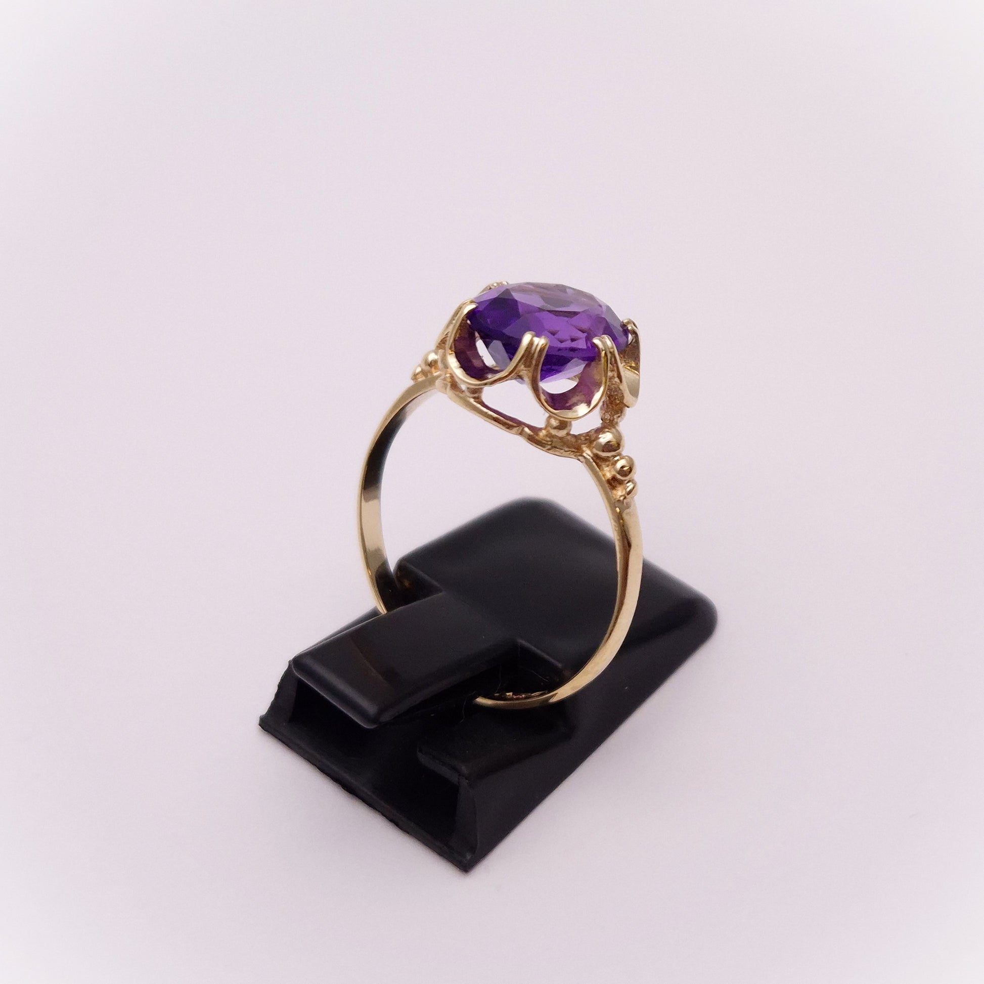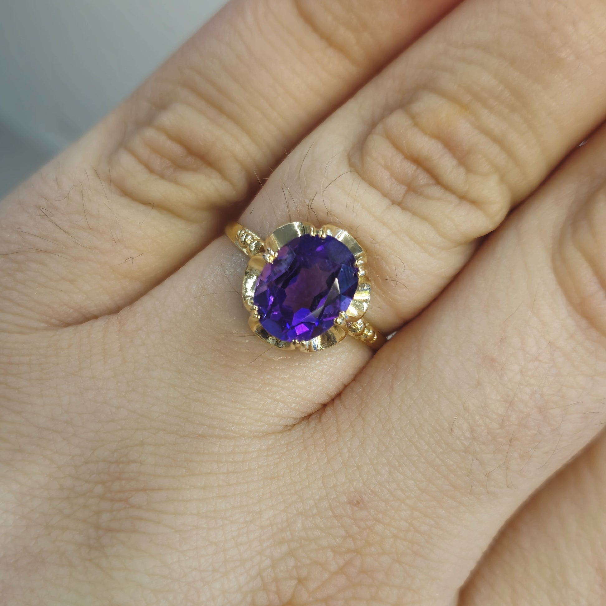This lovely ring is made from 9ct yellow gold and is a classic Victorian gypsy style setting with a large oval cut amethyst stone set to the centre. The scalloped edge style design is a lovely feature and the shoulders also feature some detailing in the form of some small balls. The shank is plain polished yellow gold.