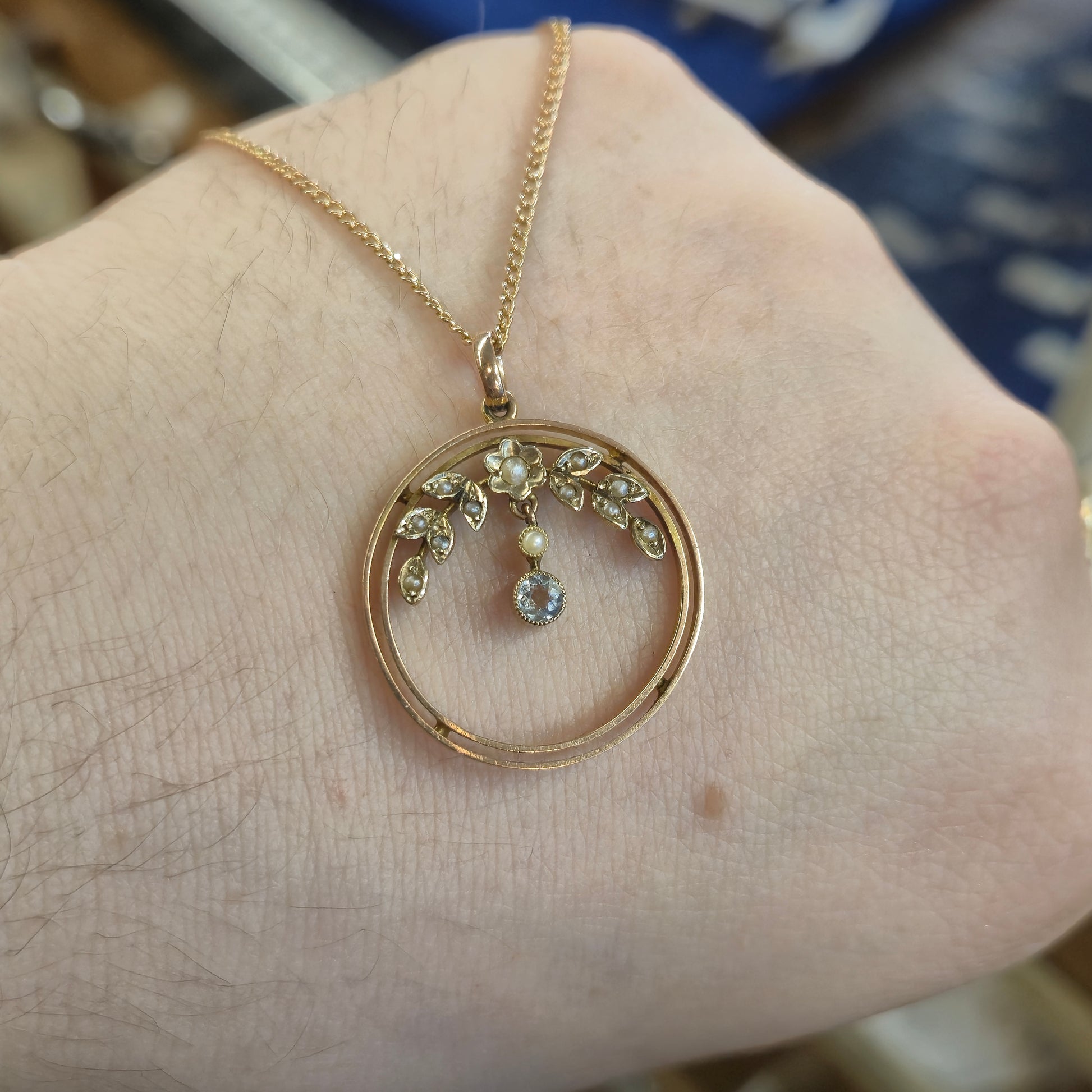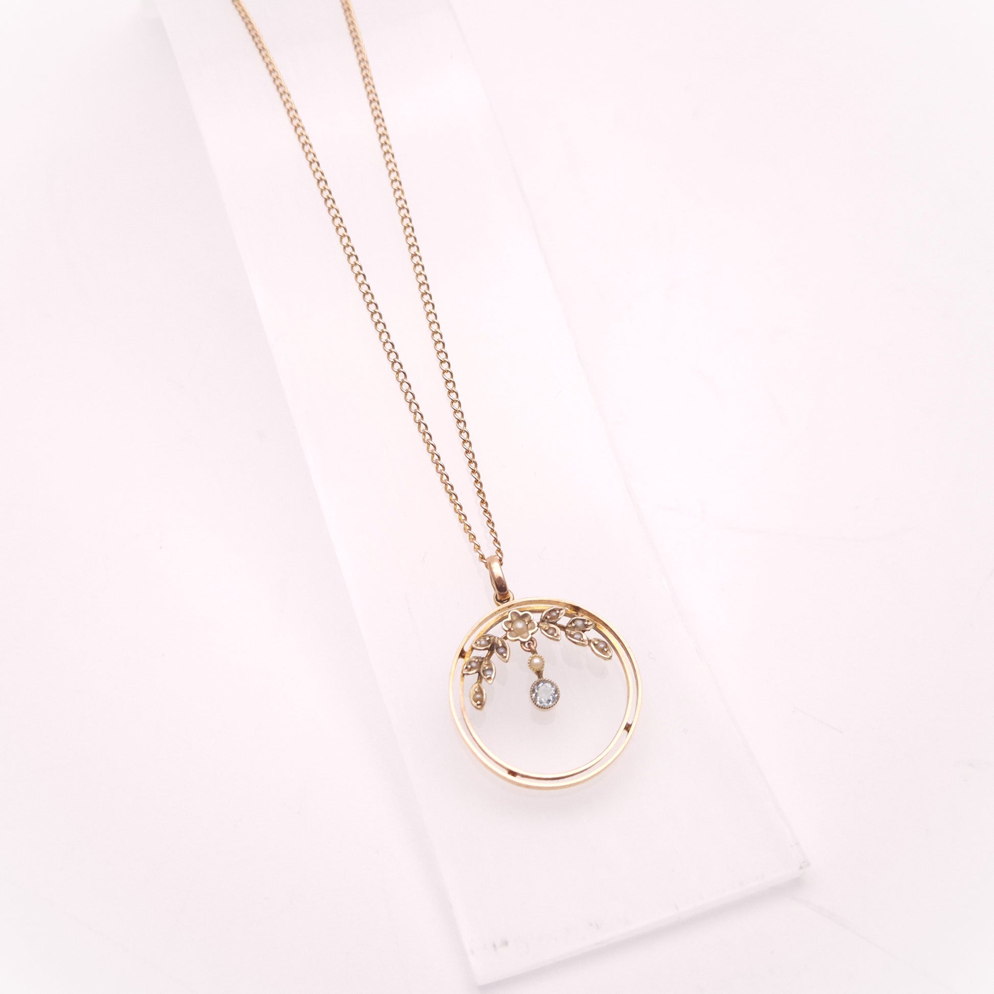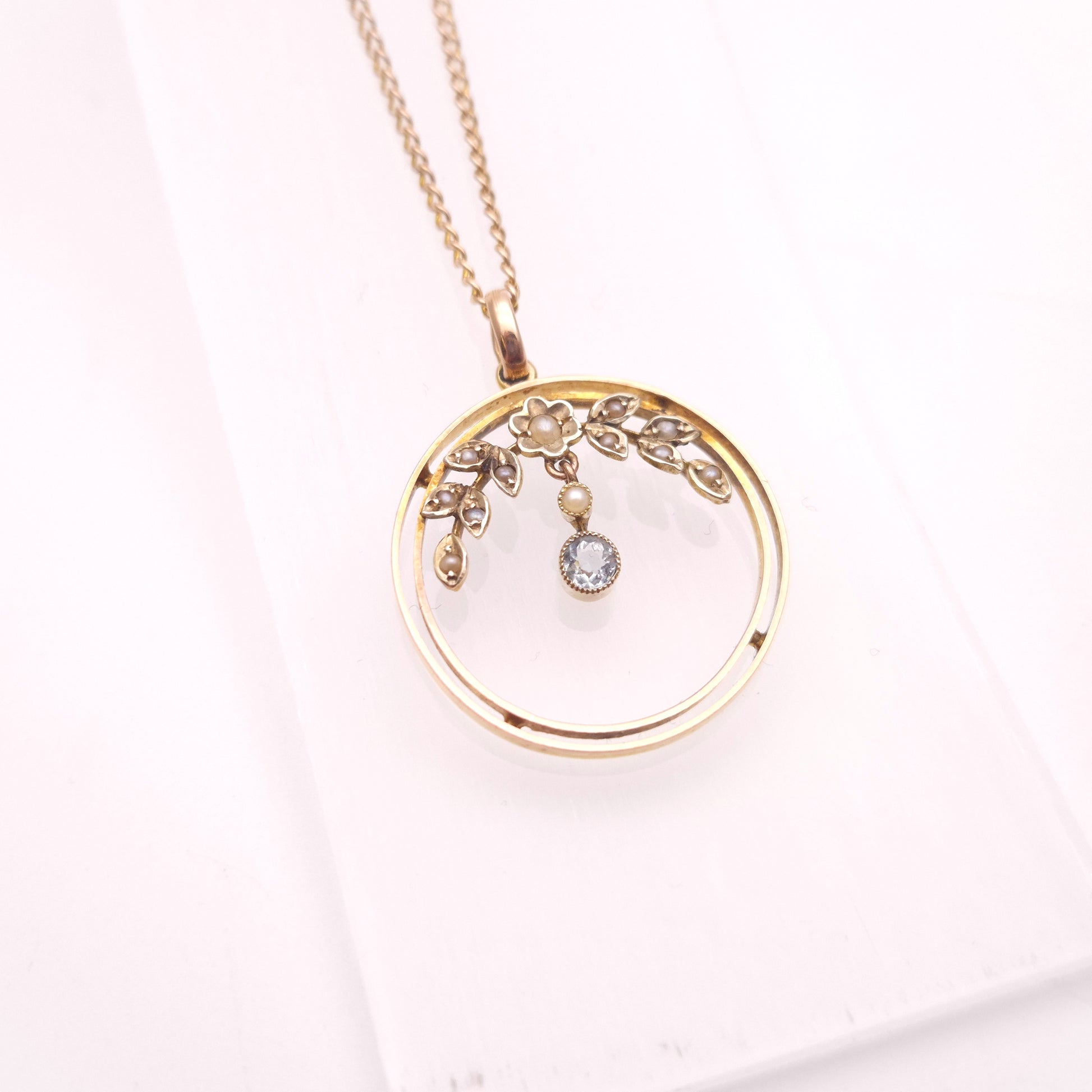 The pendant features intricate openwork, embodying the elegant curves characteristic of the Art Nouveau style. The entire circular openwork frame is delicately adorned with numerous small, creamy seed pearls in foliate details, which add soft texture and a touch of classic elegance. The design showcases a small drop to the centre of the pendant with pearls and a small round cut Aquamarine that exhibits a gorgeous, light blue hue, which is set to move freely and add shimmering movement when worn. The pendant hangs from a fine yellow gold chain, making it ready to wear straight out of the box.