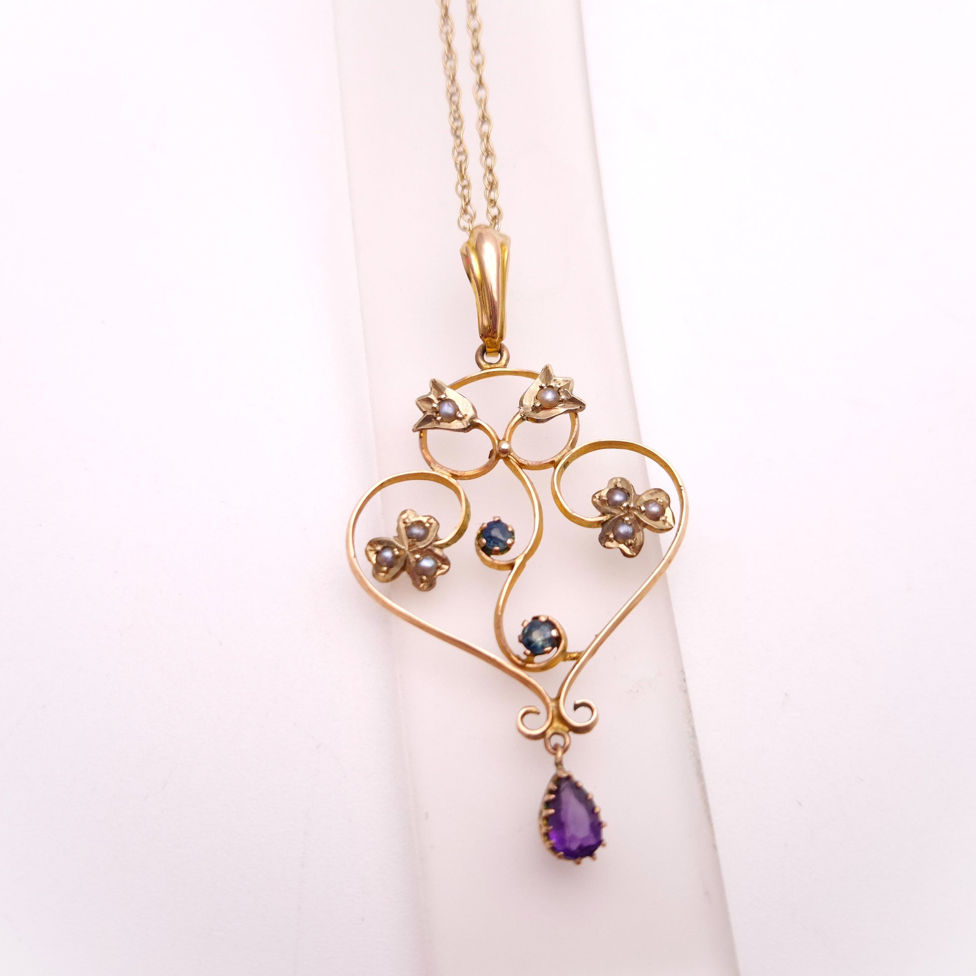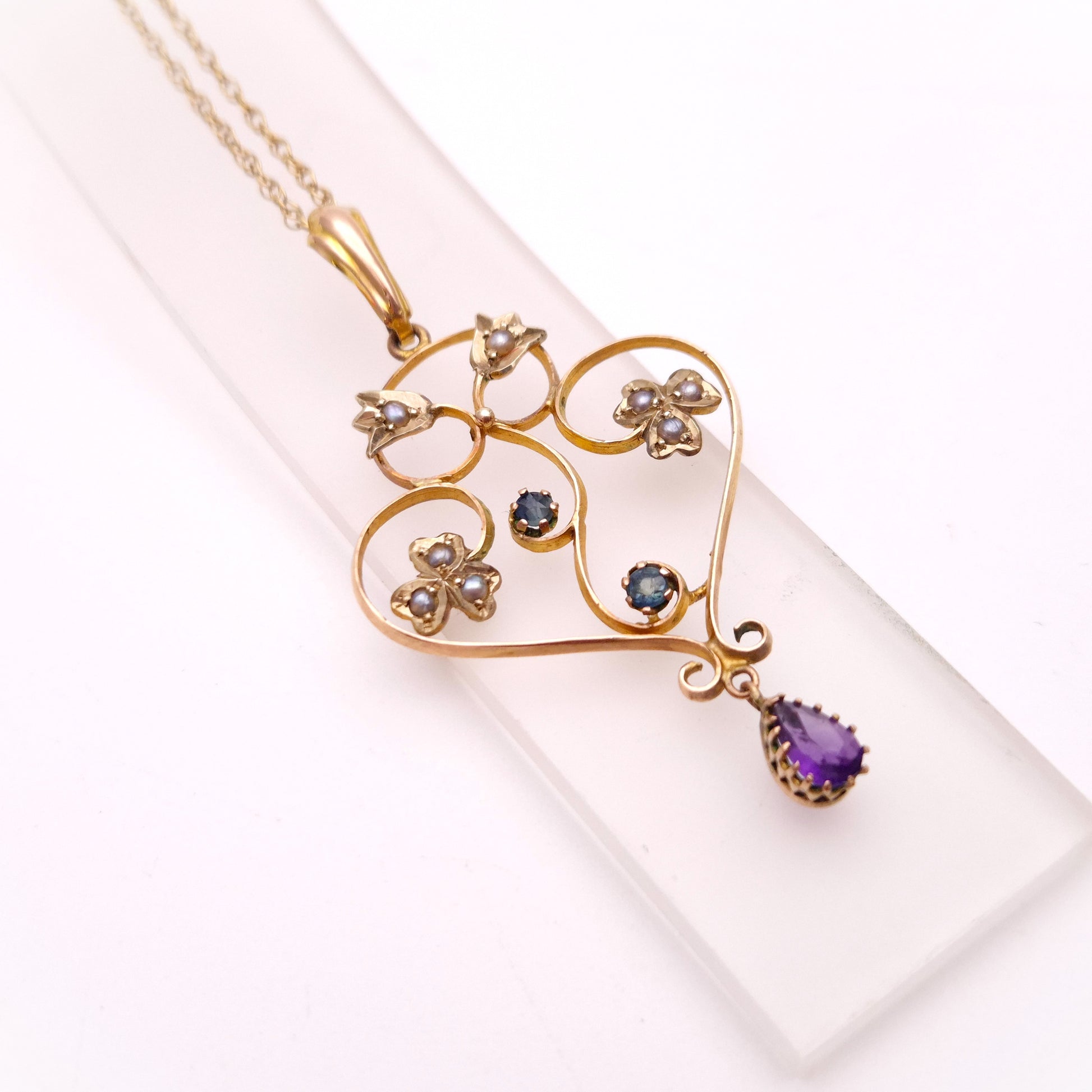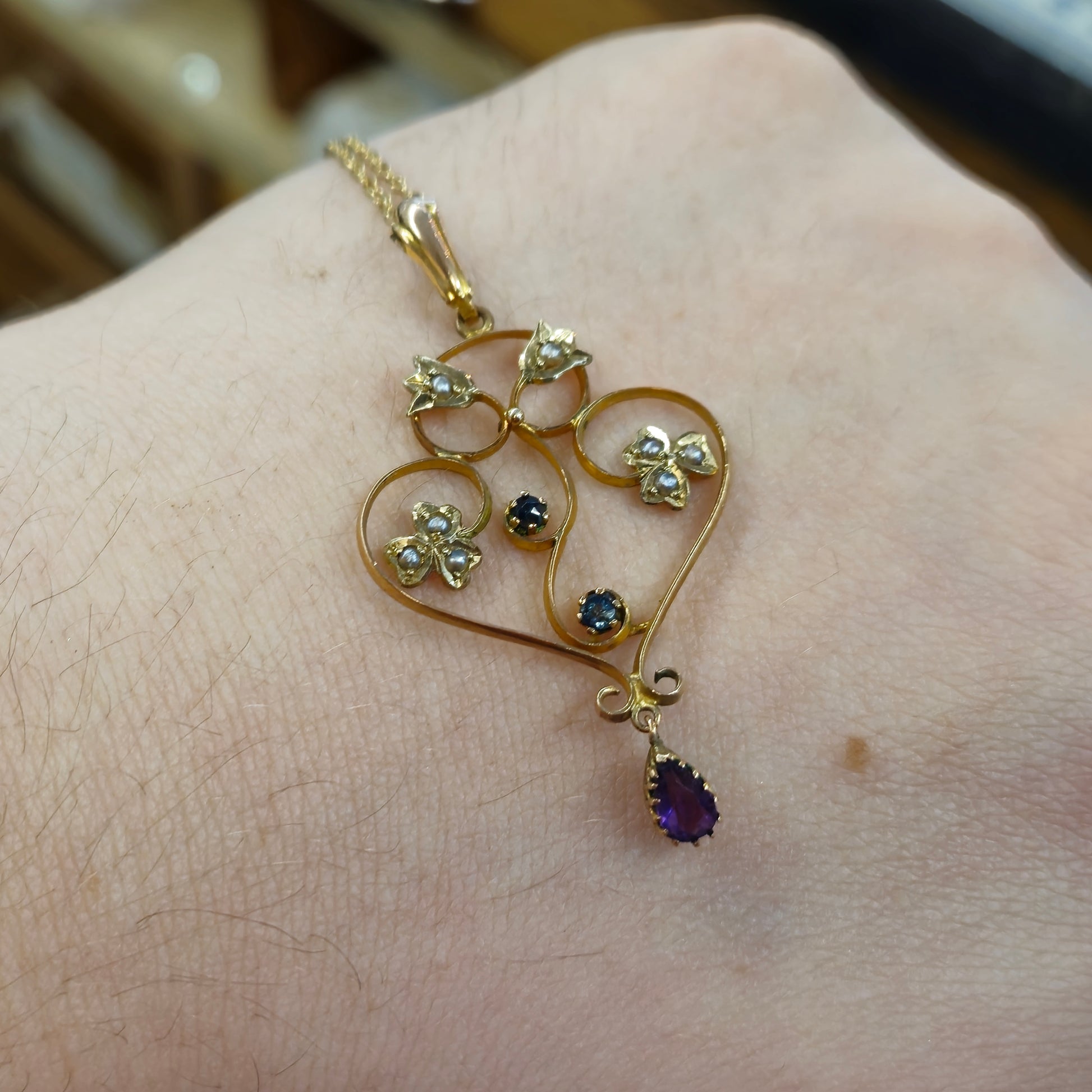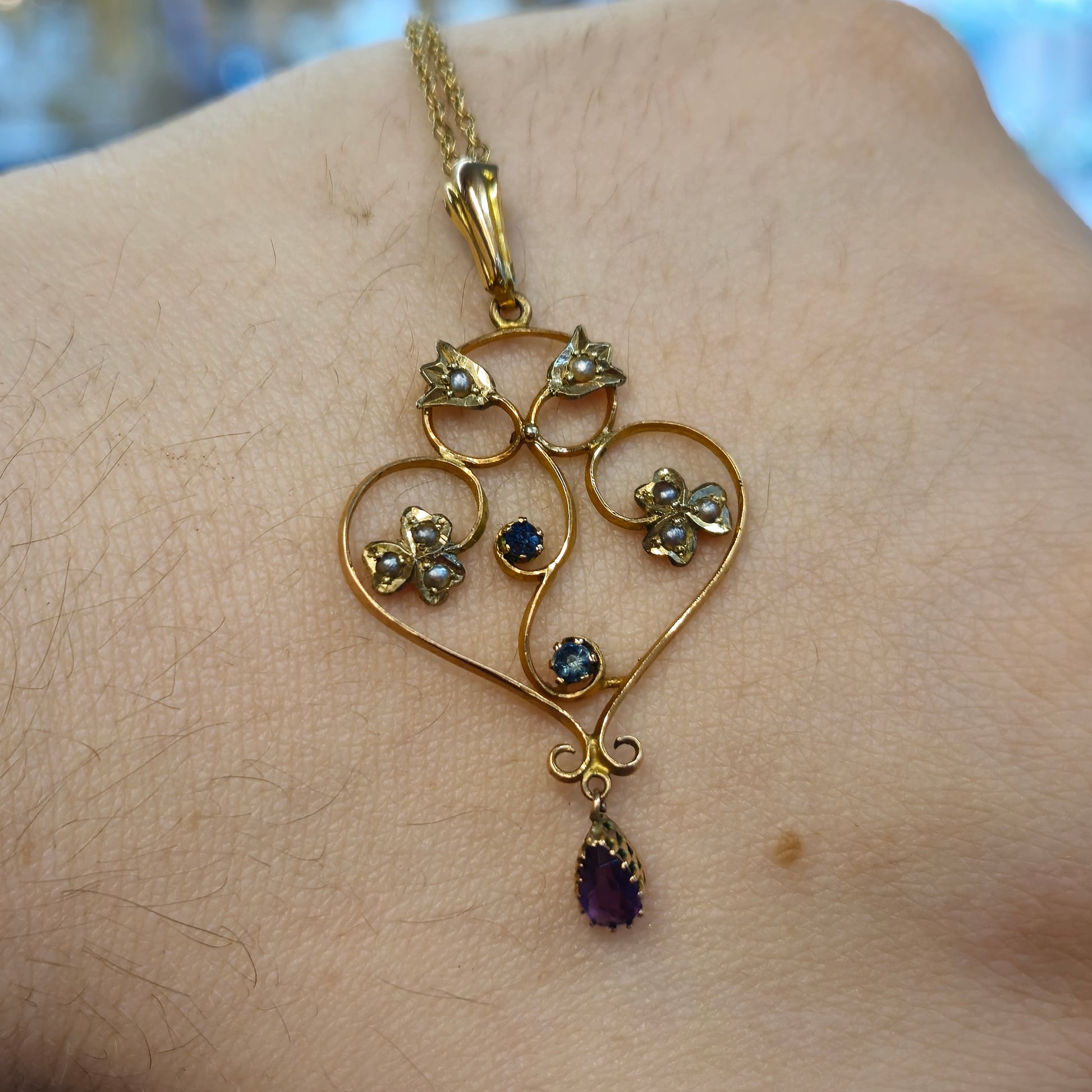The openwork heart-shaped design is crafted in warm 9ct yellow gold, its flowing lines adorned with shimmering seed pearls arranged in charming floral motifs. Adding a touch of vibrant colour are two round-cut sapphires, their deep blue hues providing a lovely contrast to the gold and pearls. Suspended below, a pear-shaped amethyst dangles with a rich purple glow, catching the light with every movement.