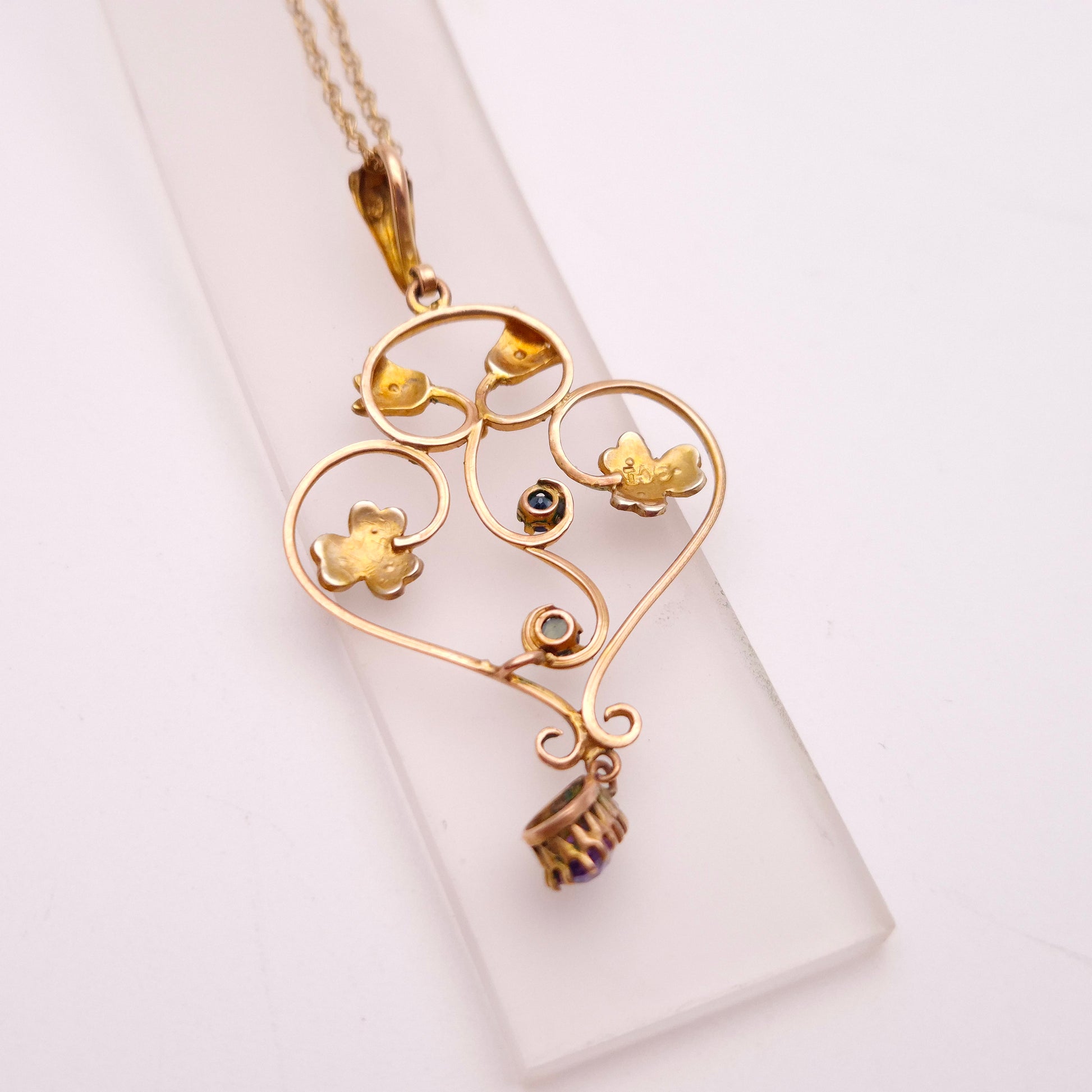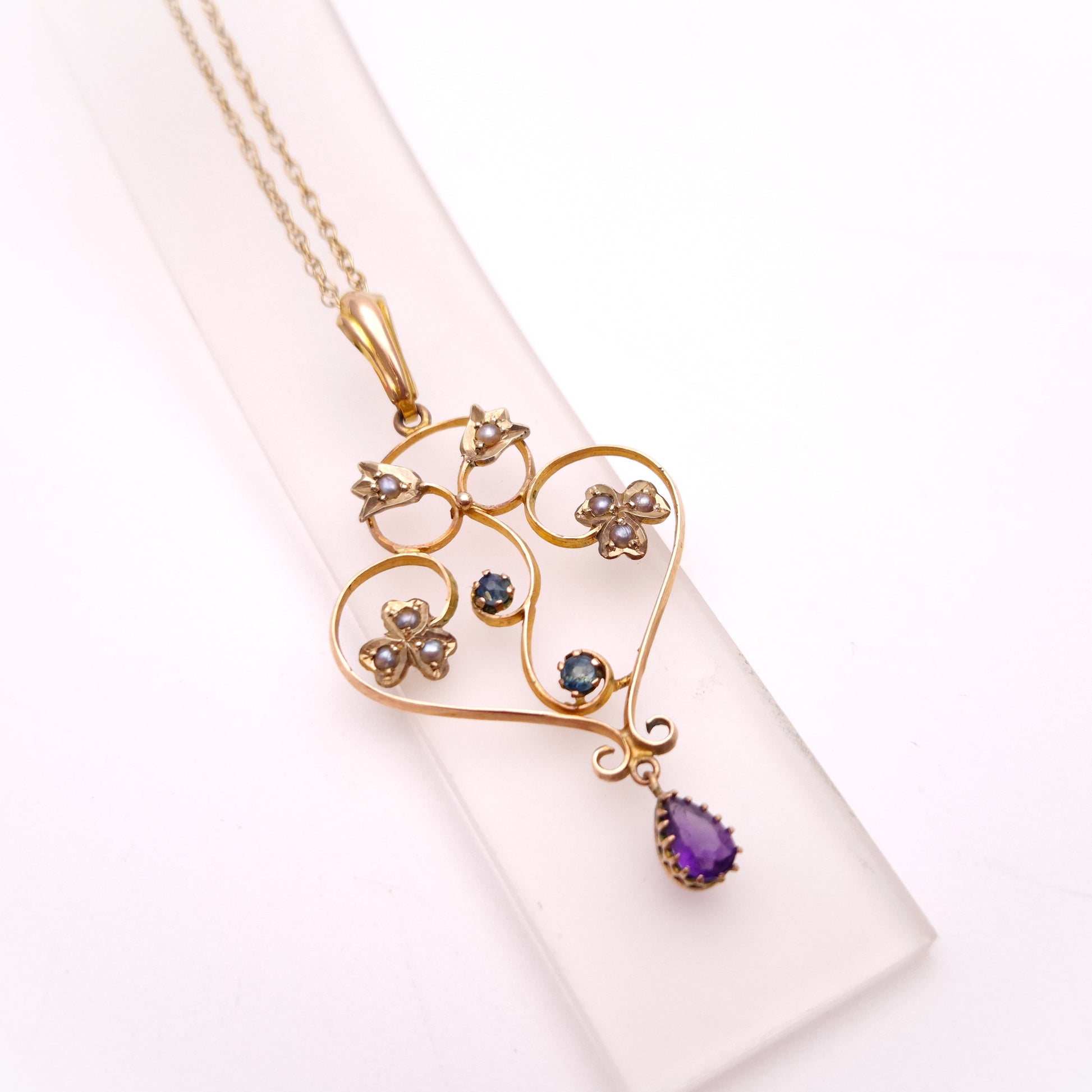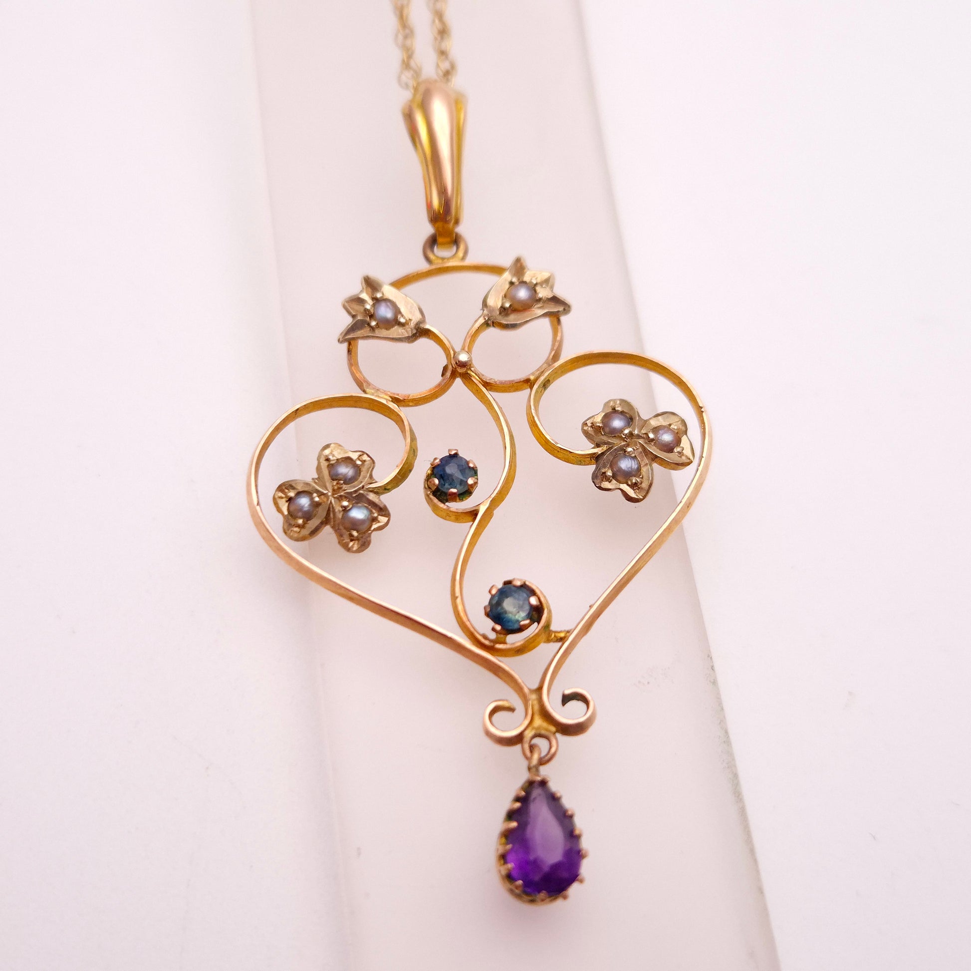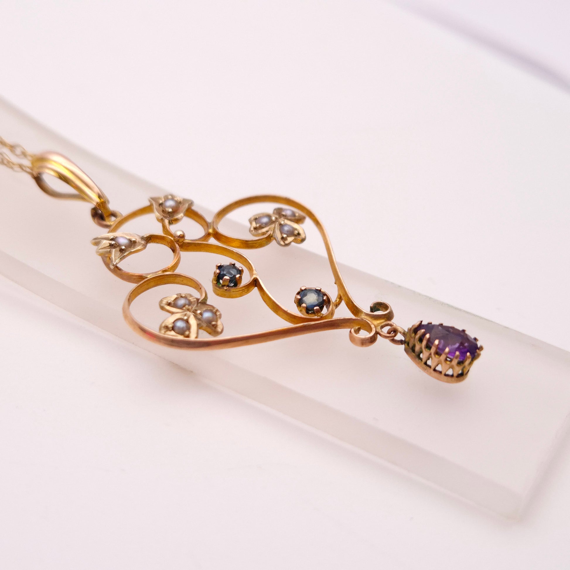 The openwork heart-shaped design is crafted in warm 9ct yellow gold, its flowing lines adorned with shimmering seed pearls arranged in charming floral motifs. Adding a touch of vibrant colour are two round-cut sapphires, their deep blue hues providing a lovely contrast to the gold and pearls. Suspended below, a pear-shaped amethyst dangles with a rich purple glow, catching the light with every movement.