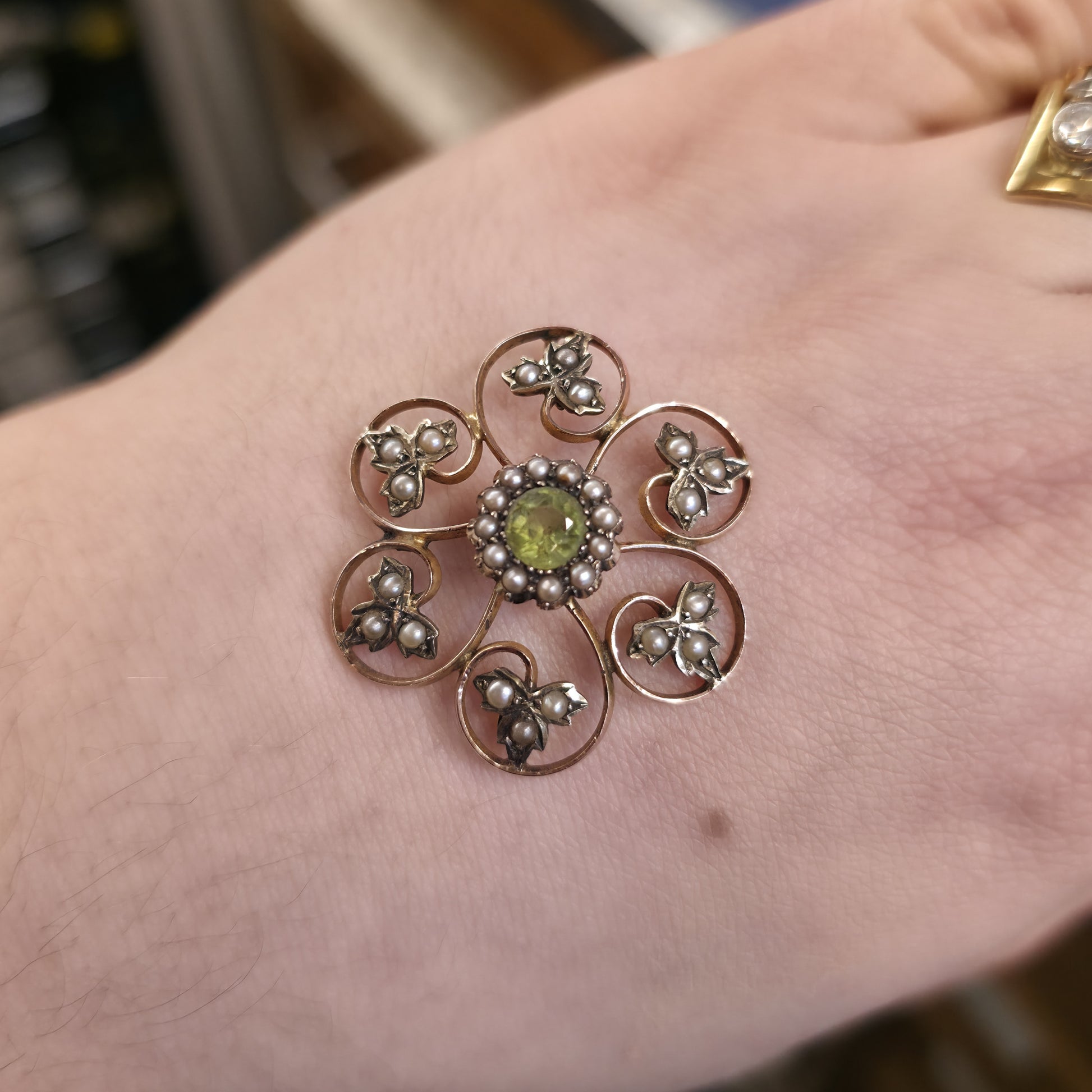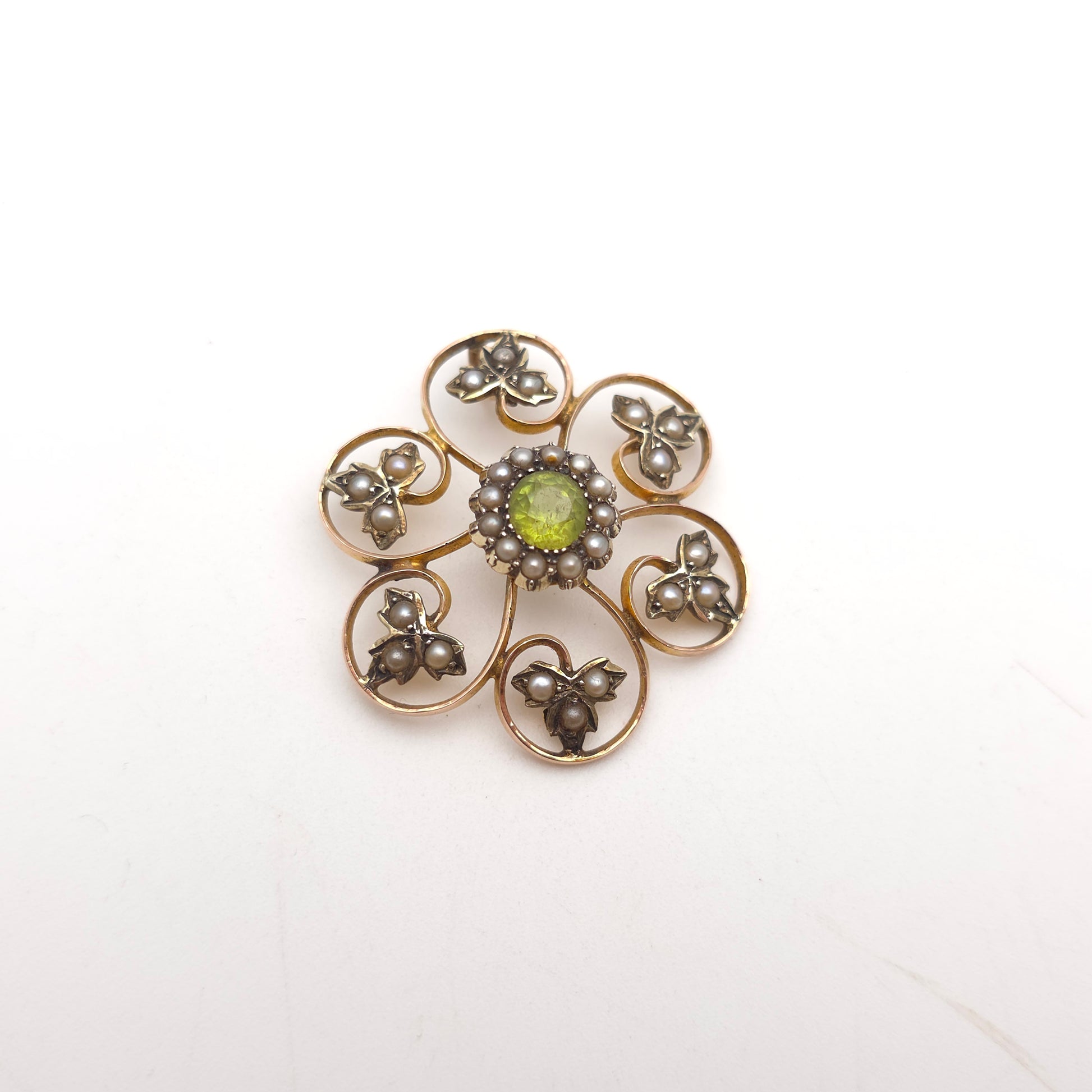 9ct Yellow Gold Antique Large Peridot and Pearl Foliate Leafy Pendant Piece