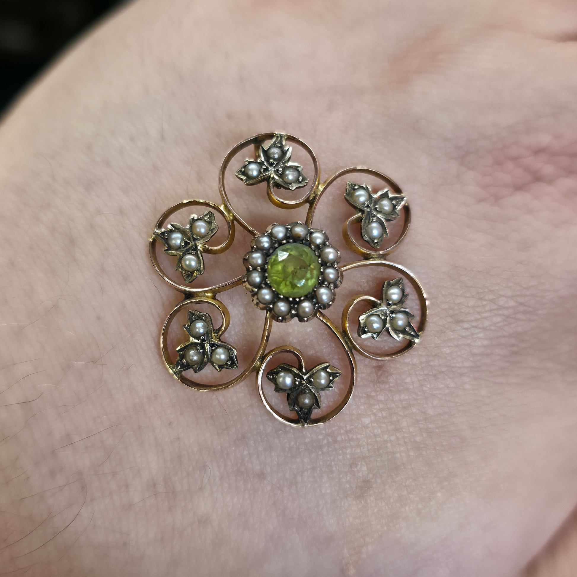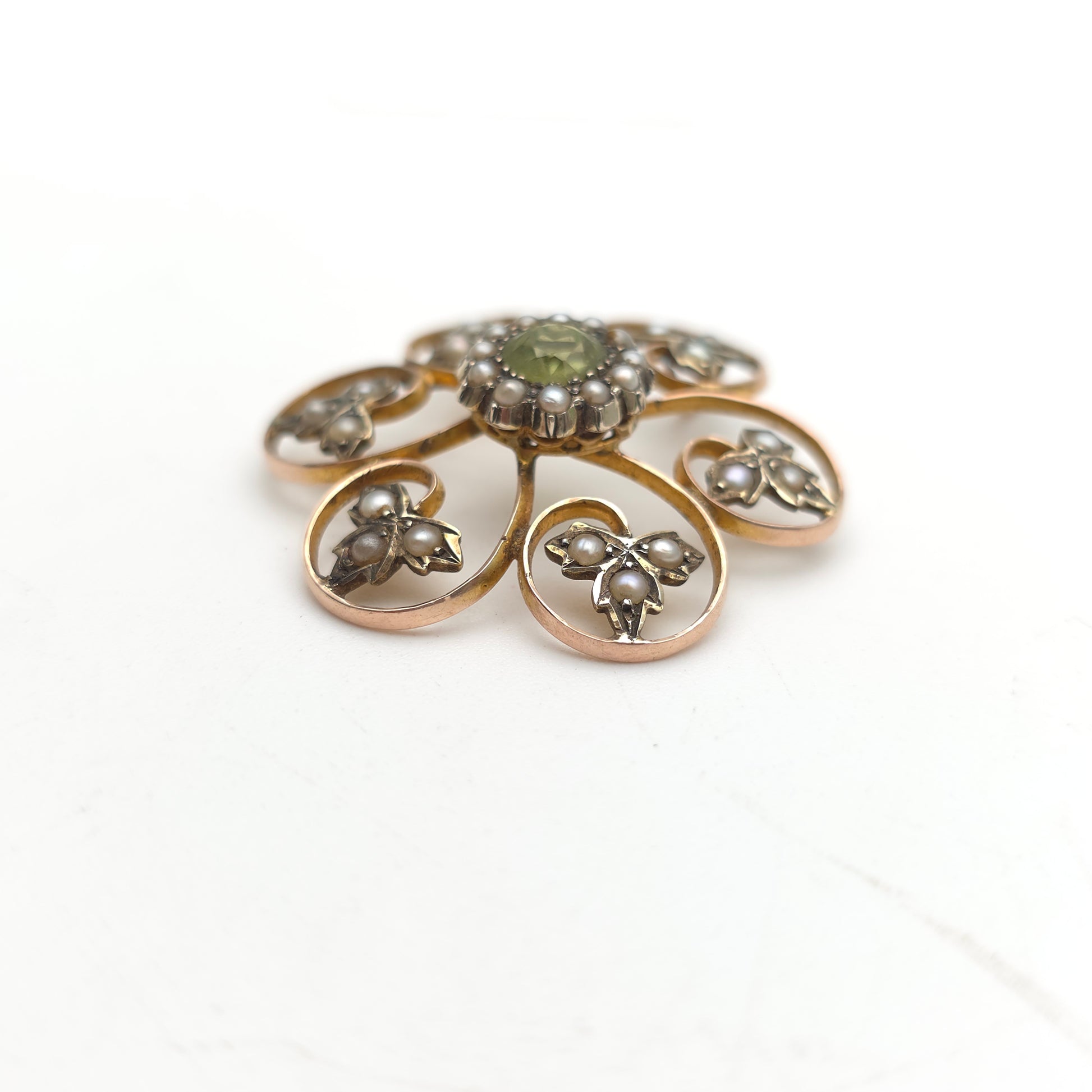 The central cluster is framed by an intricate floral foliate design. Six elegant gold "swirls" emanate from the centre, each blossoming into a triple-leaf motif set with additional seed pearls. This symmetrical, openwork design is a hallmark of high-quality antique jewellery, representing the harmony and organic beauty of the natural world. Crafted in rich, warm 9ct yellow gold, the piece is incredibly detailed and displays the refined delicacy typical of early 20th-century artisan work. While currently featuring a pin and safety clasp for use as a brooch, its balanced circular design makes it an ideal candidate for a simple conversion into a statement pendant.