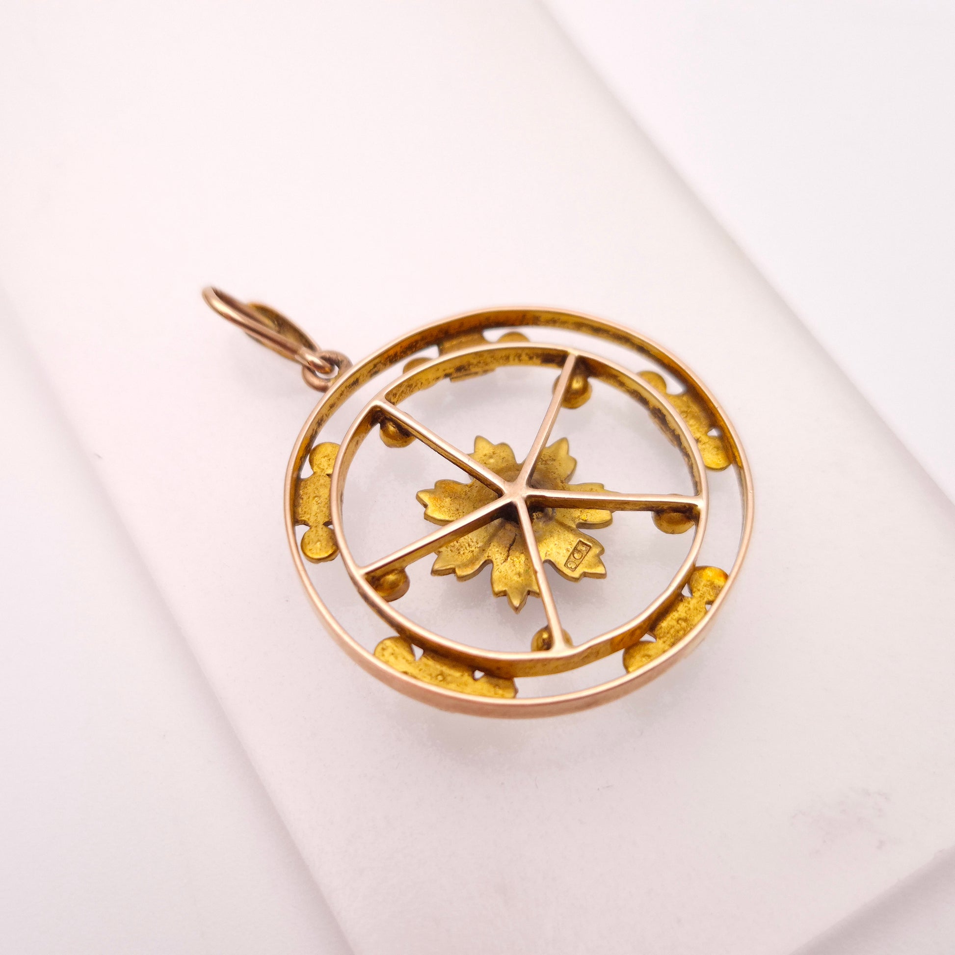The pendant is composed of a circular frame, within which a delicate, stylized flower is set. The flower's centre is adorned with a creamy pearl which has lost some of the nacre, and its petals are represented by further small, lustrous pearls. A ring of small pearls and turquoise stones follows the outer gold circle, creating a sense of balance and harmony. The use of turquoise and pearls together was a popular combination during this era, representing a graceful and natural aesthetic.