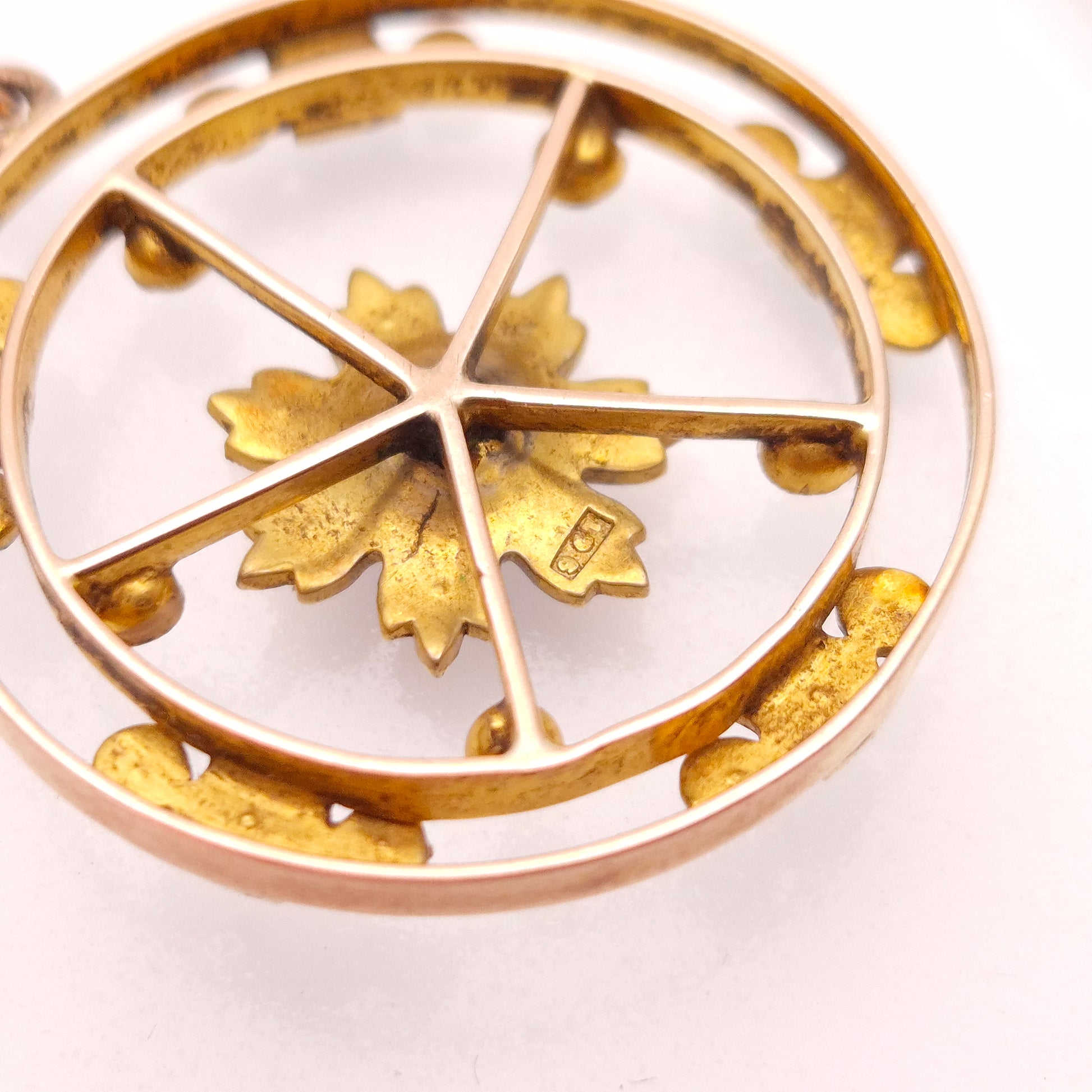 This is a beautiful and intricate antique pendant, crafted in warm 9ct yellow gold. It has a classic Art Nouveau design, characterized by its flowing, organic lines and floral motifs.