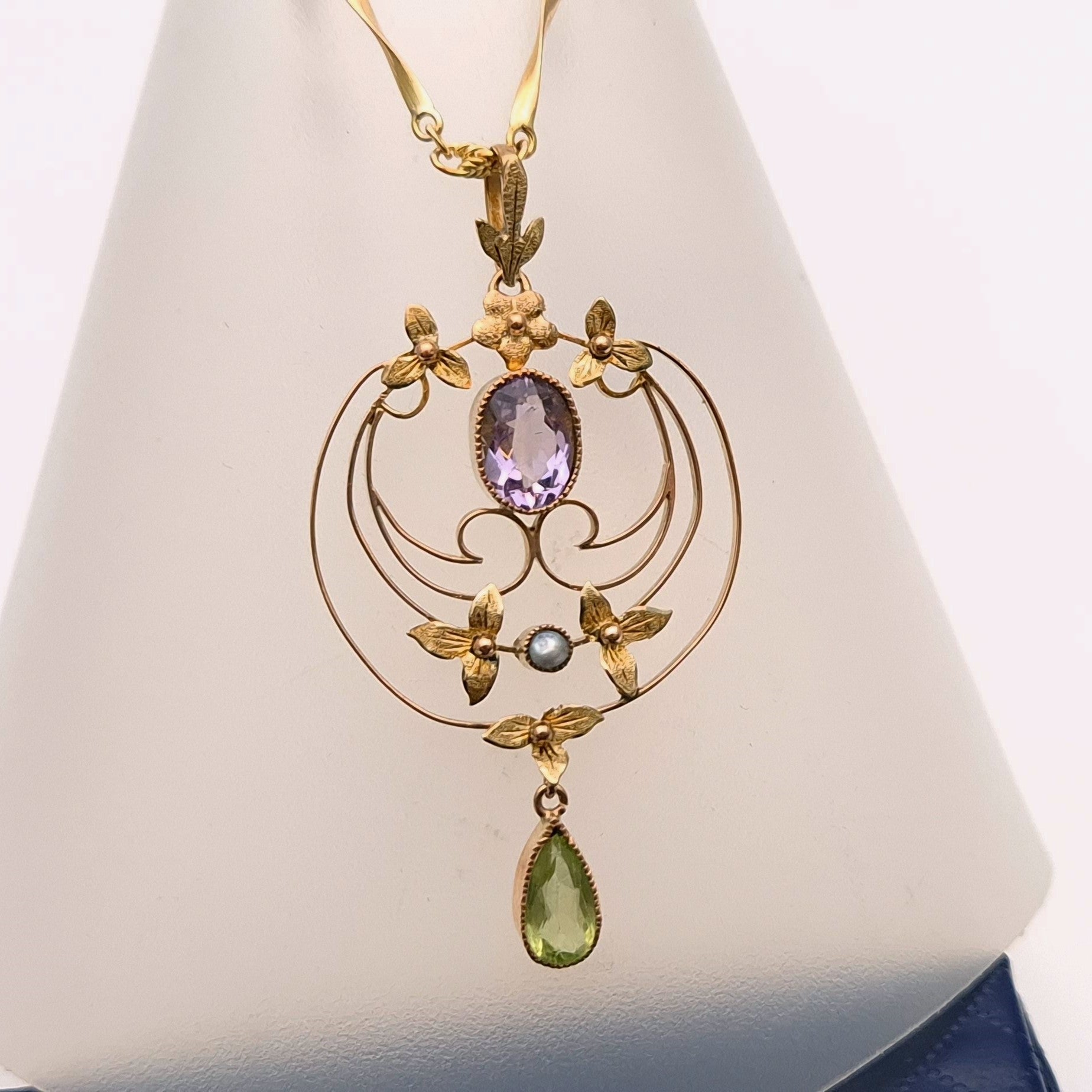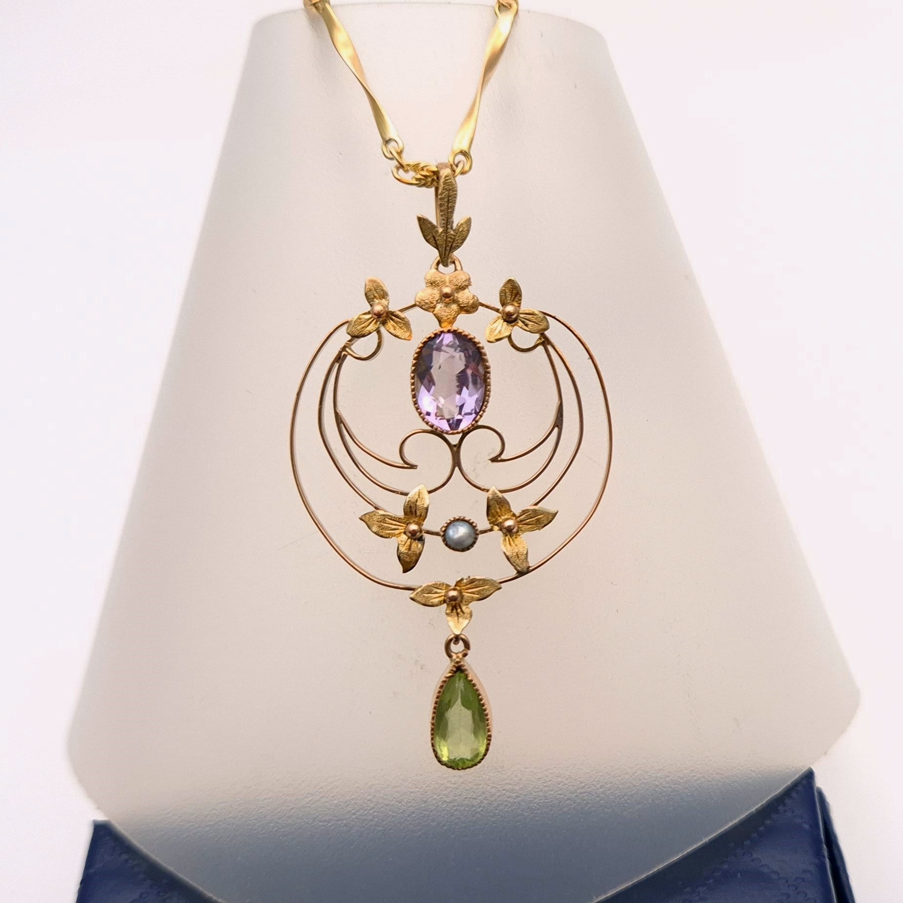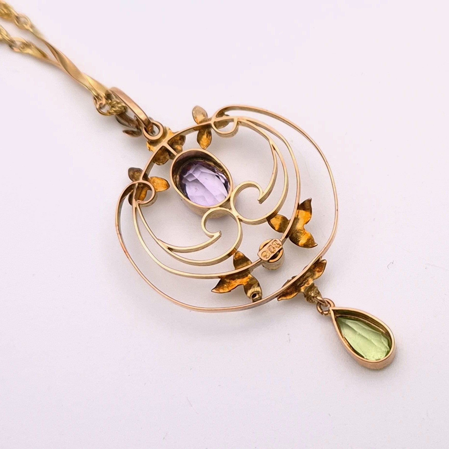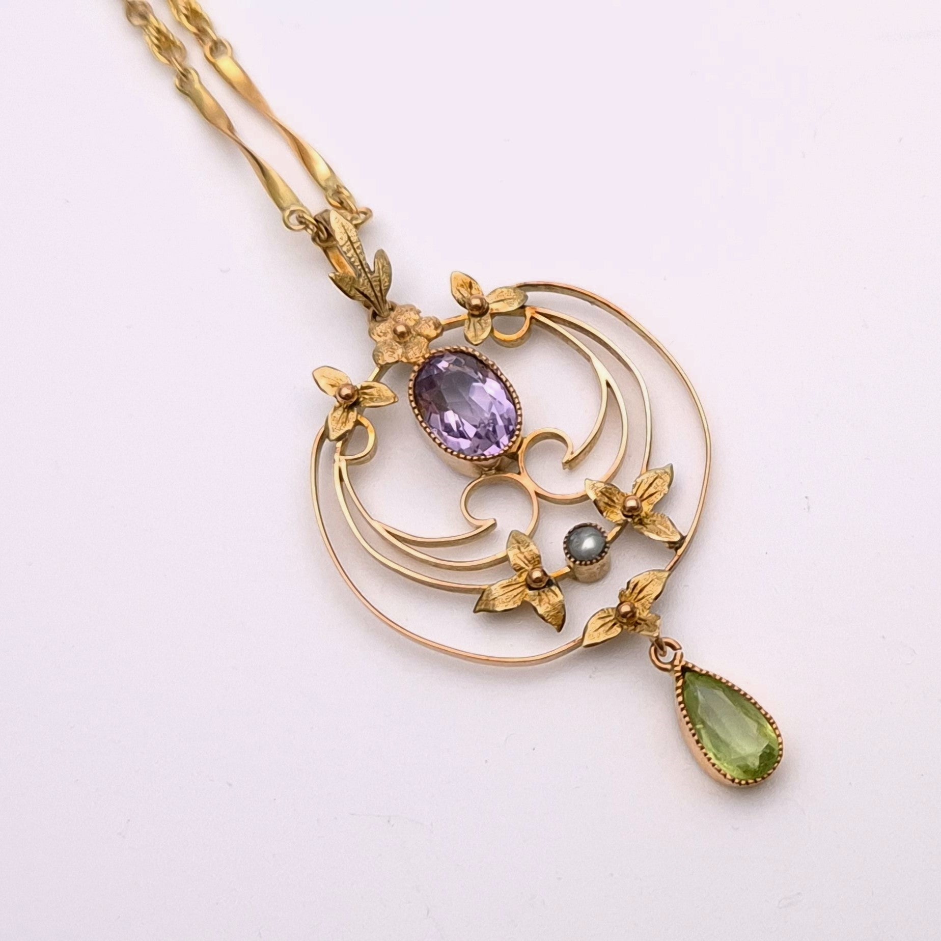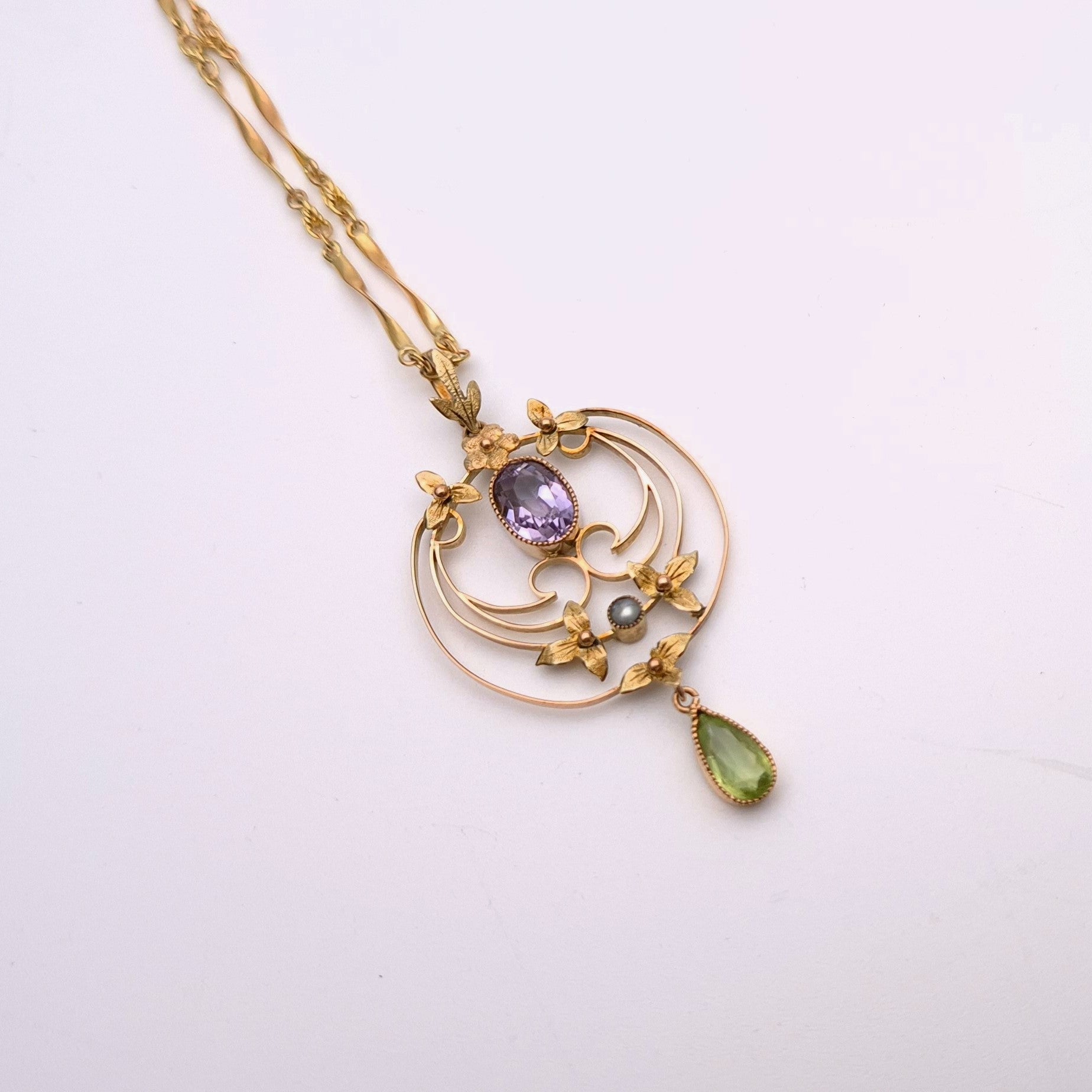 9ct Yellow Gold Art Nouveau Amethyst, Peridot and Pearl Necklace