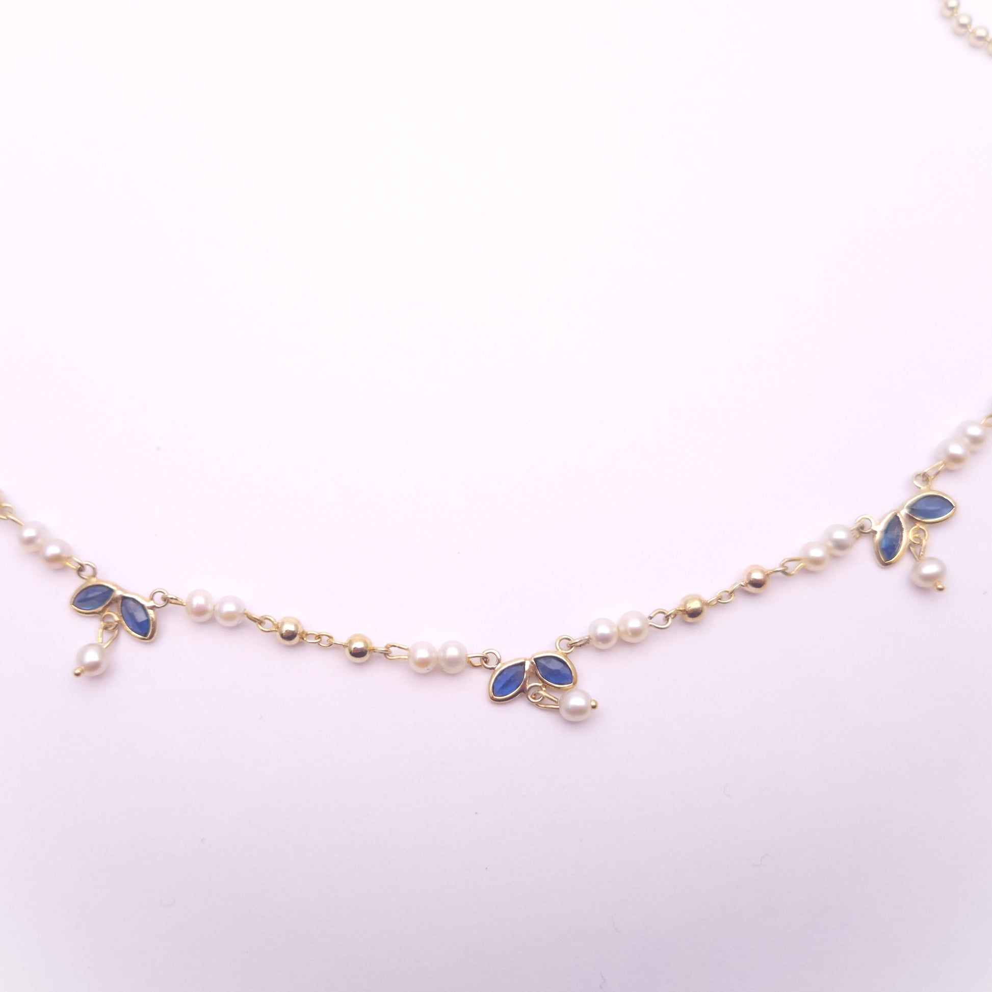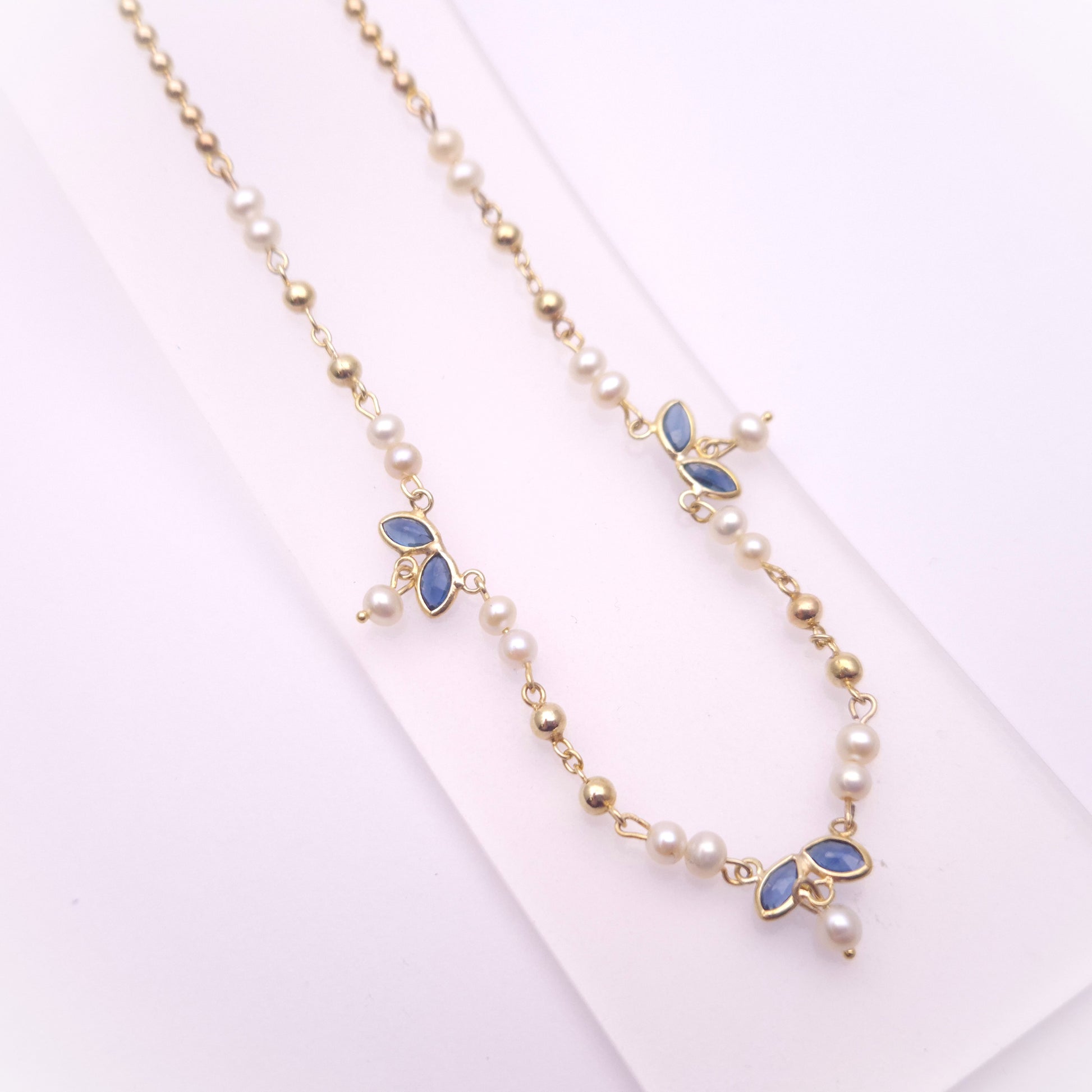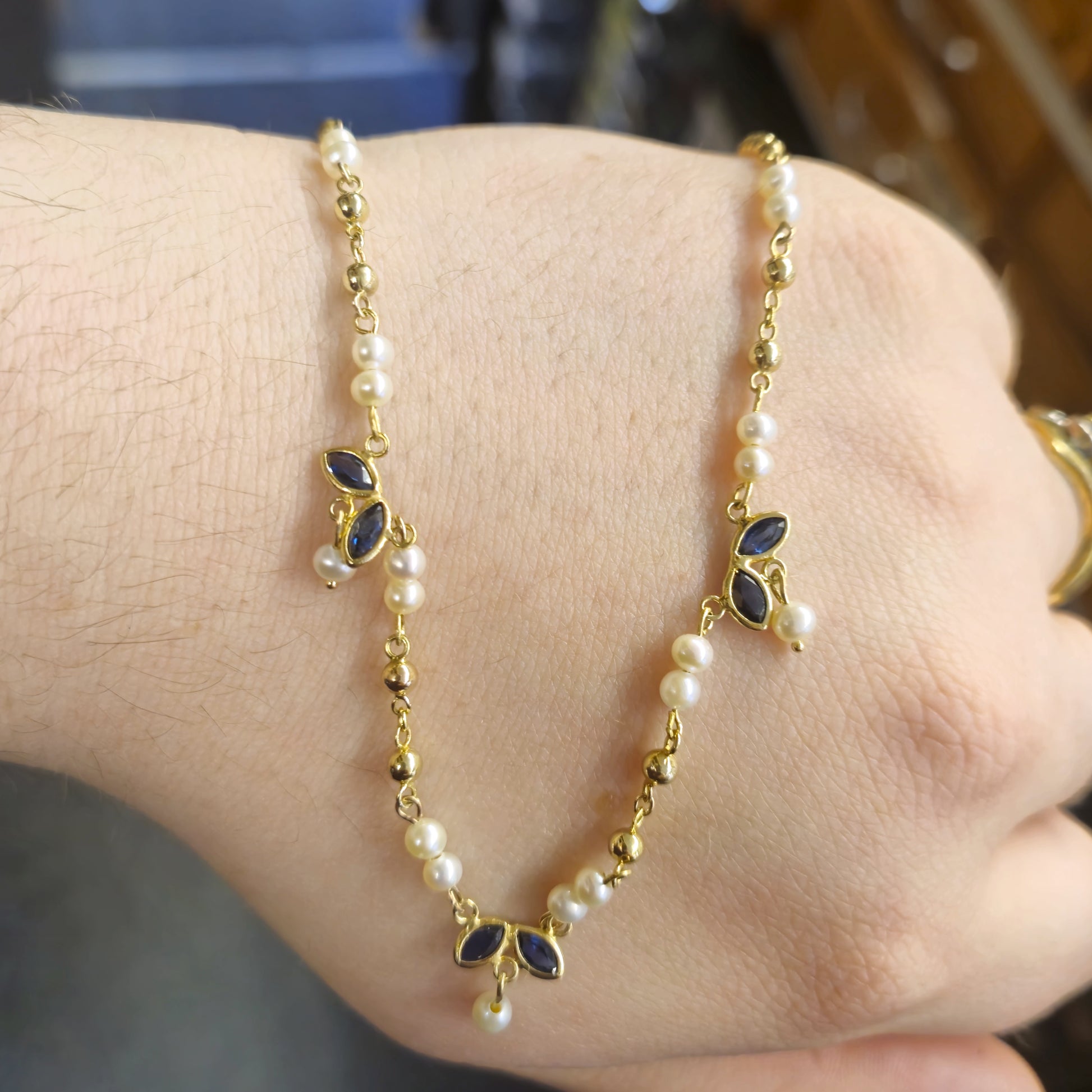 9ct Yellow Gold Beaded Chain Sapphire and Pearl Delicate Necklace