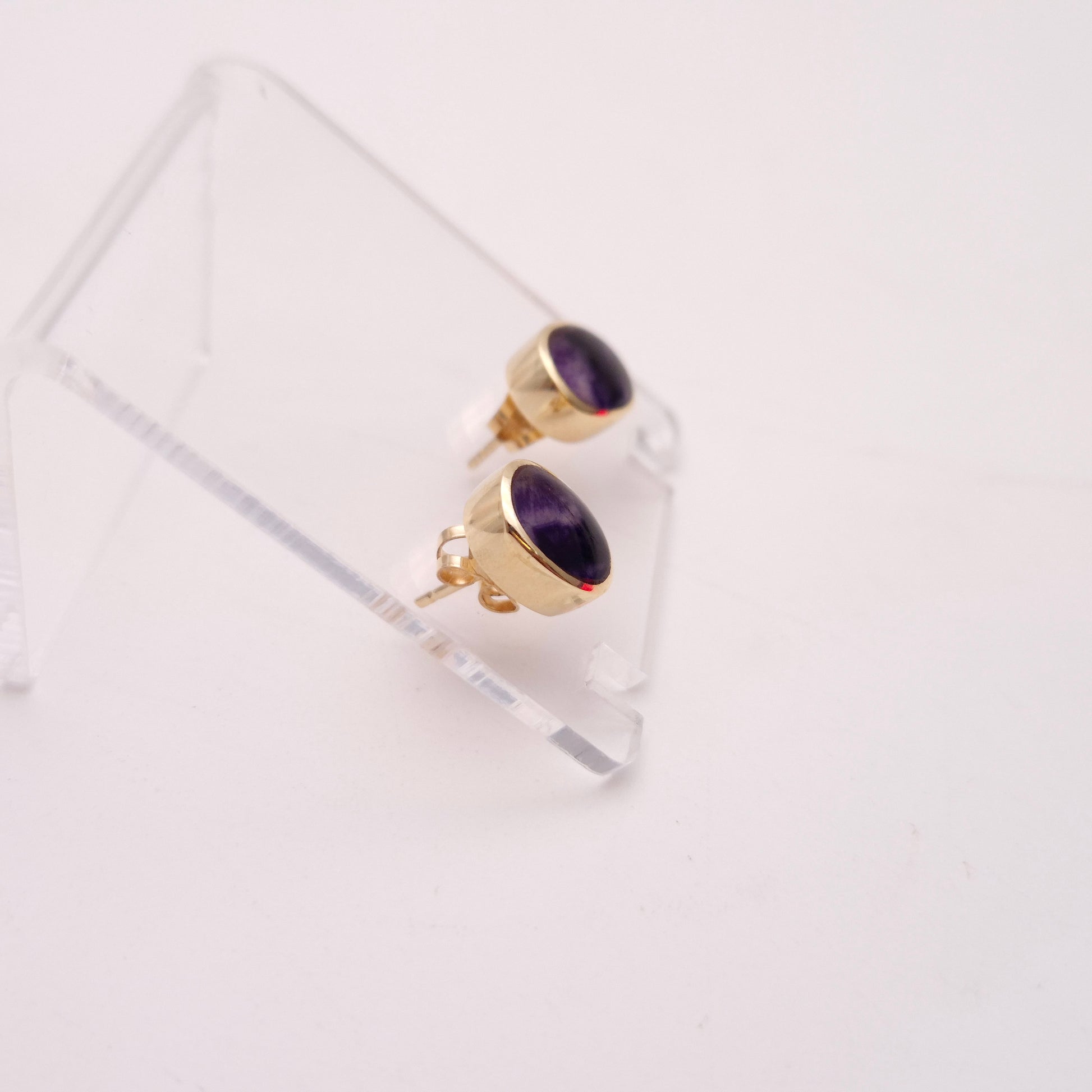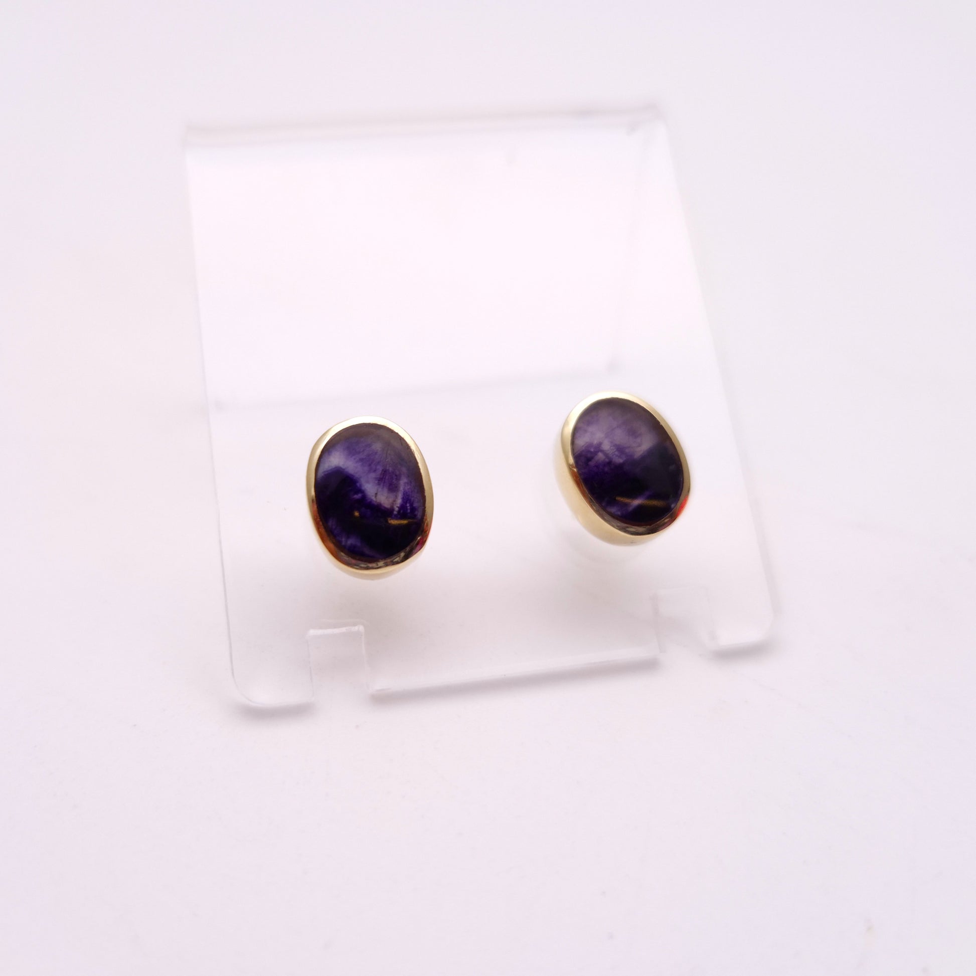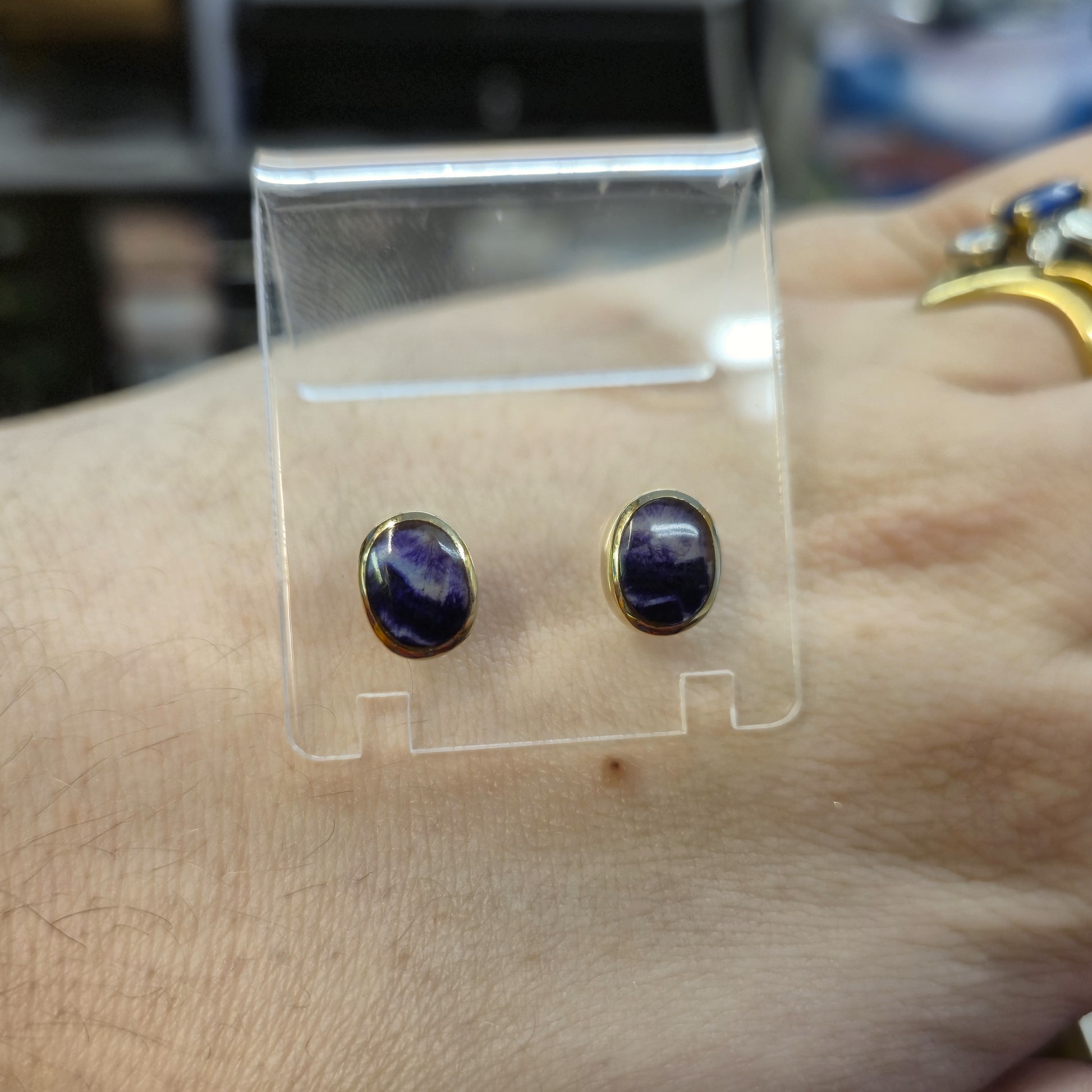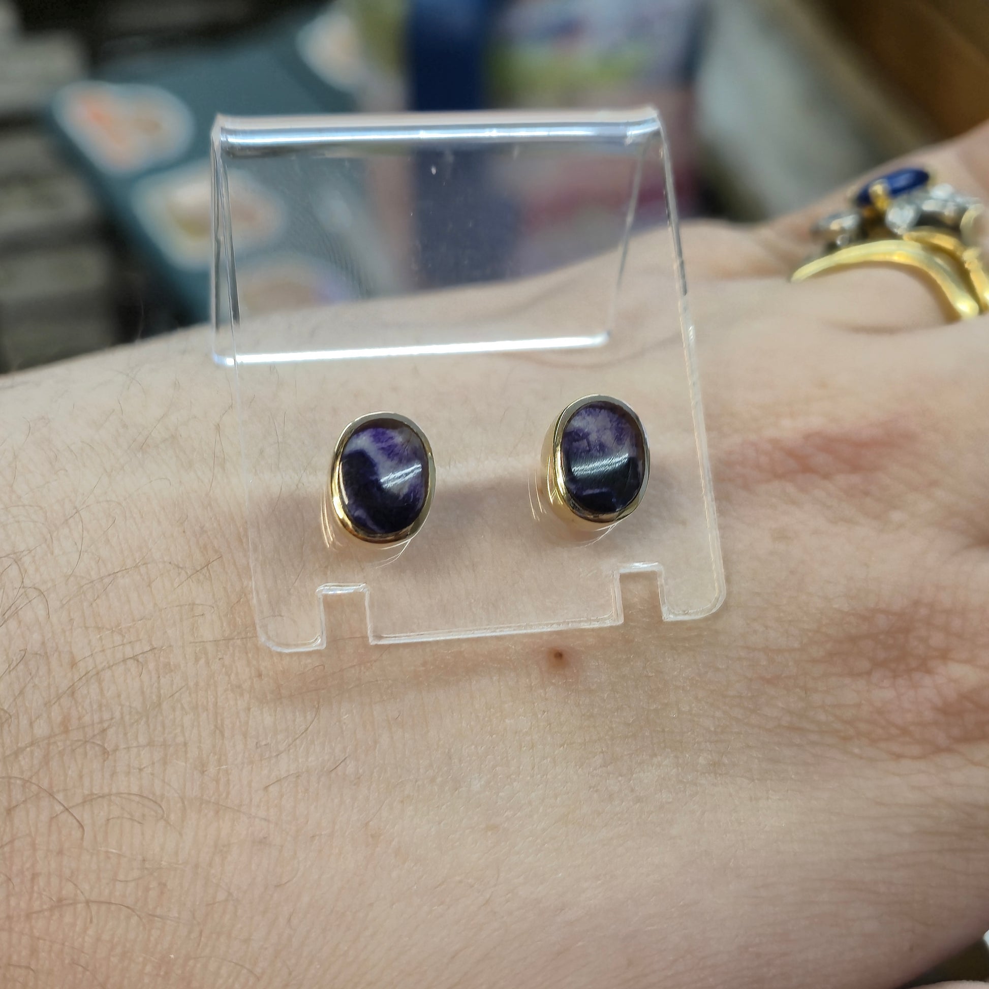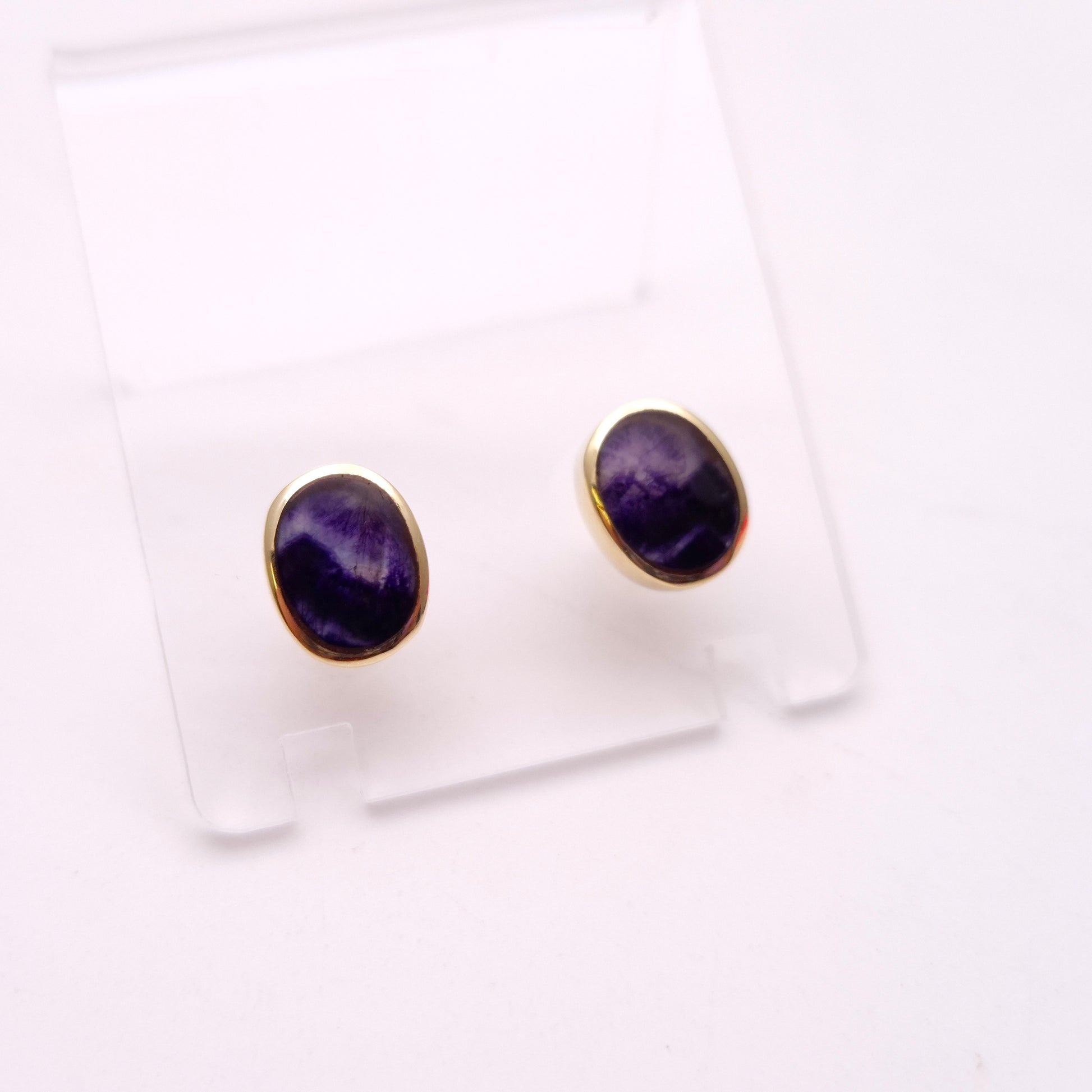These stunning stud earrings feature genuine Blue John, a unique and captivating mineral found only in Derbyshire, England. Each oval-shaped Blue John cabochon is expertly cut and polished to showcase its distinctive banded patterns of deep violet, rich blue, and creamy white, ensuring that no two stones are exactly alike.