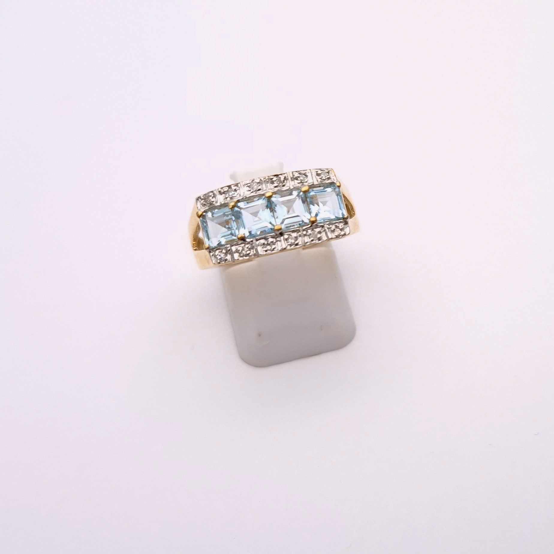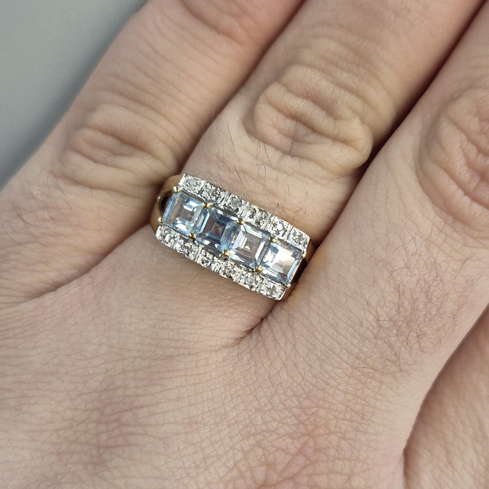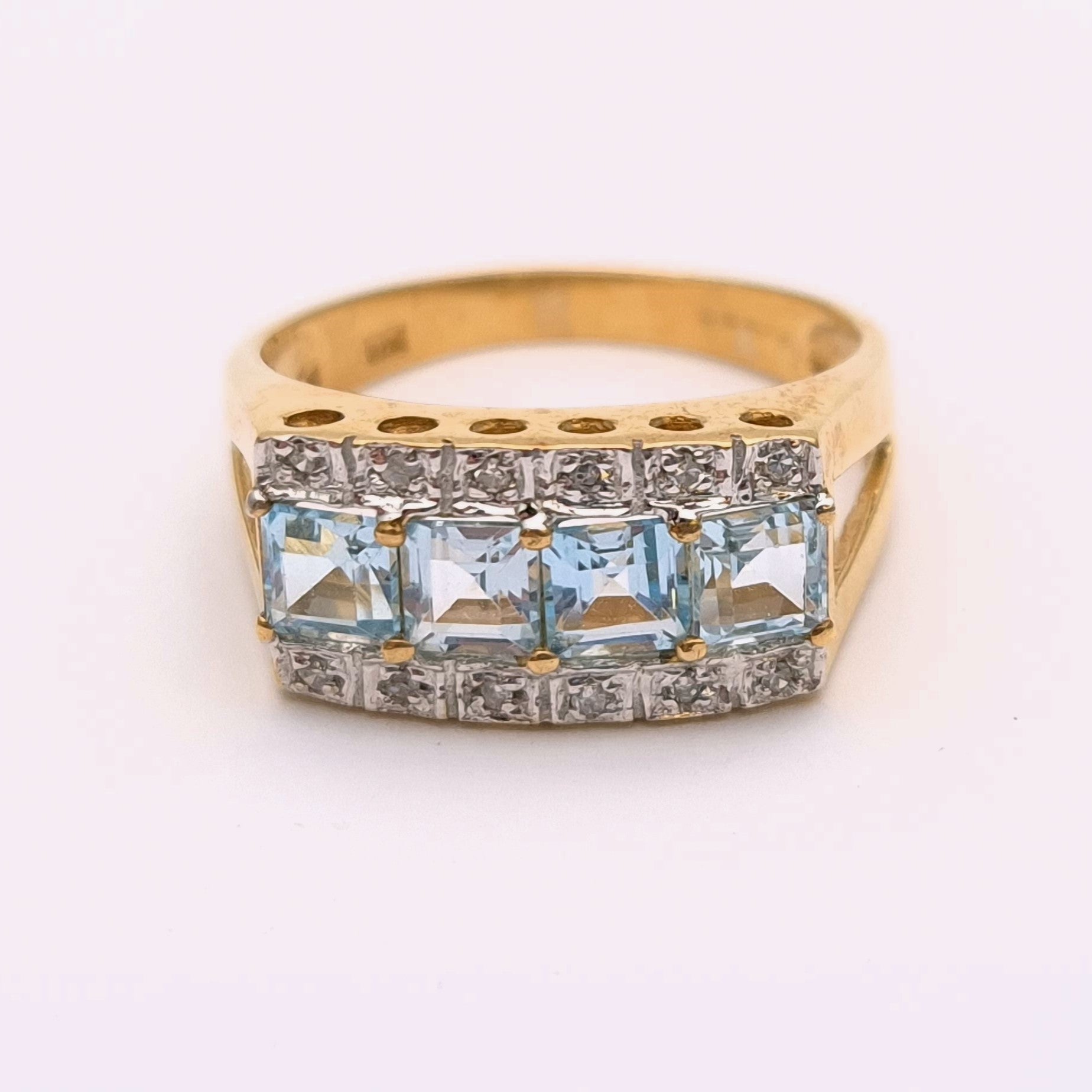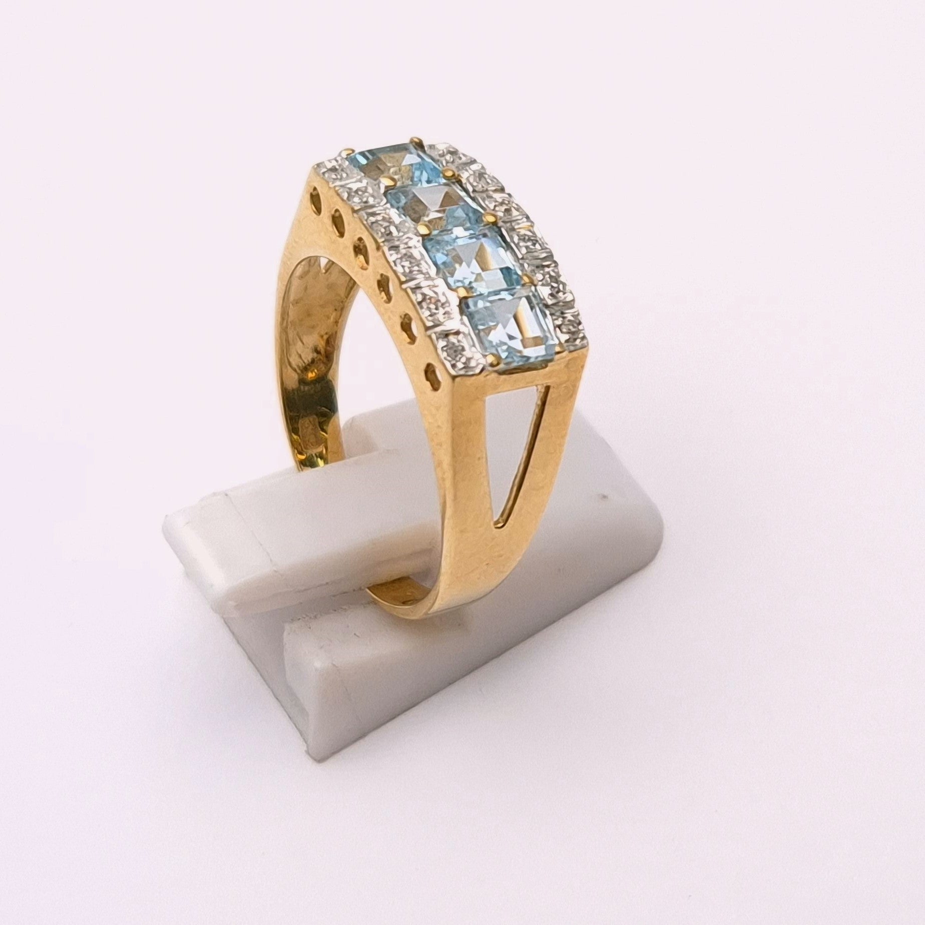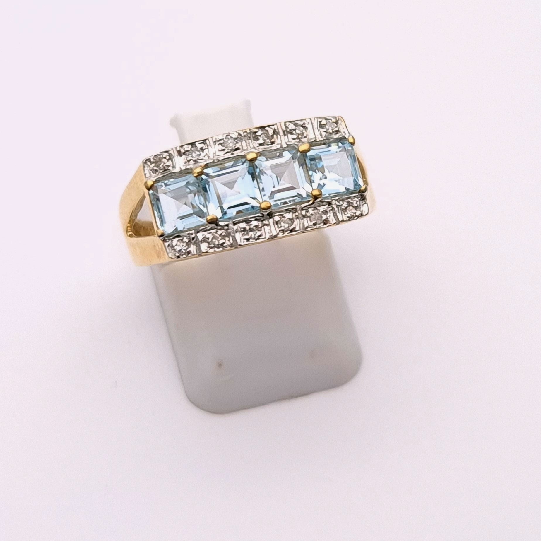 This unusual statement ring is made from 9ct yellow gold and is designed with 4 princess cut blue topaz stones set in a row with a ban above and below the topaz stones set with small round cut diamonds.