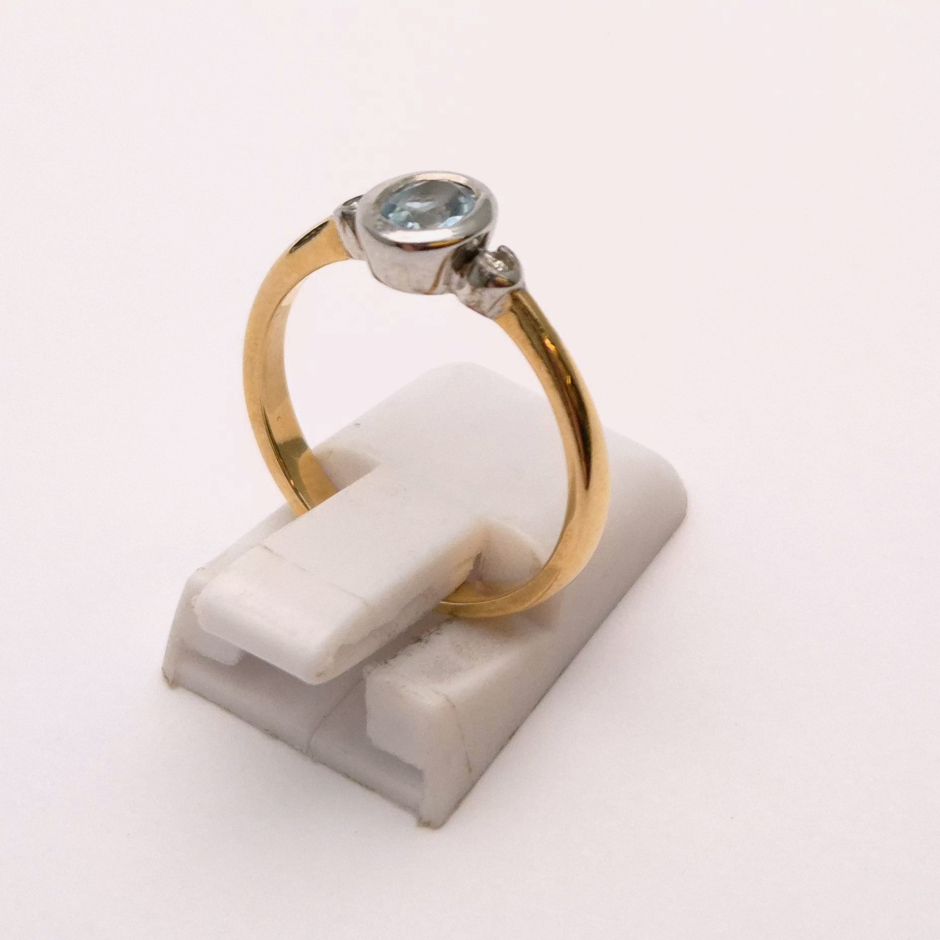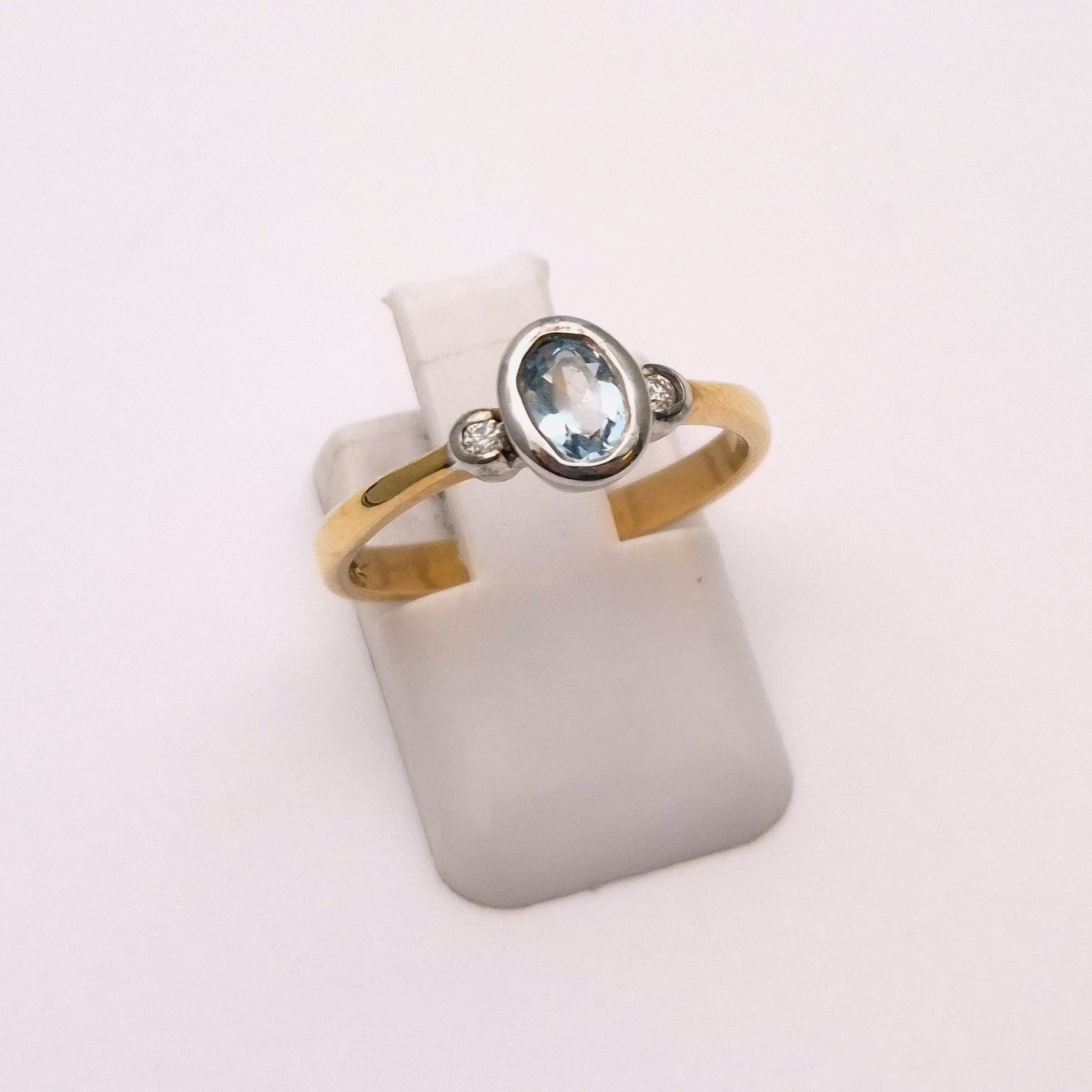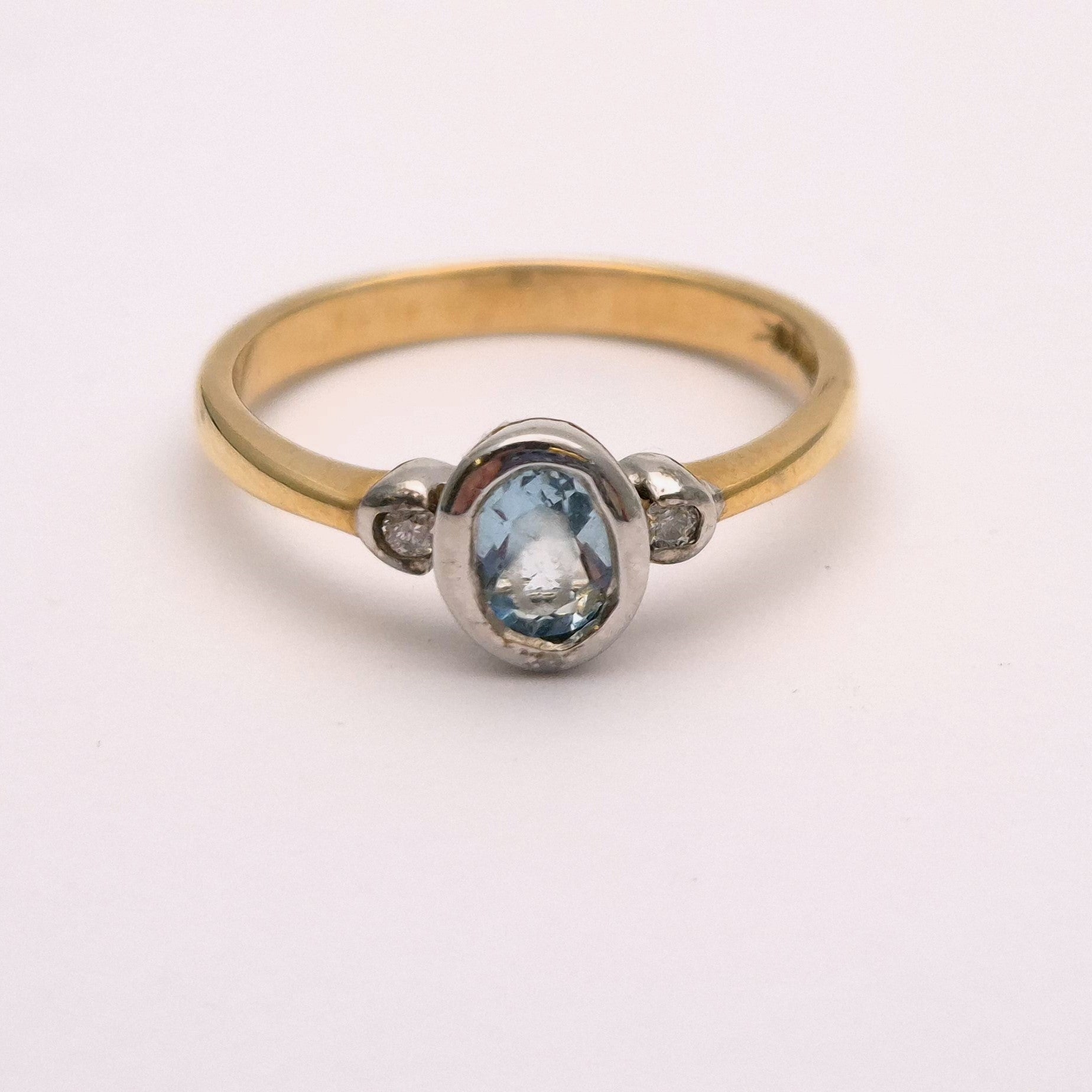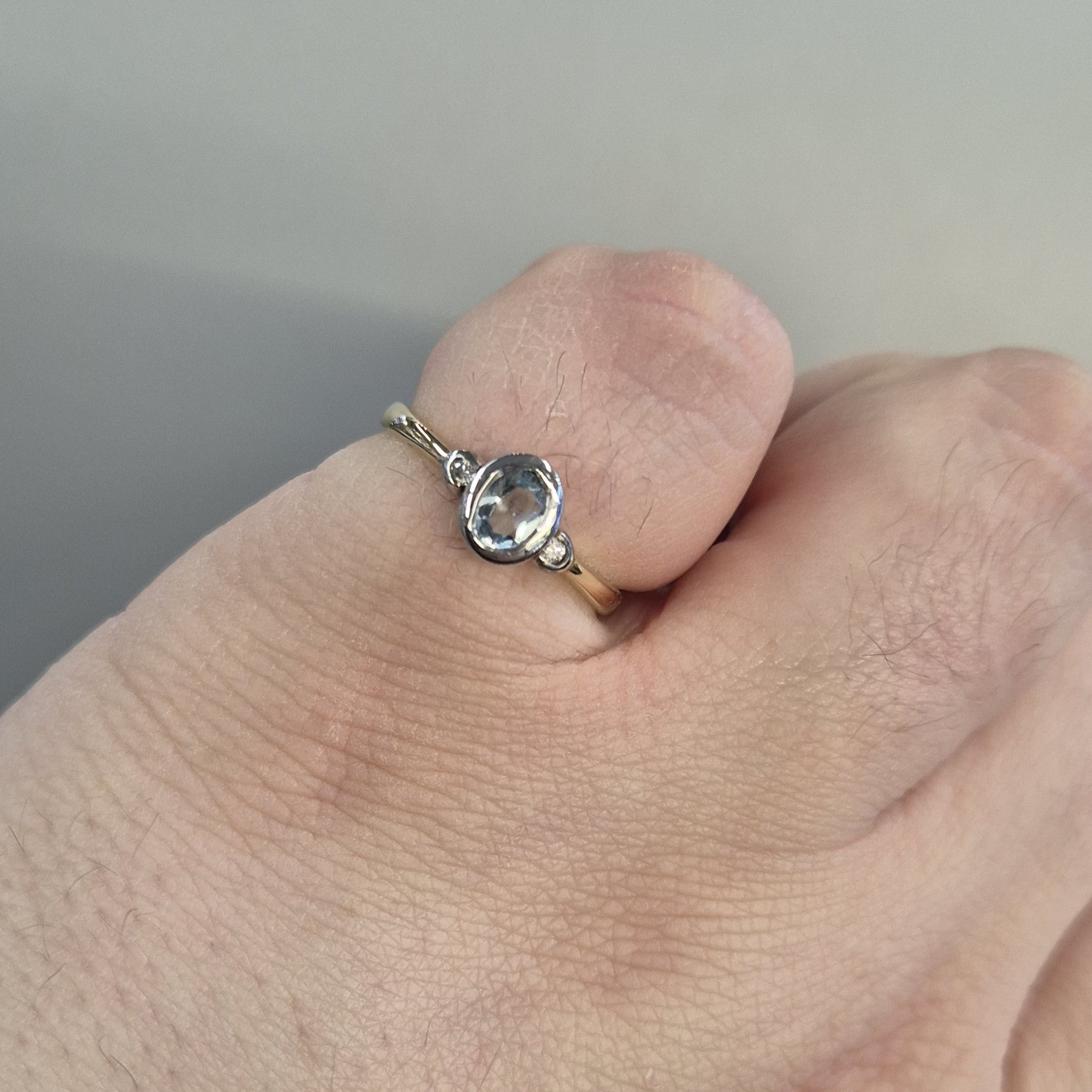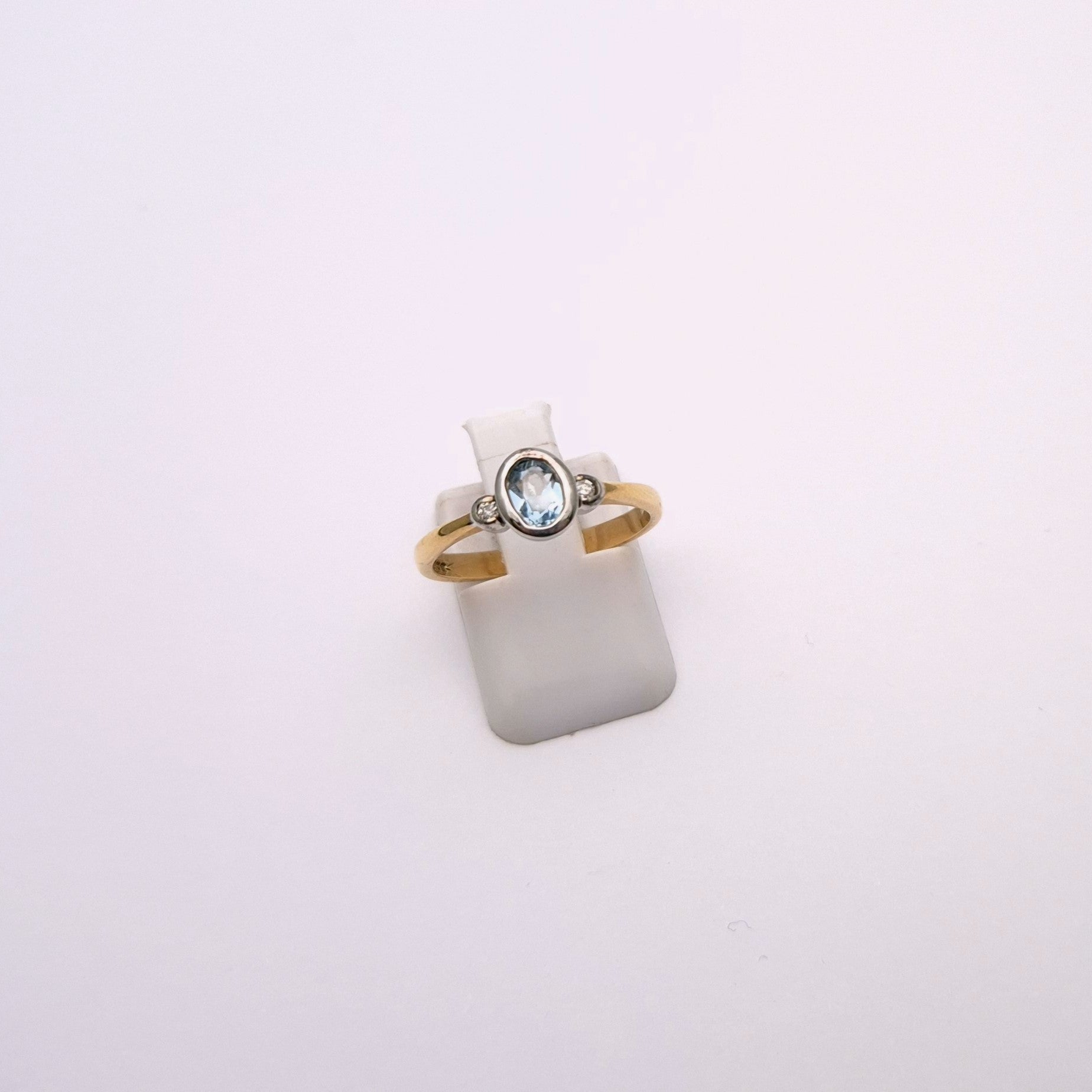 This simple but pretty ring is made from 9ct yellow gold and features an oval cut blue topaz with two small round cut diamond set at either side.