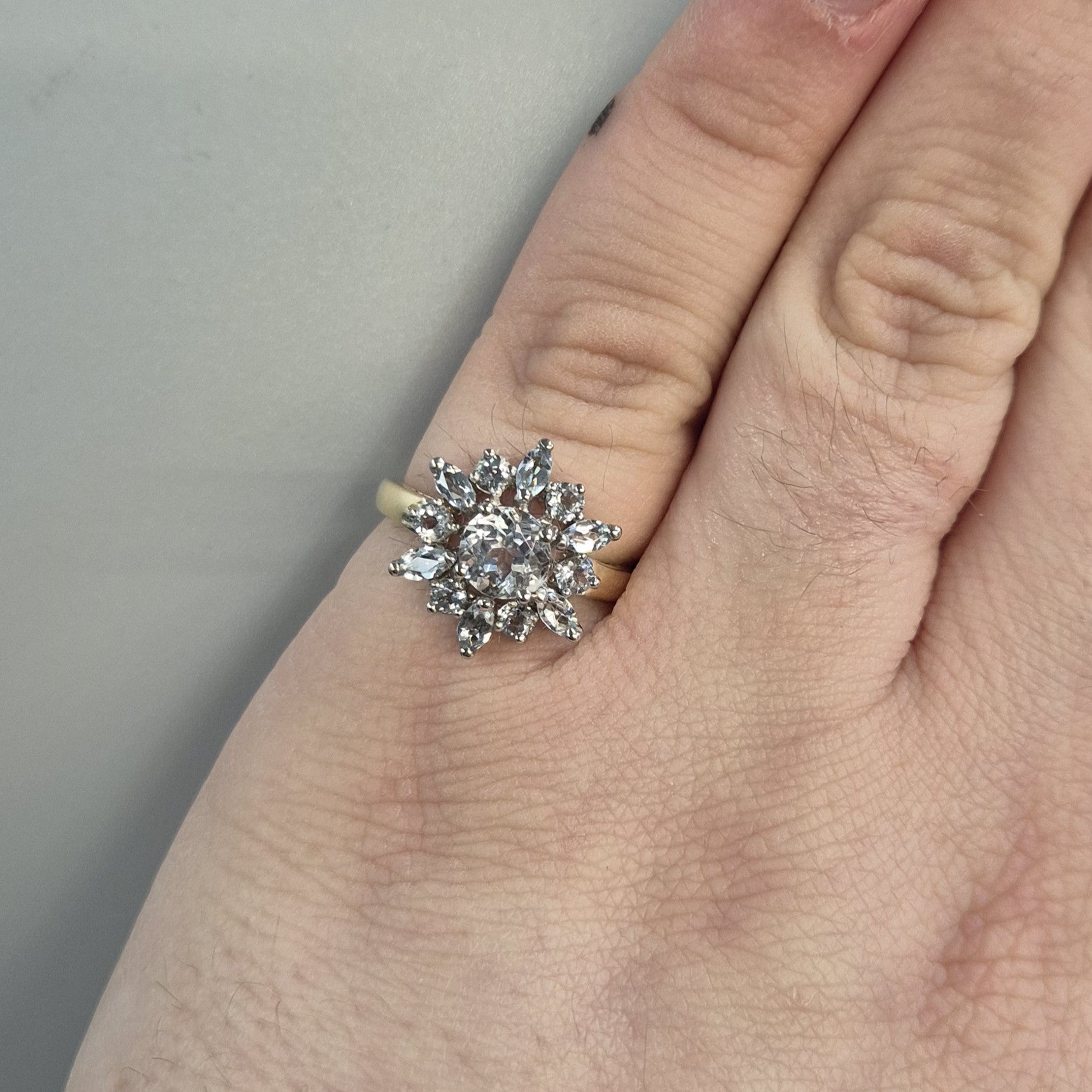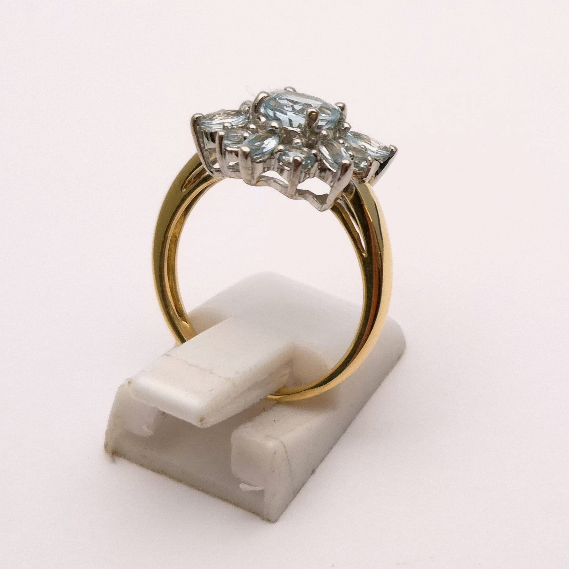 This lovely statement ring is made of 9ct yellow gold and is designed as a multistone cluster ring in the shape of a star set with multiple cuts of pale ice blue coloured topaz stones, with a plain band made of polished yellow gold.