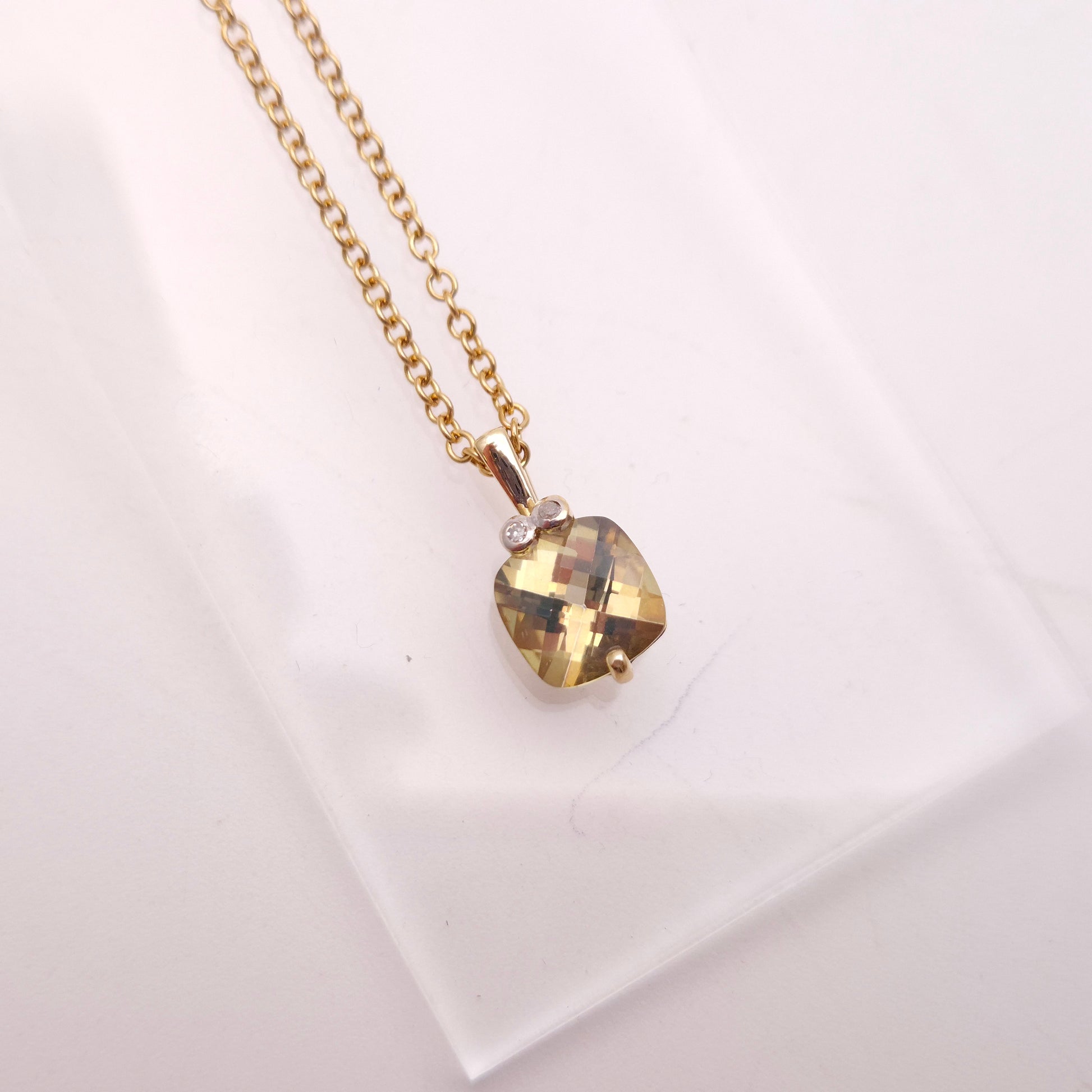 This elegant 9ct Yellow Gold Peridot and Diamond Pendant is a captivating piece that combines vibrant colour with a touch of sparkle. The central feature is a beautiful cushion-cut peridot, known for its brilliant, cheerful green hue. The peridot is a striking "chequerboard" cut, a special faceting style that gives the stone a unique, mosaic-like pattern of light and shadow, enhancing its brilliance and lively colour.
