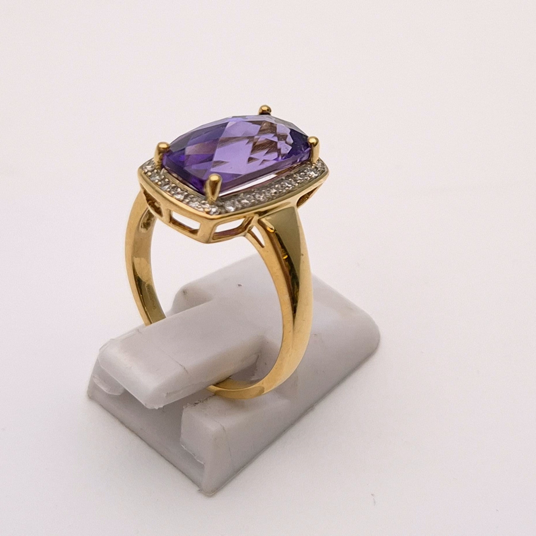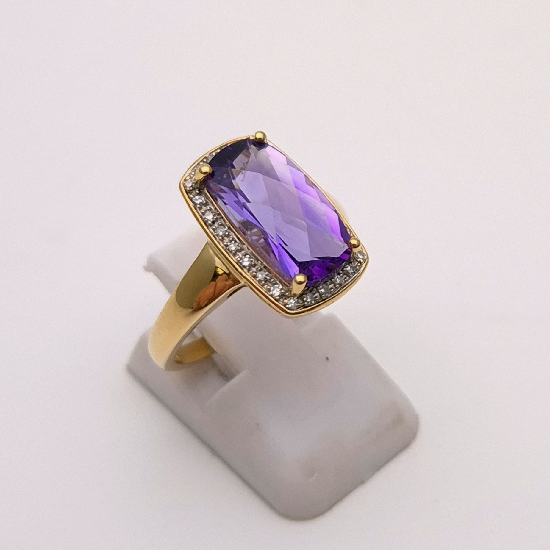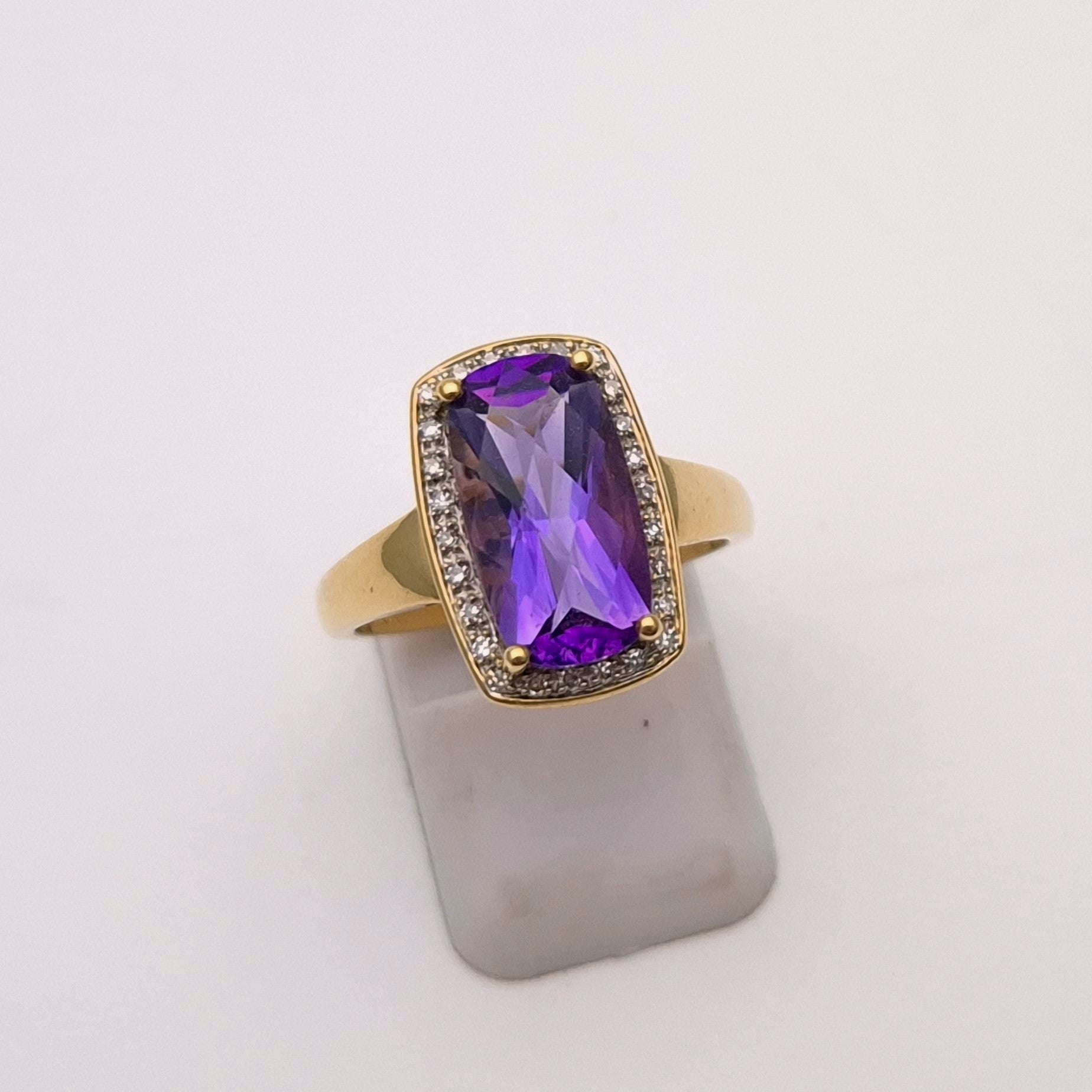 This unique ring is made from 9ct yellow gold and had a large uniquely cut rectangular amethyst stone with a chequerboard faceted front surrounded buy a halo of small round diamonds. The band is a nice wide plain polished band.
