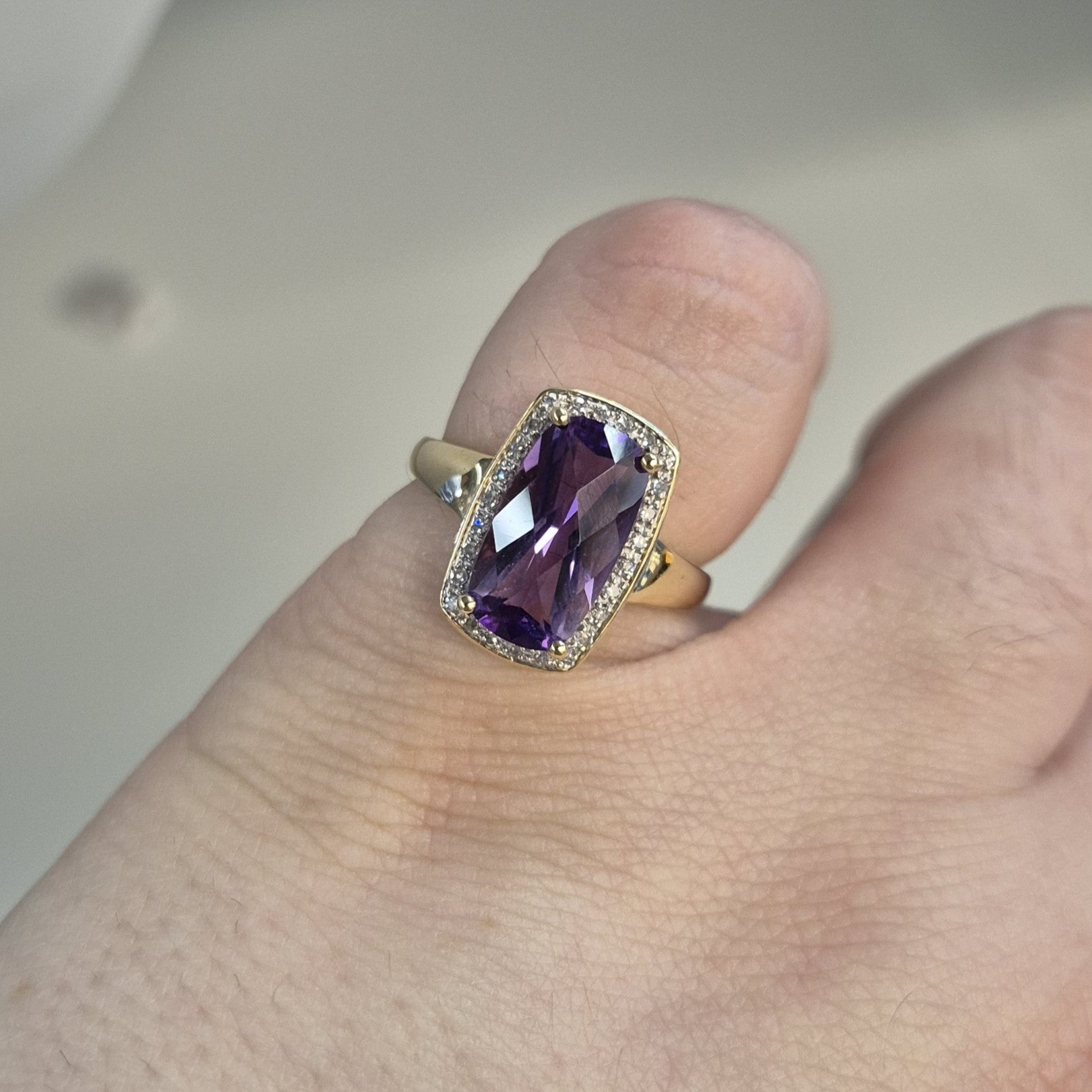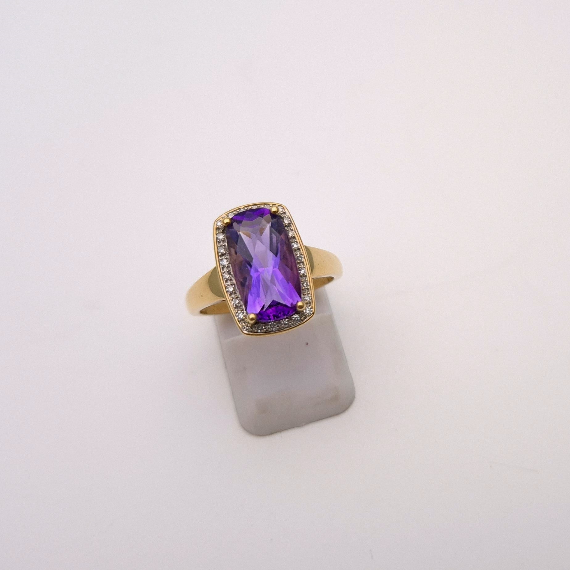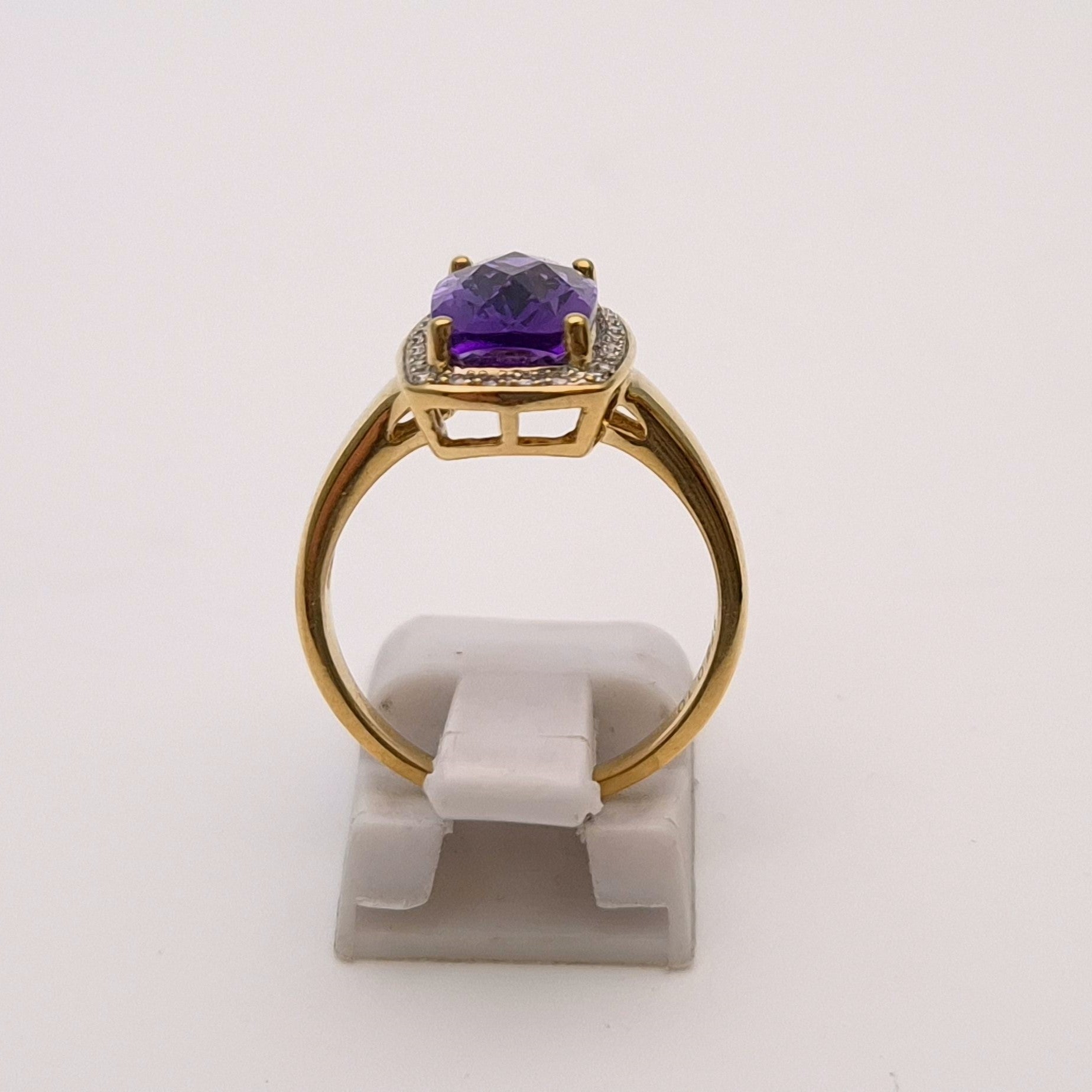 This unique ring is made from 9ct yellow gold and had a large uniquely cut rectangular amethyst stone with a chequerboard faceted front surrounded buy a halo of small round diamonds. The band is a nice wide plain polished band.