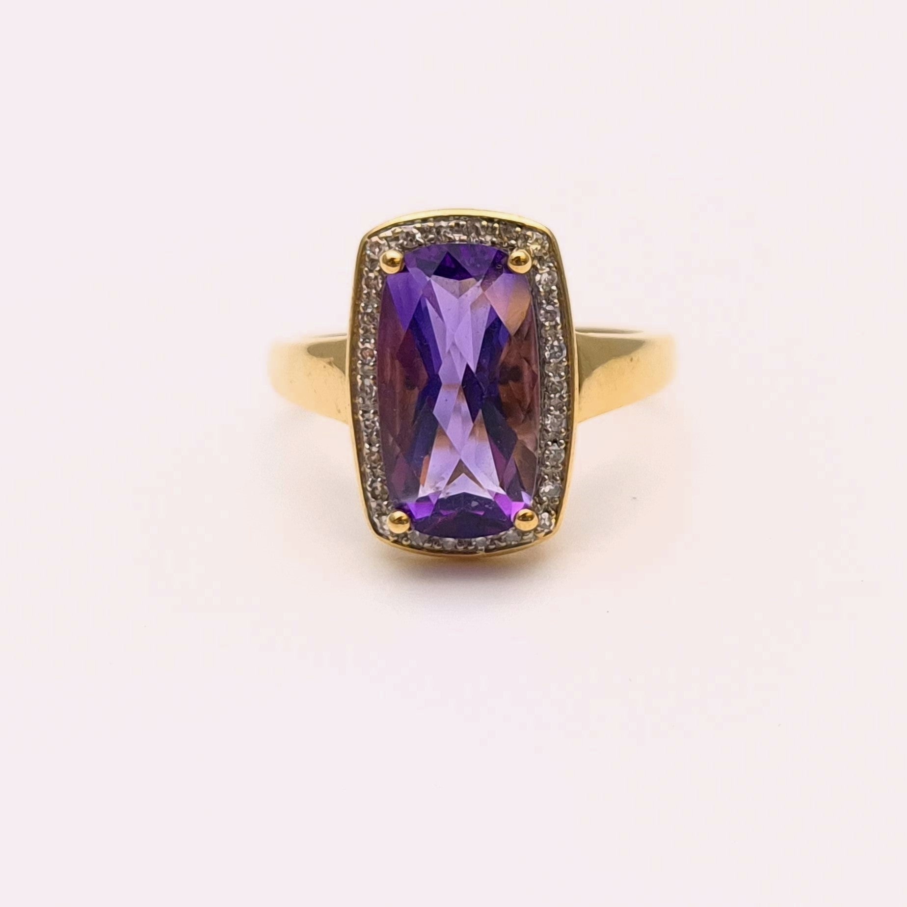 9ct Yellow Gold Chequerboard Rectangular Amethyst and Diamond Halo Cluster Ring