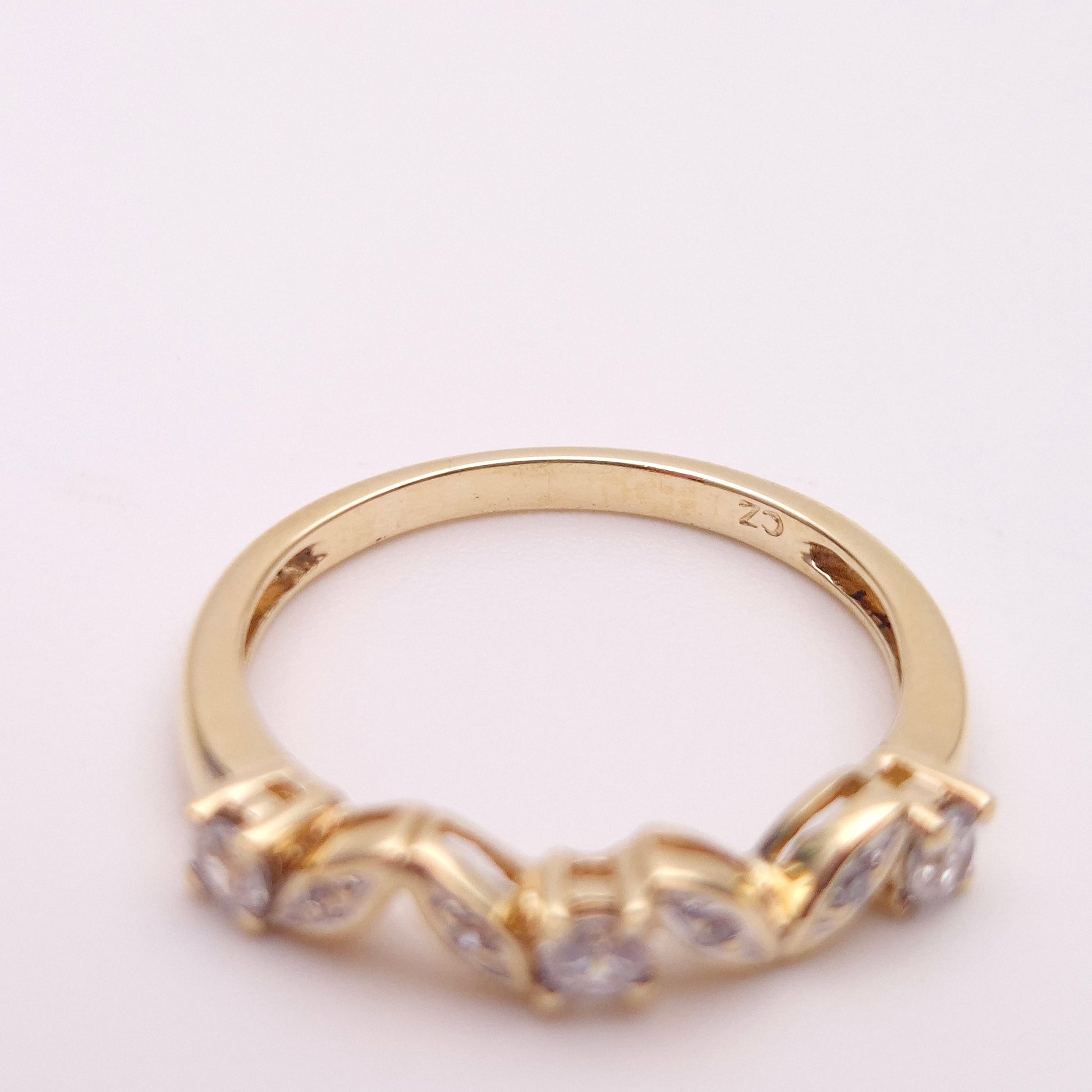 The ring features a half-eternity style design, with a graceful arrangement of alternating large round stones and marquise shaped panels also set with small round. cubic zirconia stones. This combination creates a dynamic and elegant pattern that catches the light beautifully. The stones are set in polished 9ct yellow gold, a classic metal that provides a rich and warm backdrop, enhancing the brilliance of the stones.