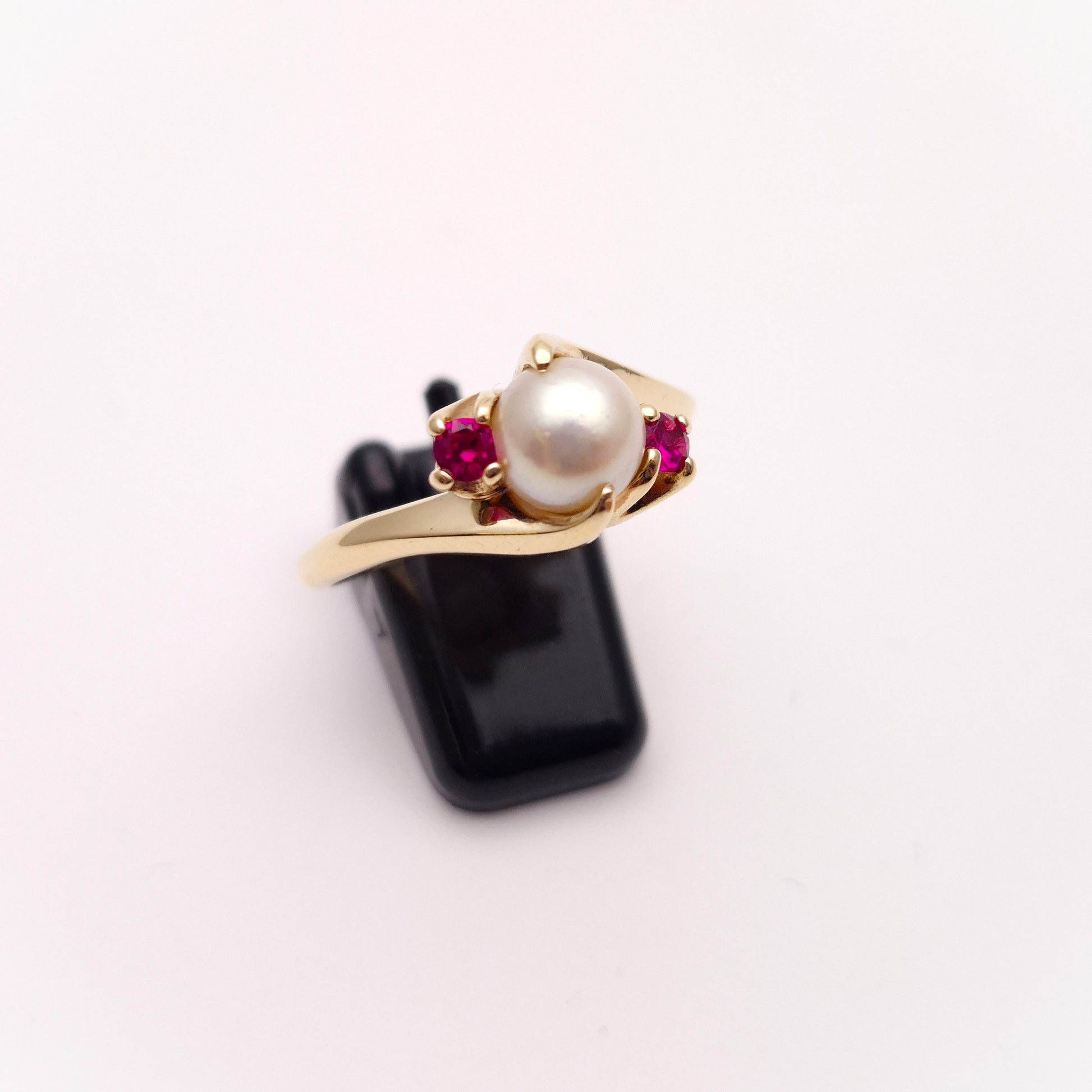 This wonderful ring is a really unique piece. Centred around a round cultured pearl with a small round cut synthetic ruby set to each side. The setting is formed from 9ct warm yellow gold and is what helps make this ring so unique with a flowing setting which gives a lovely movement to the piece.