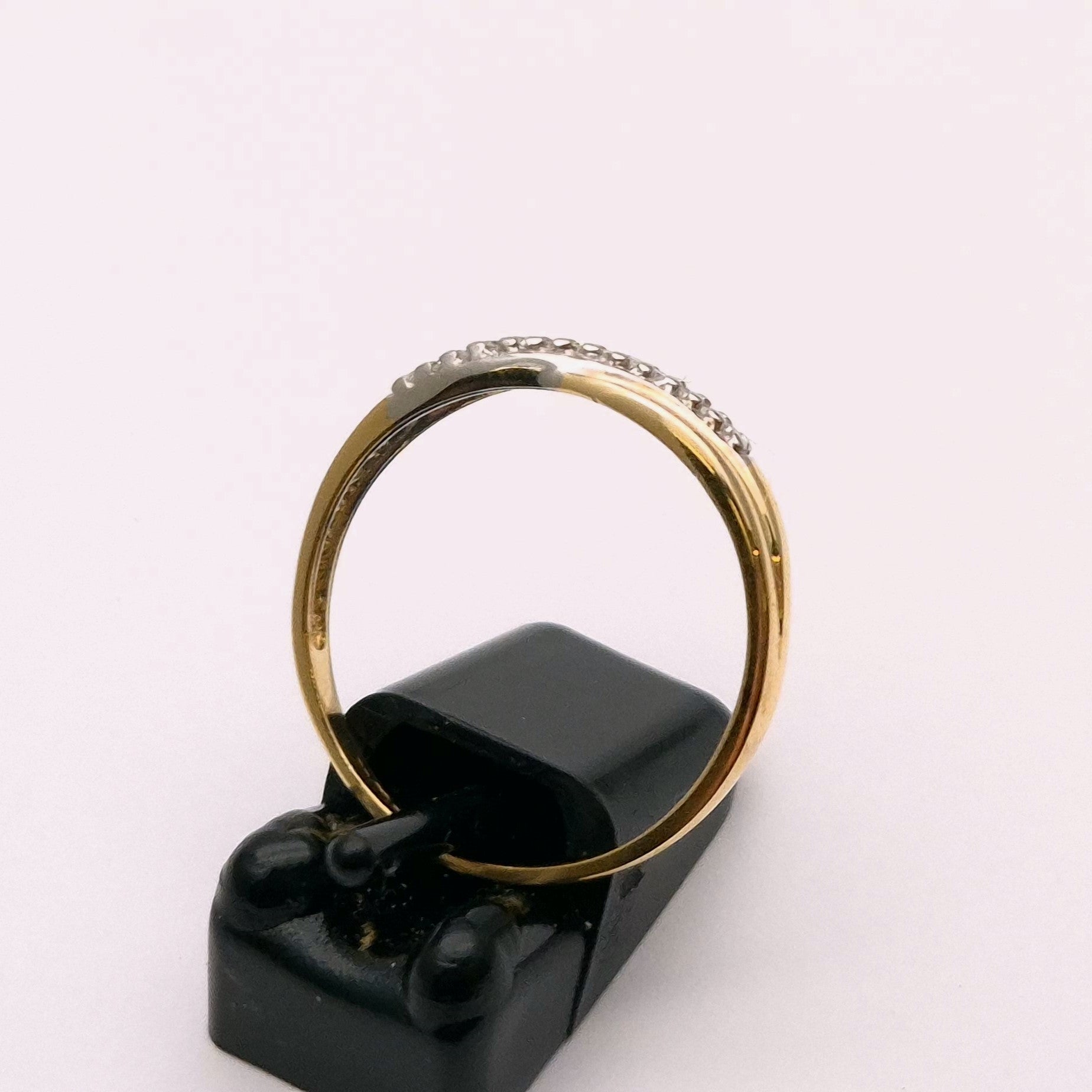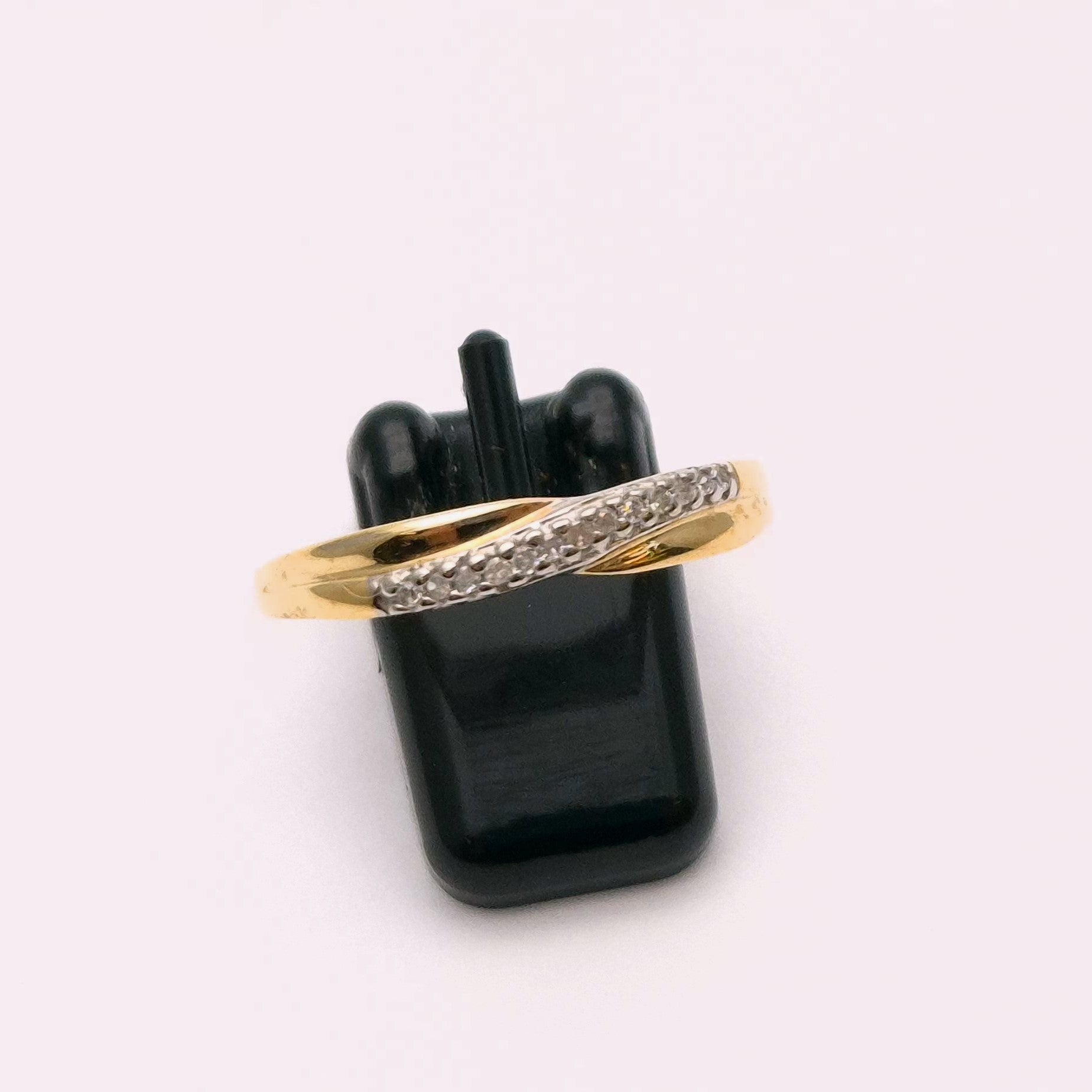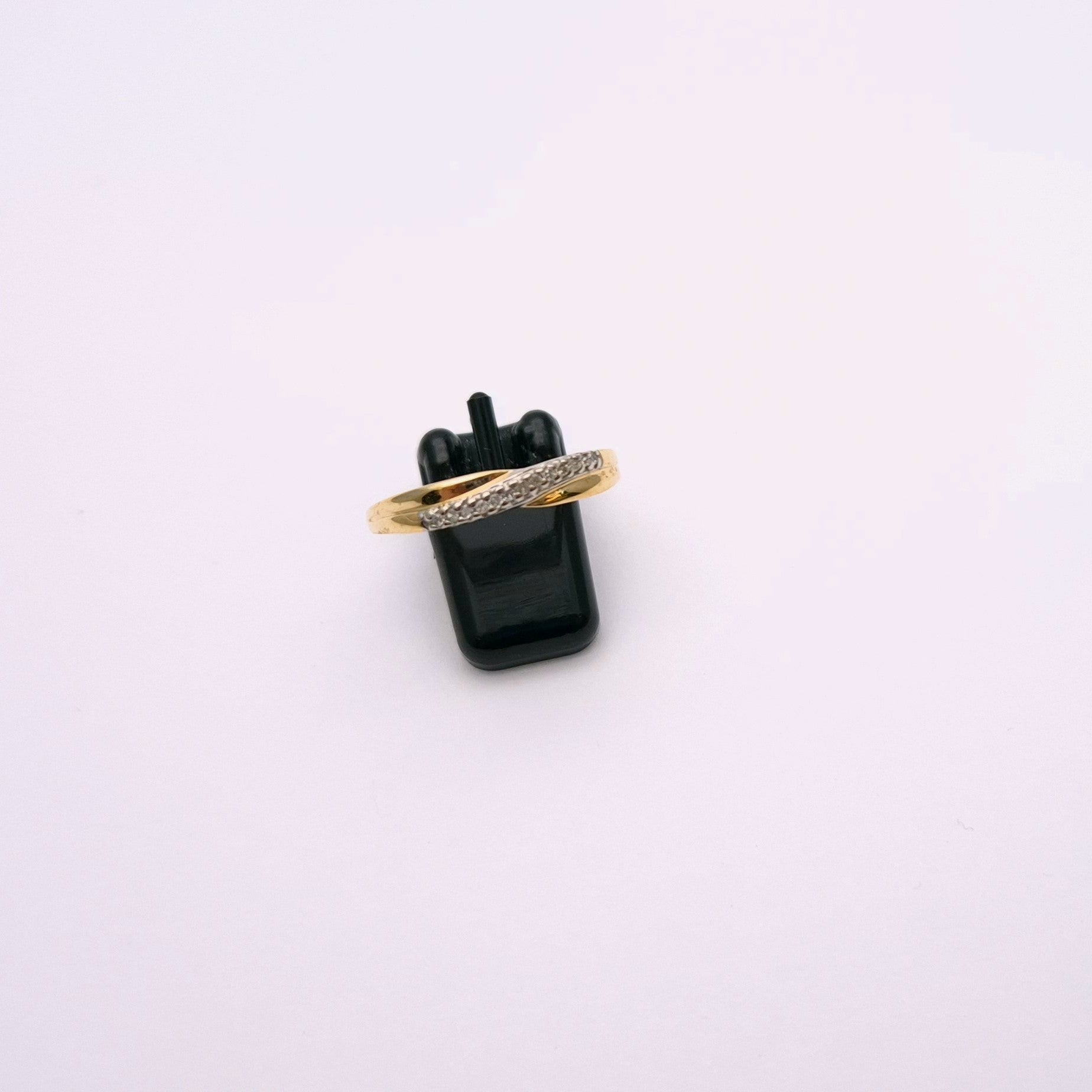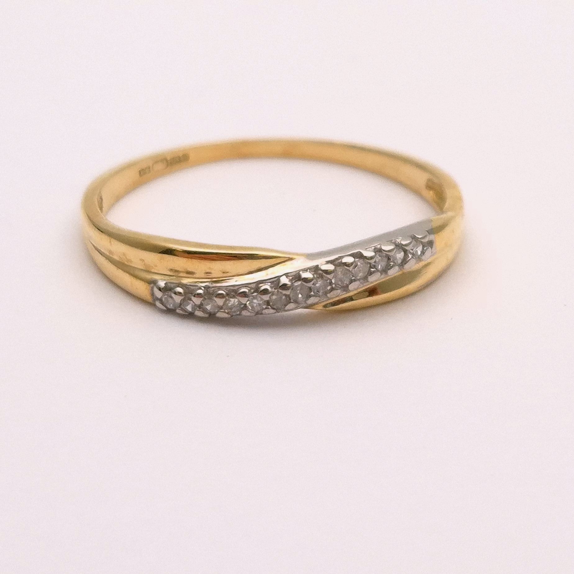 A simple classic crossover ring made of 9ct yellow gold with a row of round cut diamonds set to the front of the ring.
