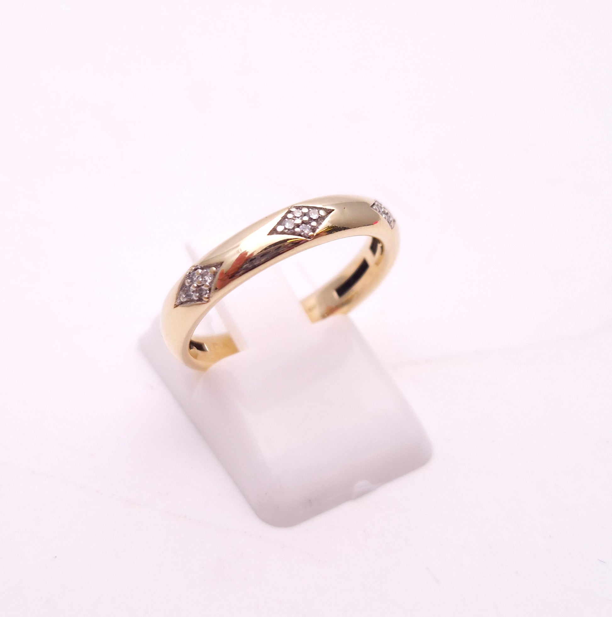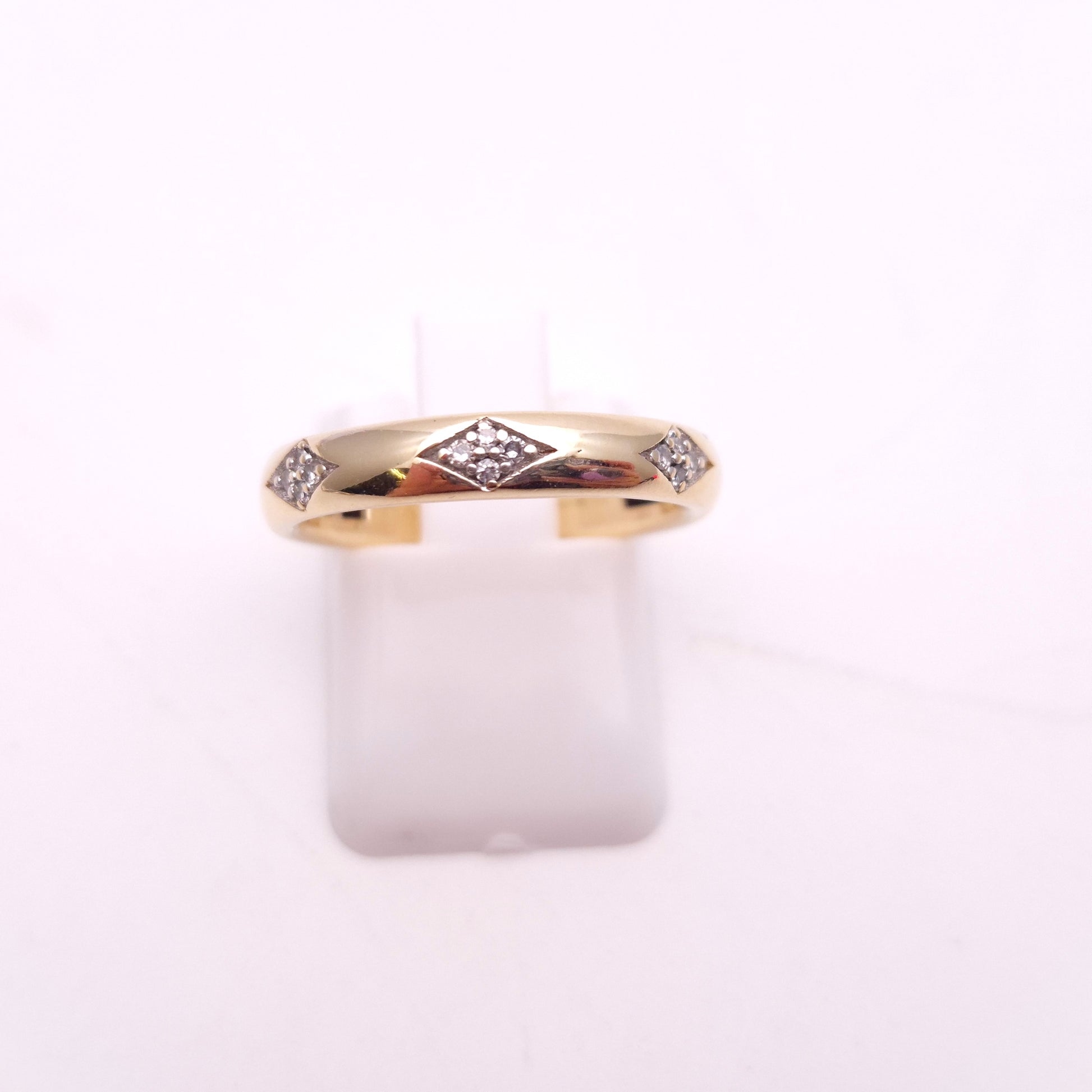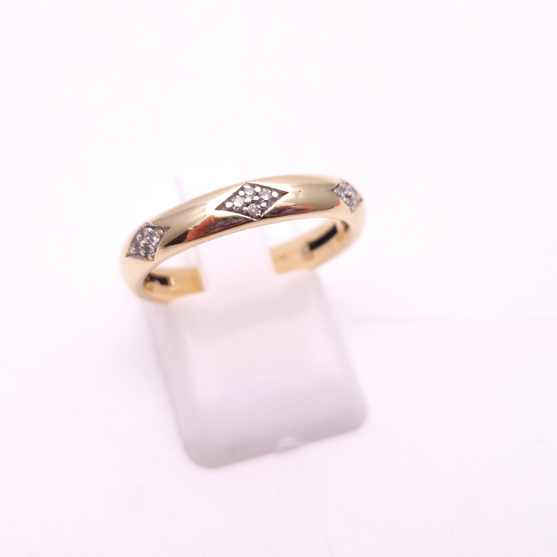 The ring features a smooth, polished 9ct yellow gold band with a gentle dome profile for a comfortable fit. What makes this piece unique are the three distinct diamond-set panels, spaced evenly across the front of the band. Each panel is crafted in a chic diamond shape, meticulously pave-set with four brilliant-cut diamonds. The brilliant facets of the diamonds create a hint of sparkle, contrasting beautifully with the rich, warm glow of the yellow gold.