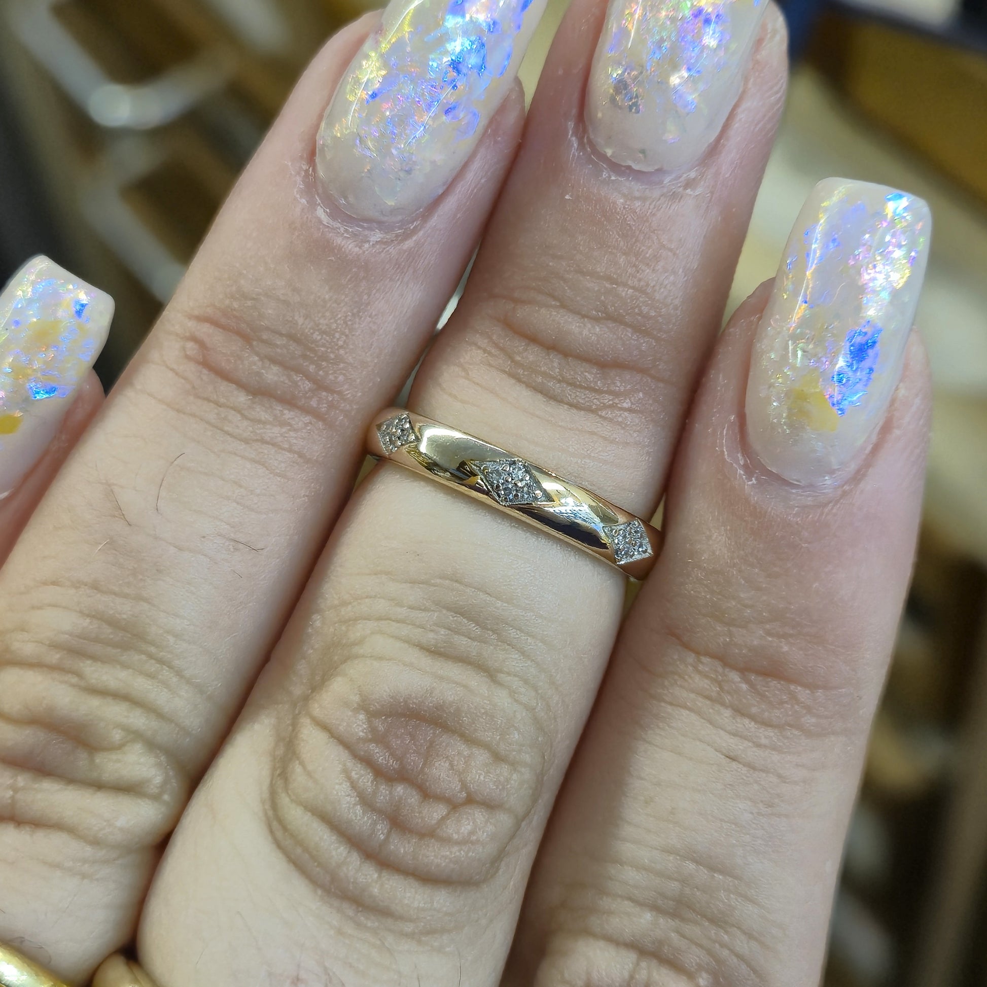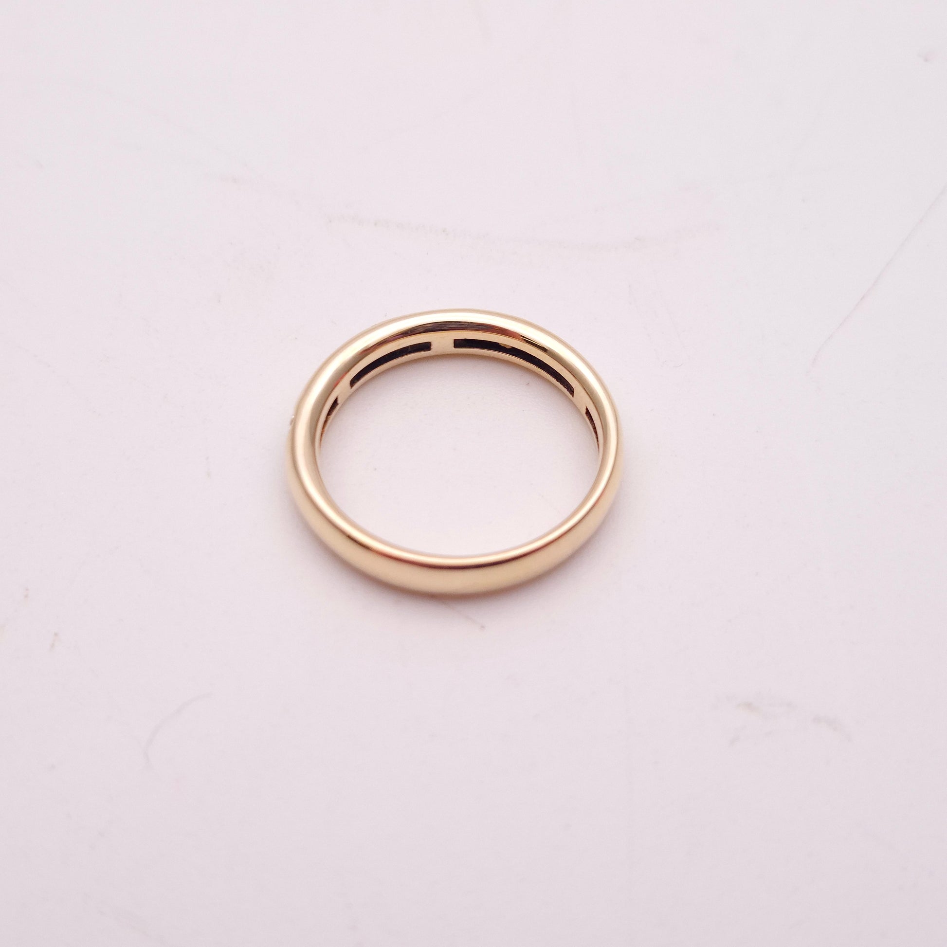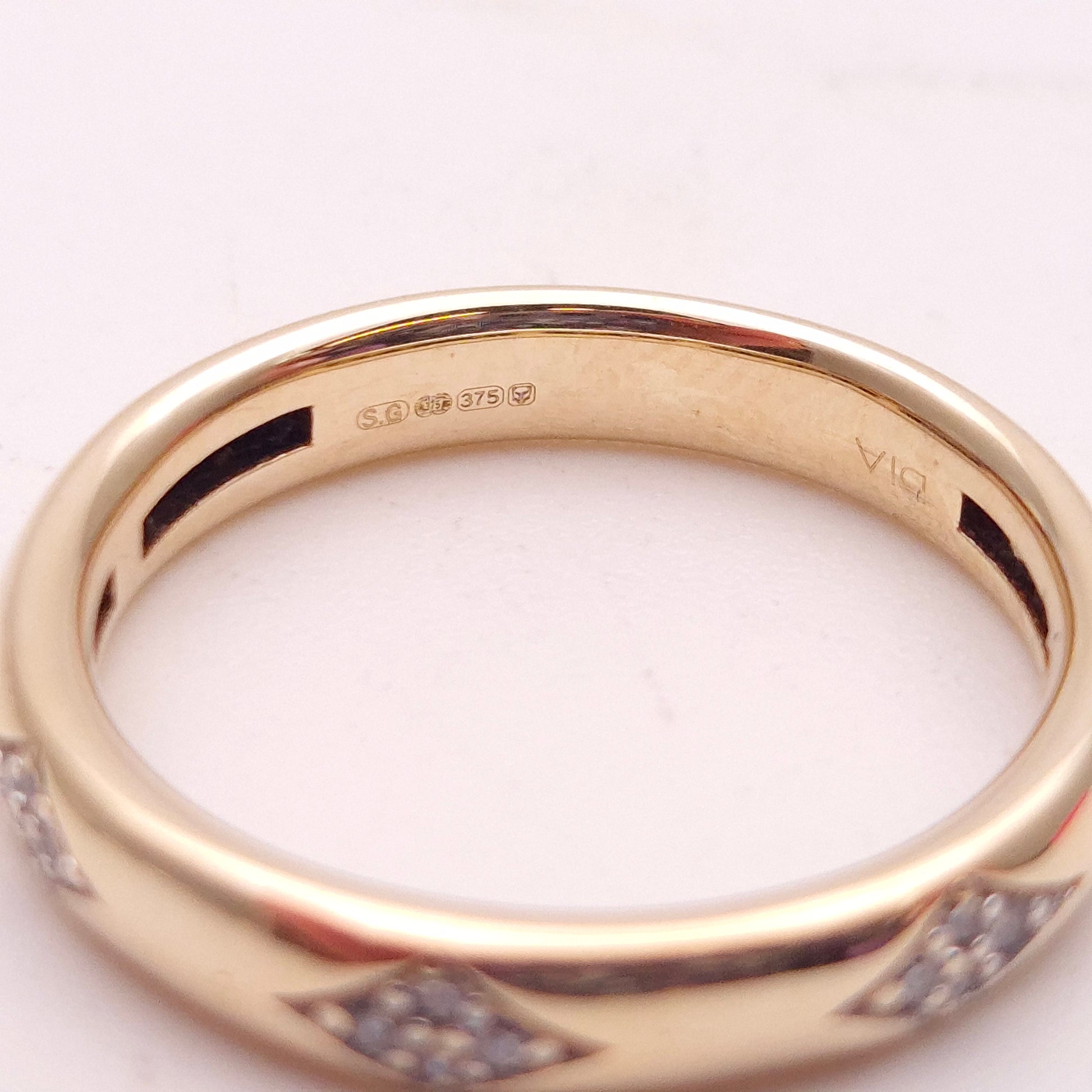 The ring features a smooth, polished 9ct yellow gold band with a gentle dome profile for a comfortable fit. What makes this piece unique are the three distinct diamond-set panels, spaced evenly across the front of the band. Each panel is crafted in a chic diamond shape, meticulously pave-set with four brilliant-cut diamonds. The brilliant facets of the diamonds create a hint of sparkle, contrasting beautifully with the rich, warm glow of the yellow gold.