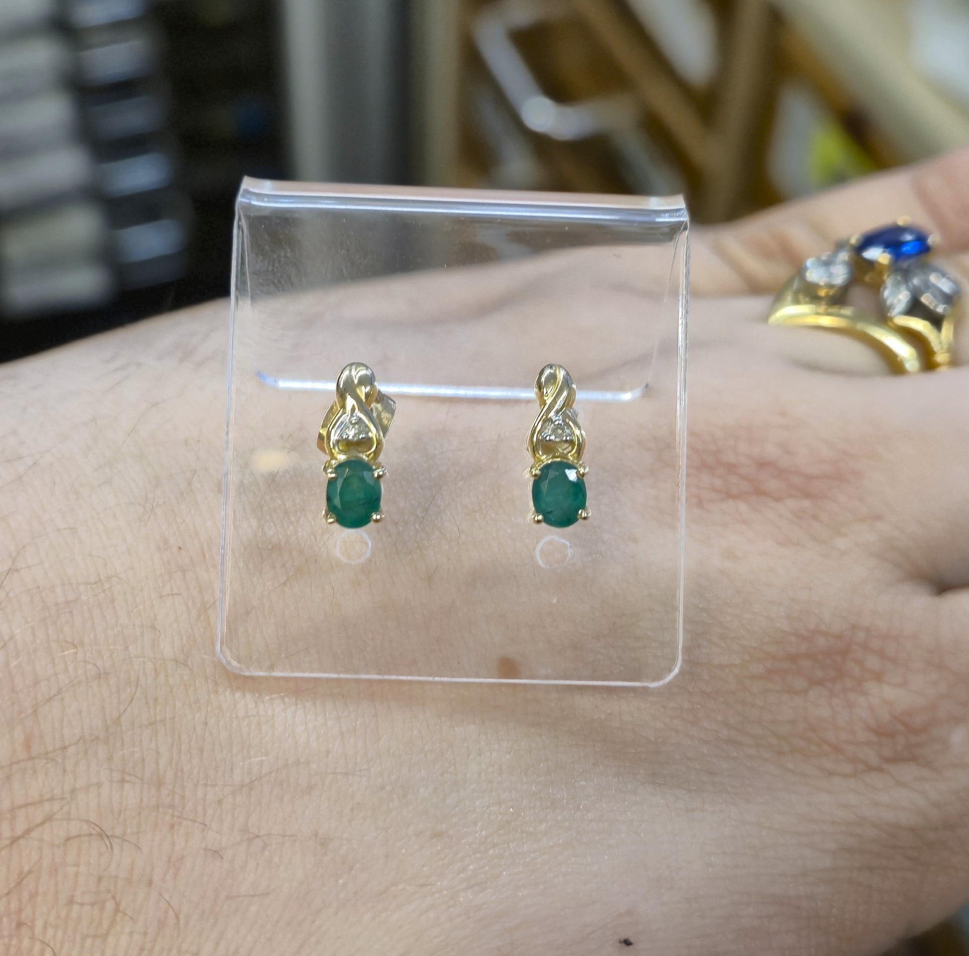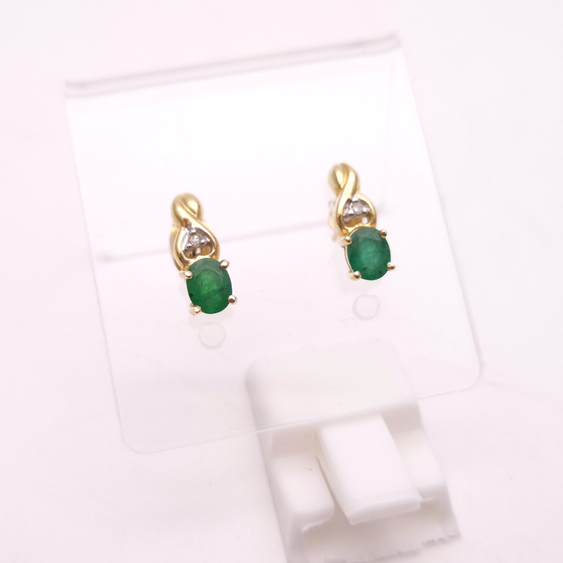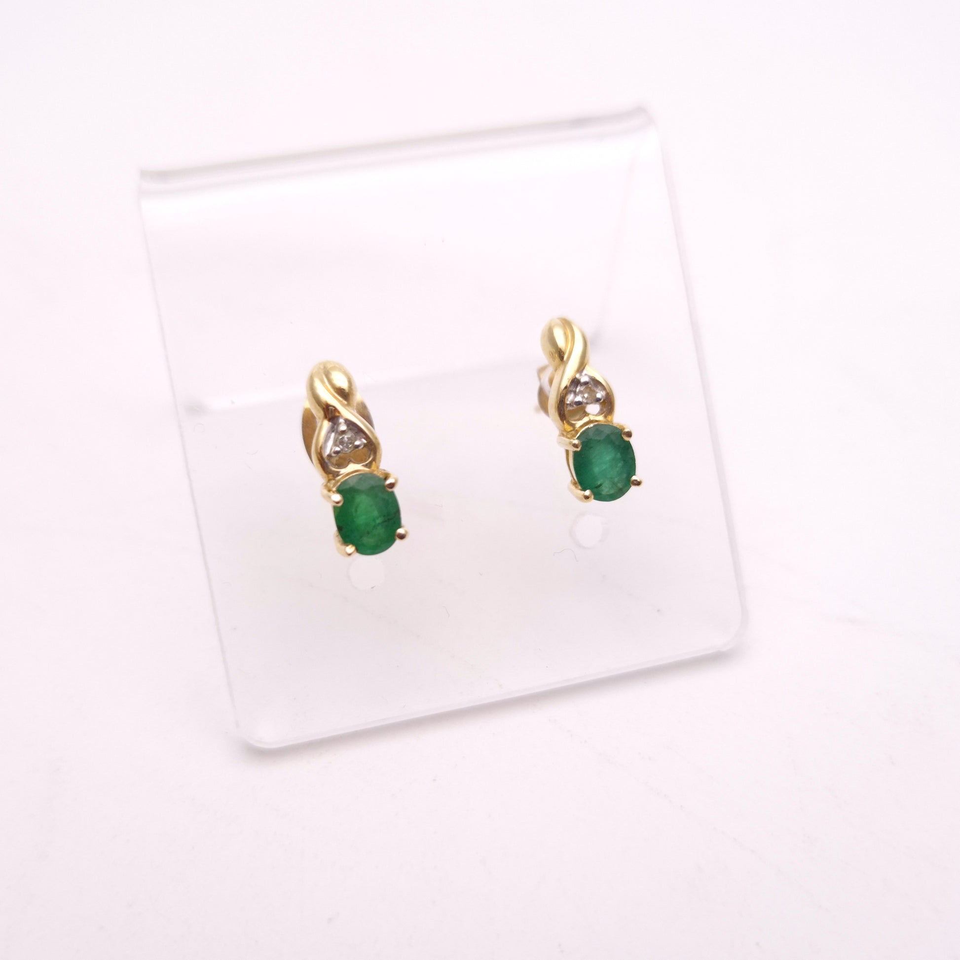The earrings are designed with the top portion of the earring features a stylized, curved, or twisted yellow gold design, which is set with a small, brilliant round-cut diamond that adds a touch of sparkle. Set gracefully below is a single, oval-cut emerald, known for its rich, deep green colour. The emerald is securely held in a classic claw setting, allowing light to pass through and highlight its natural brilliance.