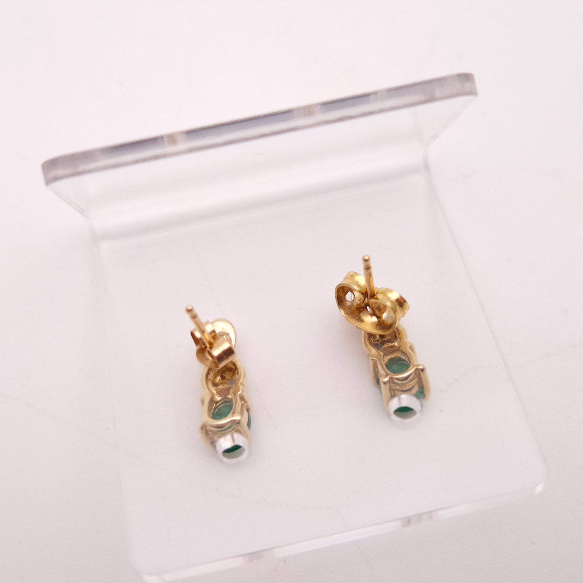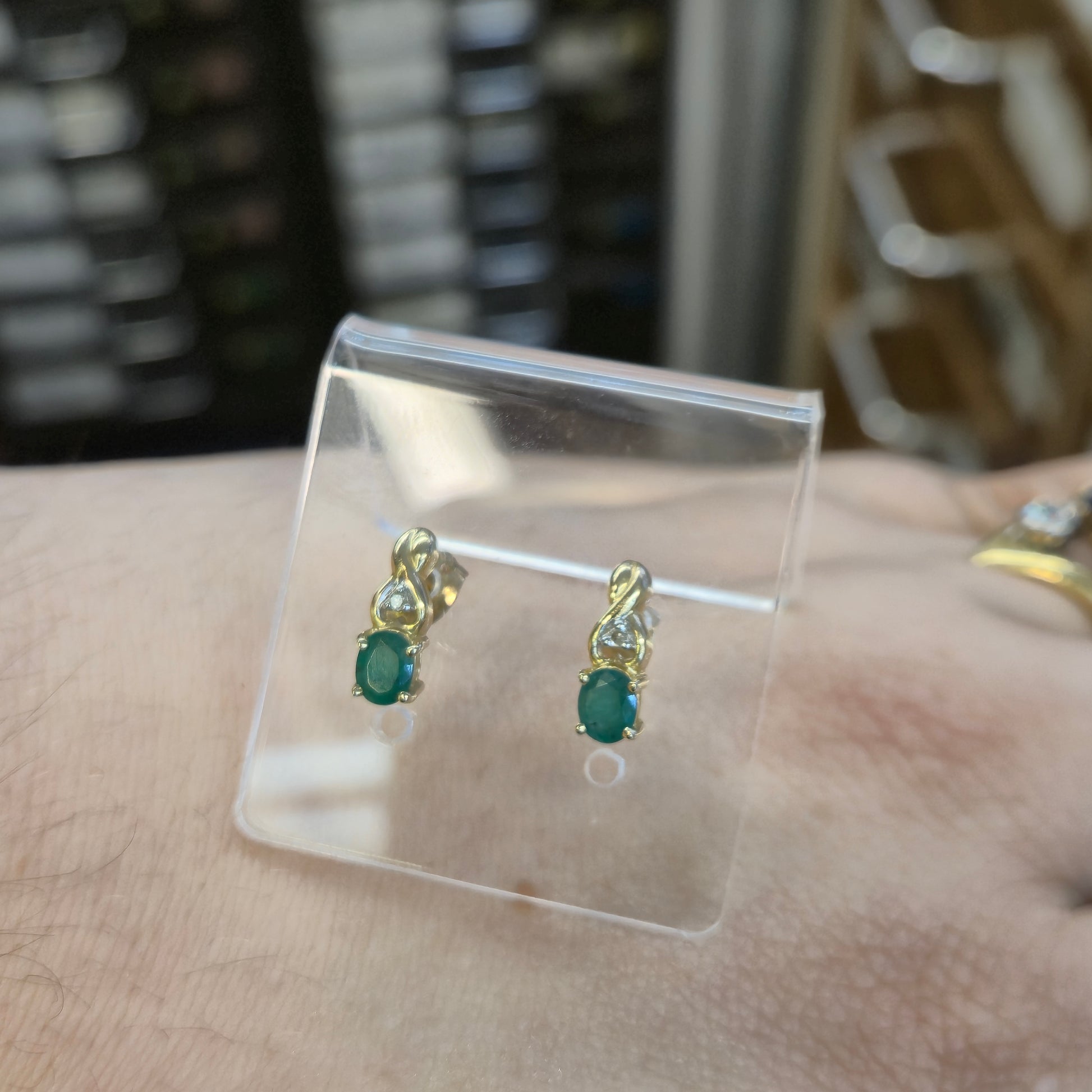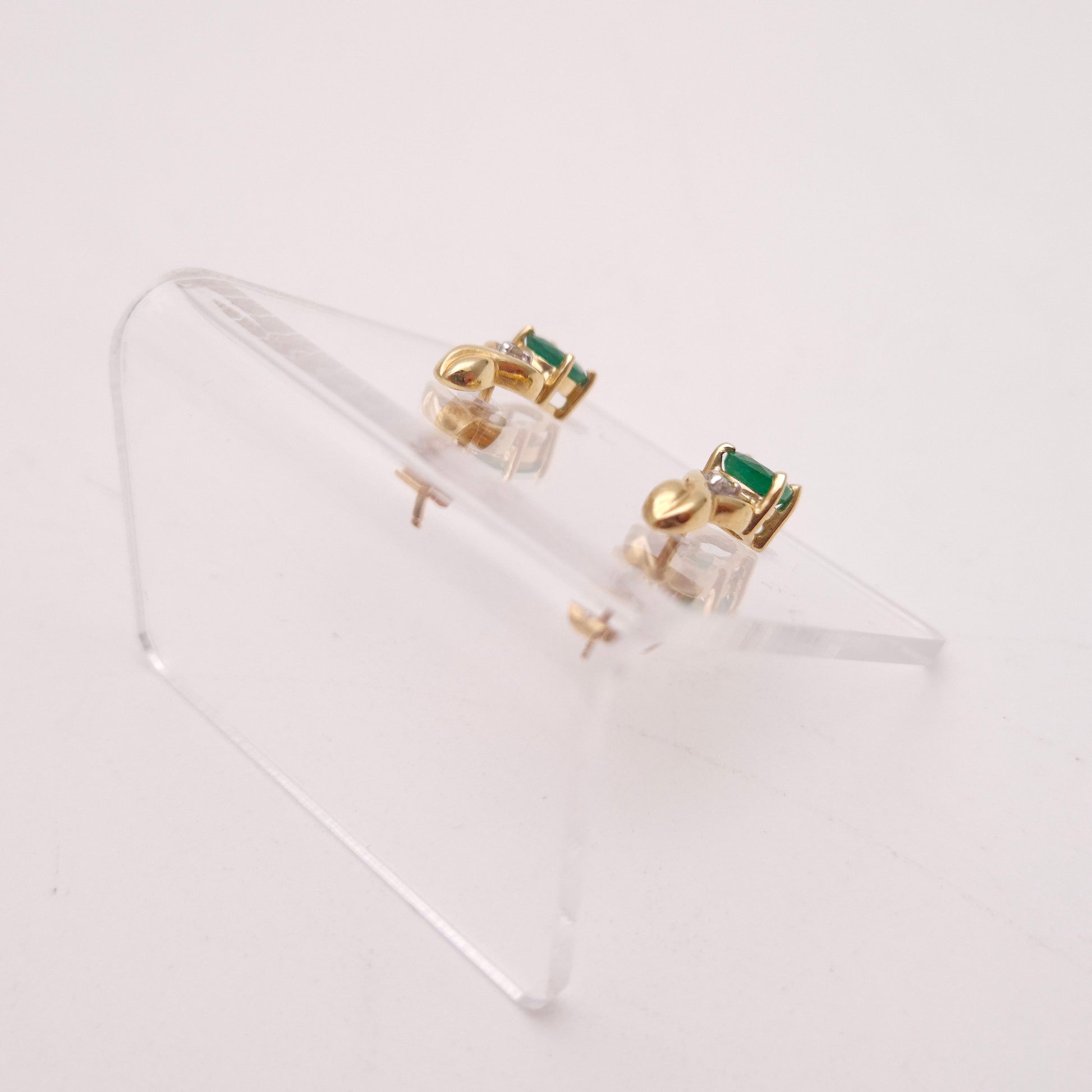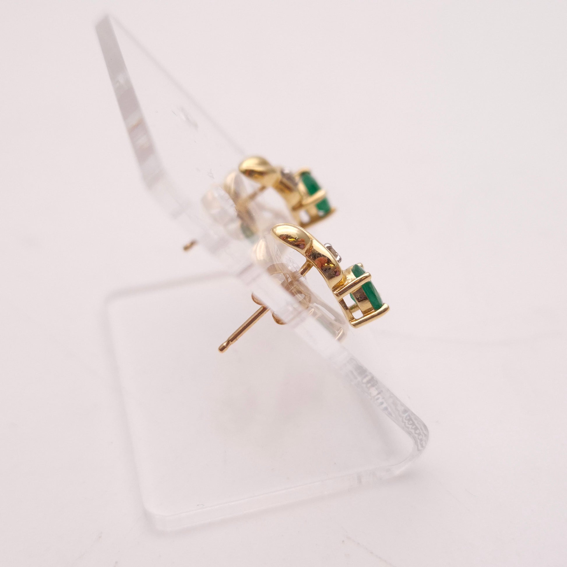The earrings are designed with the top portion of the earring features a stylized, curved, or twisted yellow gold design, which is set with a small, brilliant round-cut diamond that adds a touch of sparkle. Set gracefully below is a single, oval-cut emerald, known for its rich, deep green colour. The emerald is securely held in a classic claw setting, allowing light to pass through and highlight its natural brilliance.