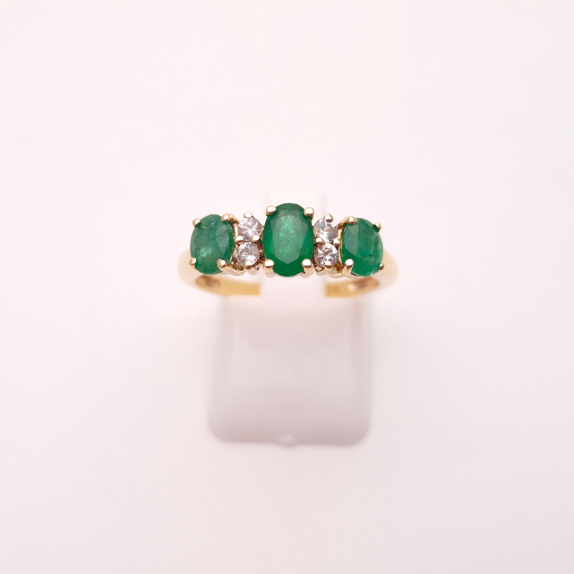 The design features a distinguished seven-stone row set across the top of the band. The row is composed of three vibrant oval-cut Emeralds, which are flanked and separated by two sets of two smaller, sparkling round white gemstones, the identity of the white stones has not been 100% confirmed but are believed to be white topaz. The alternating pattern and contrasting colours give the ring a lovely rhythm and brilliance.